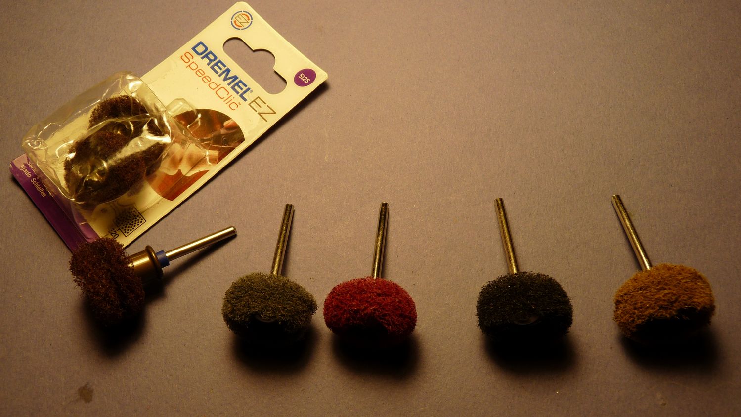Do zakamarków używam takich gąbek ściernych, cztery po prawej to chińskie gąbki dostępne na AliExpres o gradacji od 80 do 1000 o ile im wierzyć. Po lewej to Dremel, o gradacji 320 im dłużej używam tym gradacja staje się większa i gąbka jest delikatna i dociera w zakamarki.