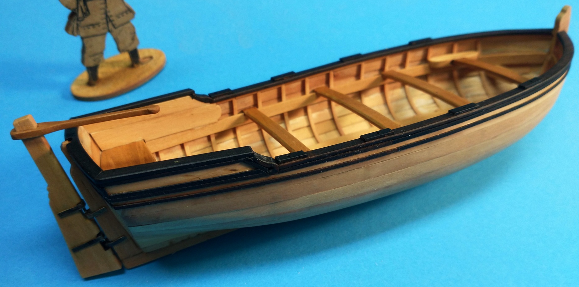 Po sklejeniu obu połówek, zacząłem wyklejać imitację wręg i wyposażyłem łódź we wszelkie detale.
