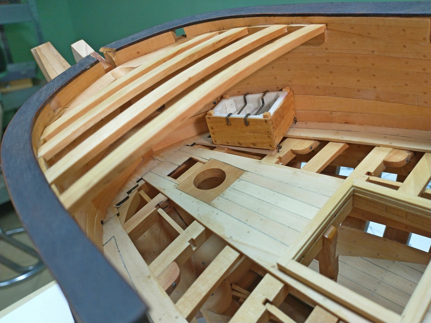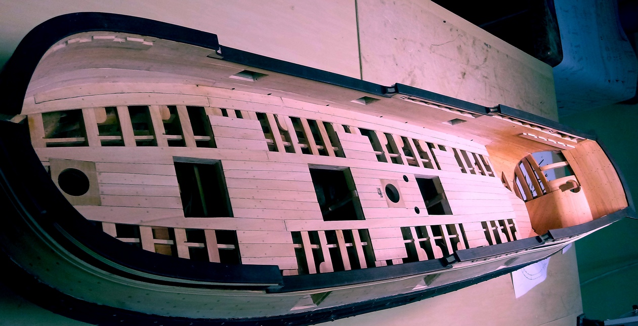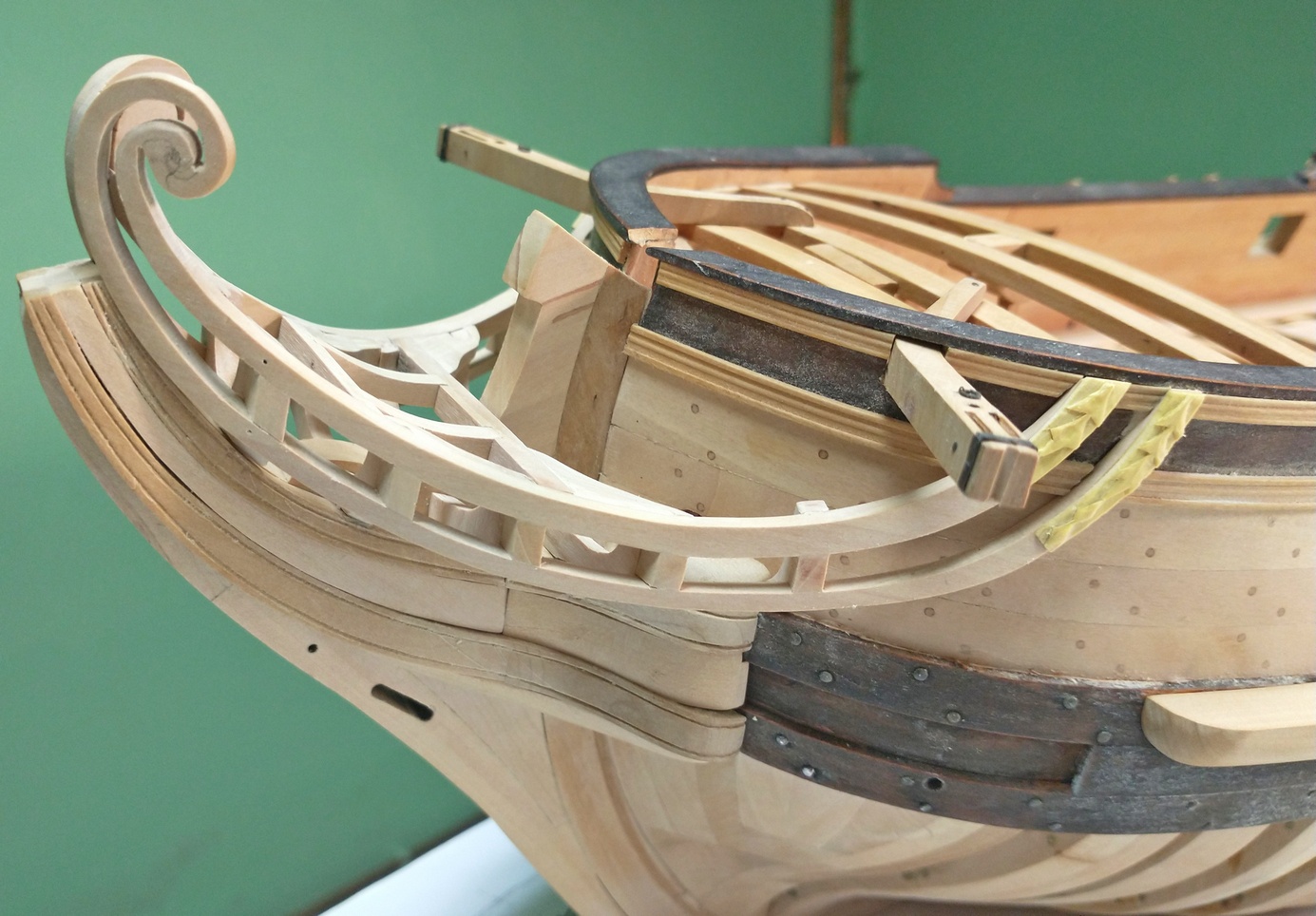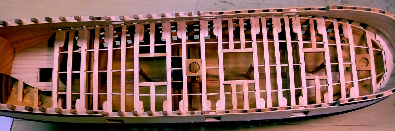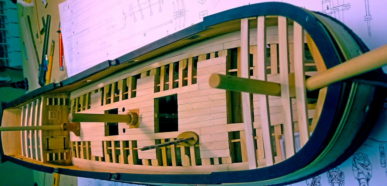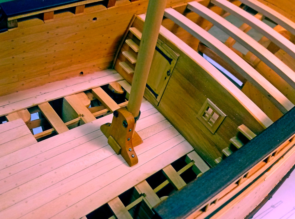 Trochę drobnicy przybyło; kabestan, ster wraz z rumplem i para przymasztowych kołkownic:Pokładniki na dziobie:Pokład na rufie:Obramowania luków: Widać jeszcze niewyschnięty pokost, za co przepraszam.