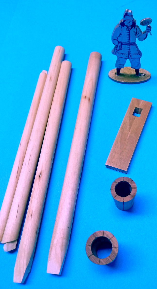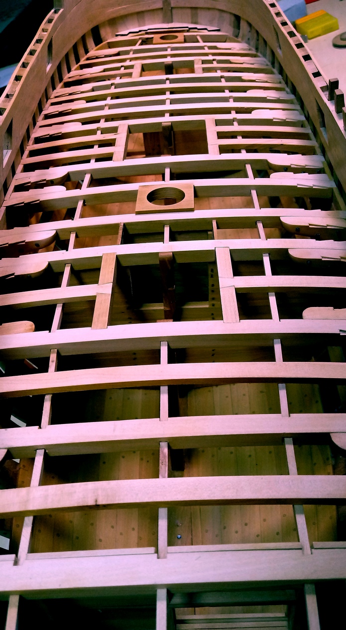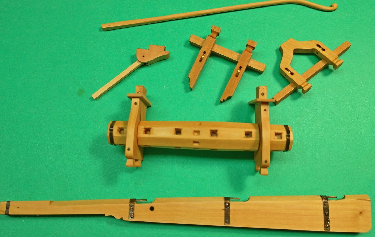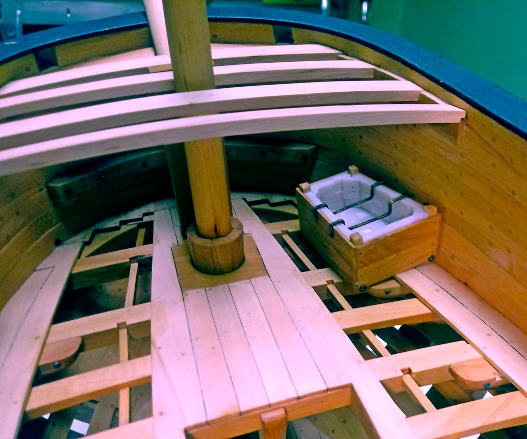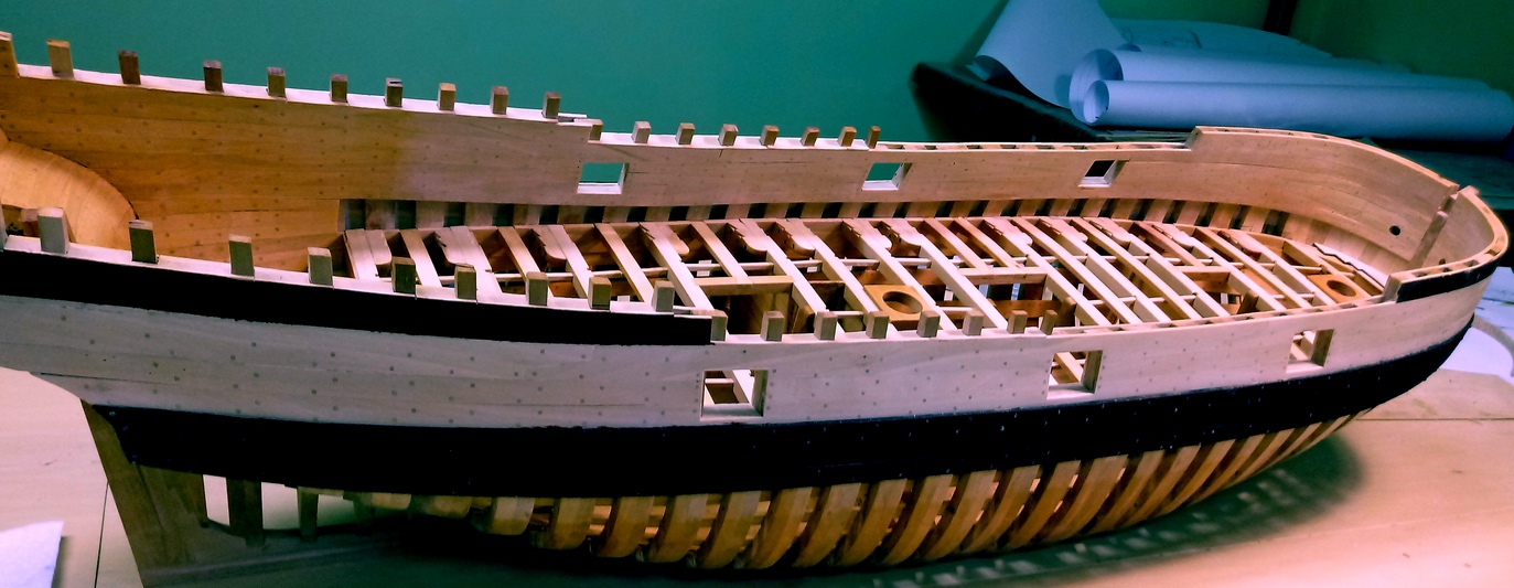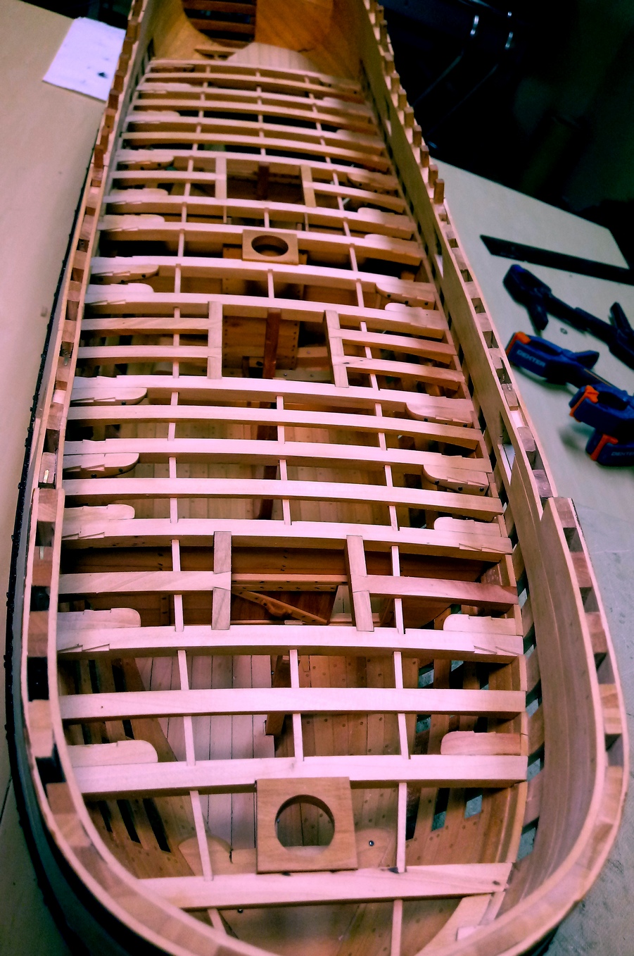 Trochę drobnicy przybyło; kabestan, ster wraz z rumplem i para przymasztowych kołkownic:Pokładniki na dziobie:Pokład na rufie:Obramowania luków: Widać jeszcze niewyschnięty pokost, za co przepraszam.
