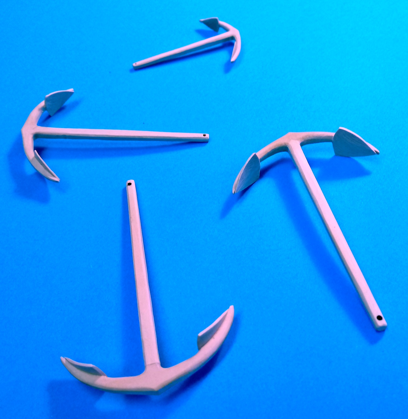 Kotwice wykonałem z gruszy.Wykonałem je już teraz, bo sądziłem, że jedną będę musiał zamontować pod pokładem, na tym etapie budowy. Ostatecznie zamontuję ją później.Pokleiłem całą więźbę pokładu głównego.Poszycie zewnętrzne też już jest.Przy klejeniu ław relingów, bardzo pomocne były "trytytki". Swoją drogą, ich wynalazca powinien dostać również od modelarzy jakąś nagrodę.