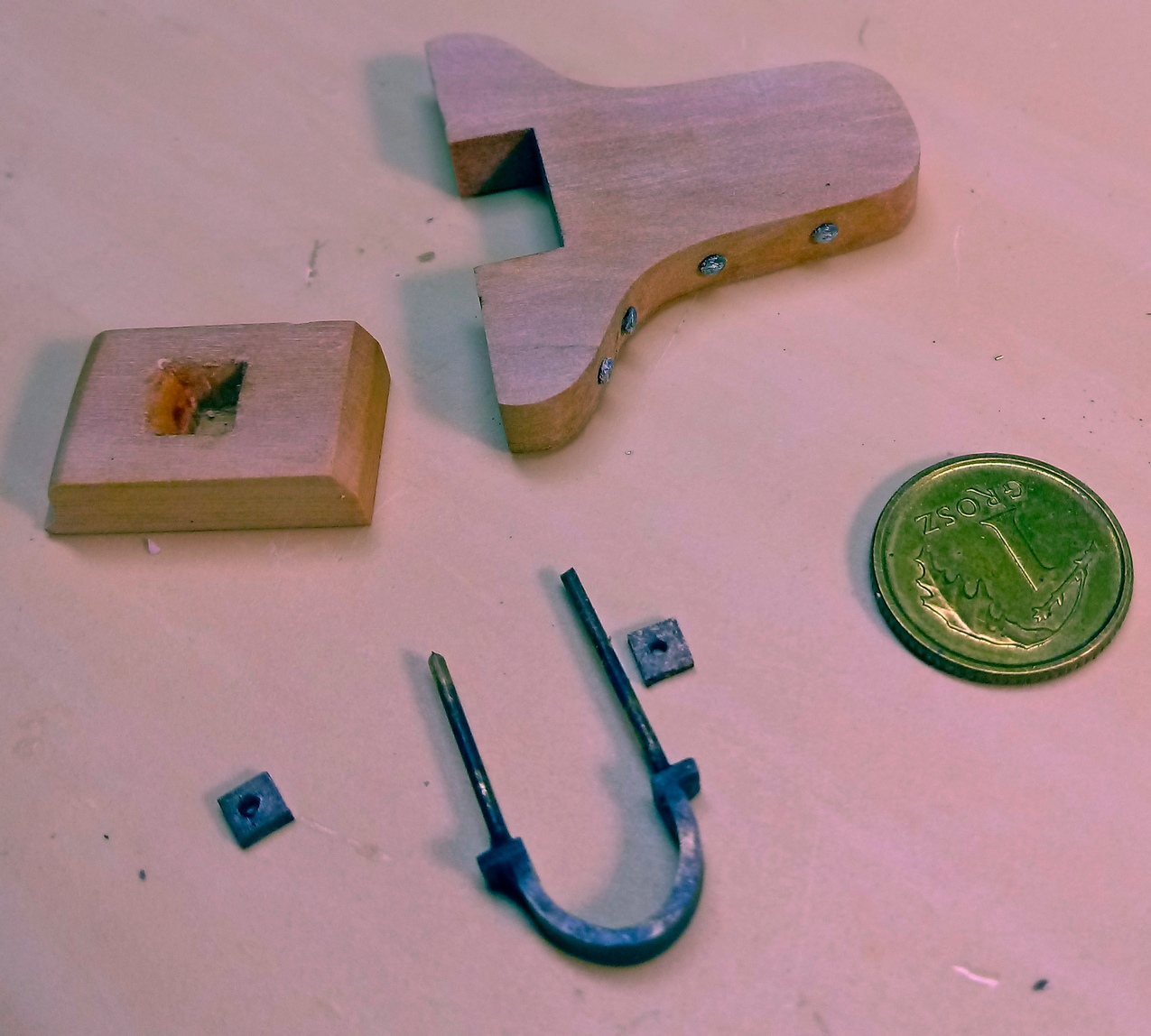 Maszty olchowe, wraz z mocowaniem.Z tych pasków powstaną cegły na wyściółkę paleniska. To rozwalcowana modelina, po utwardzeniu pocięta na paski. Taką modelinę można bardzo łatwo i precyzyjnie przecinać frezem na pilarce.Okucie do mocowania bezanmasztu.Po zlutowaniu.I wszystkie elementy podstawy bezana.Palenisko na miejscu. Oczywiście nie jest jeszcze umocowane, będę musiał chyba dołożyć parę klepek pokładu, by je zamocować.Bezanmaszt.Tak dziś wygląda model. Maszty i pokładniki są tylko wstawione do zdjęć.I na koniec prośba o pomoc. Chciałbym wzbogacić wnętrze kajuty kapitana, ale w planach jest tylko rzut z góry. Może ktoś ma bardziej szczegółowe rysunki z monografii lub z innych źródeł?