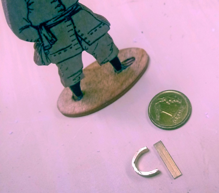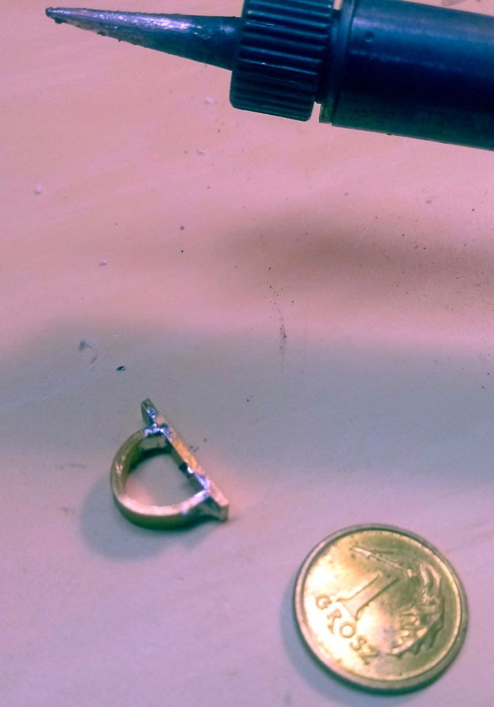 .Dlaczego najprostsze rozwiązania, najtrudniej przychodzą do głowy? Dzięki Adam. Przyłożona do galionu do zdjęcia:Może nie jest to jakiś szczególny wyczyn, ale i tak jestem zadowolony.Równolegle trwają prace w kuźni. To rozety na otwory odpływowe (szpigaty?) w kadłubie. Wykonałem je z rurki mosiężnej fi 3mm, rozpłaszczone na wiertarce i punktaku:I pewna ilość różnych oczek.