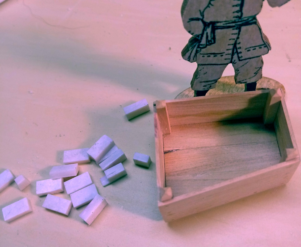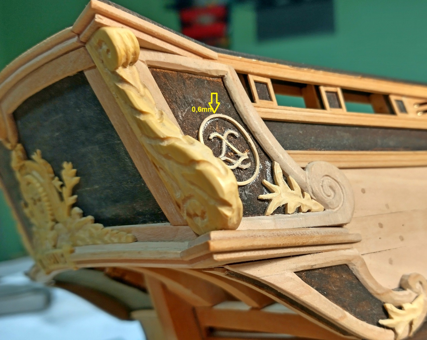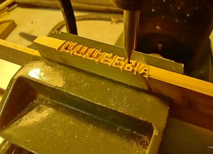 Przybywają kolejne elementy, tutaj kosz dziobowy. Jeszcze muszę chyba odchudzić te zawijasy na dziobie.Trapy burtowe:Zaczątek ornamentów:Oprócz nożyka, używam grawerki i kilku różnych końcówek:Tu frezowanie literek na deskę z nazwą okrętu:Po raz pierwszy pracuję z bukszpanem. Na początku trudno było się przyzwyczaić do jego twardości, ale w miarę zdobywania doświadczenia, efekty są coraz lepsze, a praca przyjemniejsza i szybsza