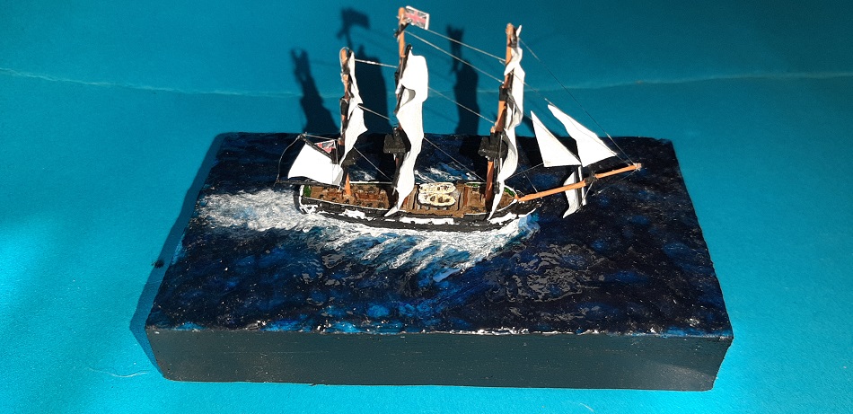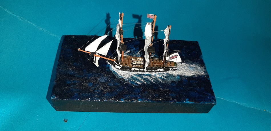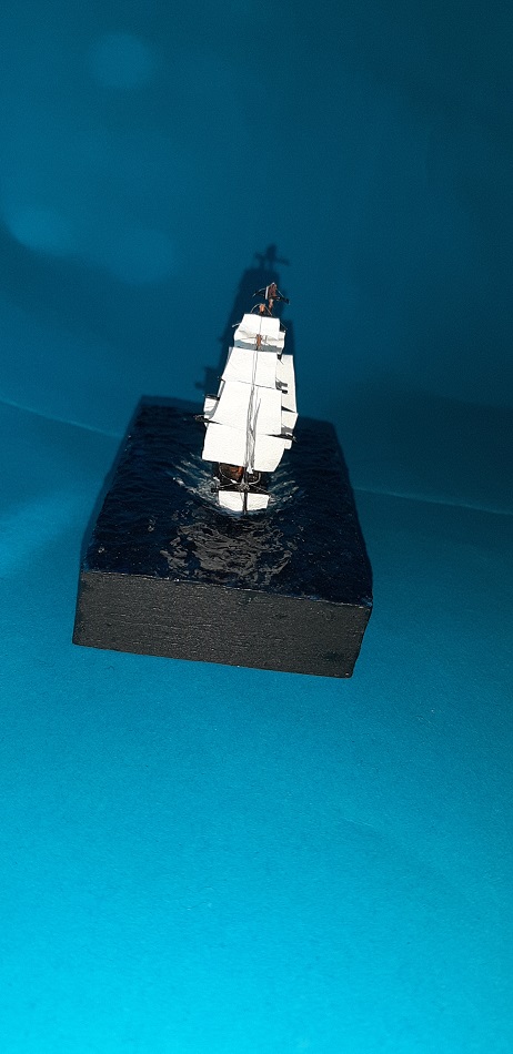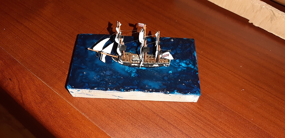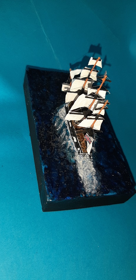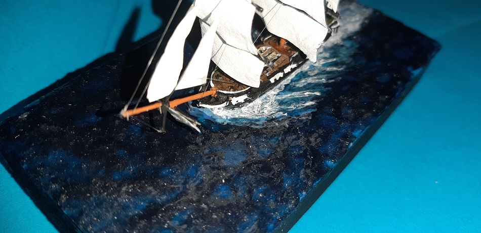 Wydaje mi się, że ciut przesadziłem z falami, model tak jak by za szybko płynął, ale zważywszy na to, że jest to pierwsza tego typu dioramka to wydaje mi się, że tragedii nie ma.