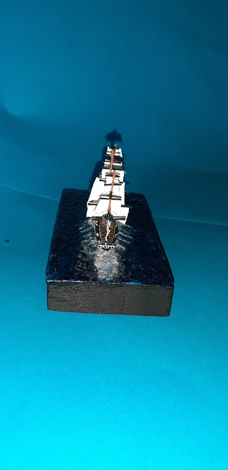 Wydaje mi się, że ciut przesadziłem z falami, model tak jak by za szybko płynął, ale zważywszy na to, że jest to pierwsza tego typu dioramka to wydaje mi się, że tragedii nie ma.