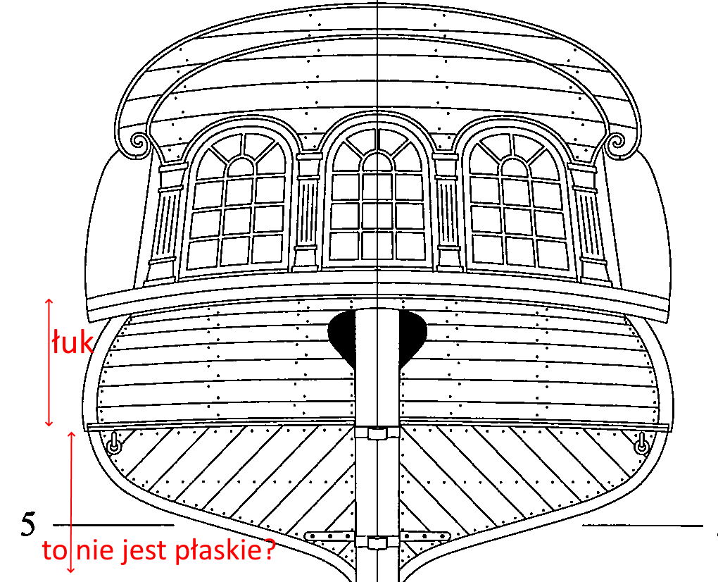 I na pewno "lustro" pawęży nie było płaskie (co błędnie zaznaczyłeś zieloną czcionką na rys.)- to nie ten okres budowy okrętów. Jak zerkniesz na rysunki wodnic kadłuba w części rufowej to problem Ci się wyjaśni.