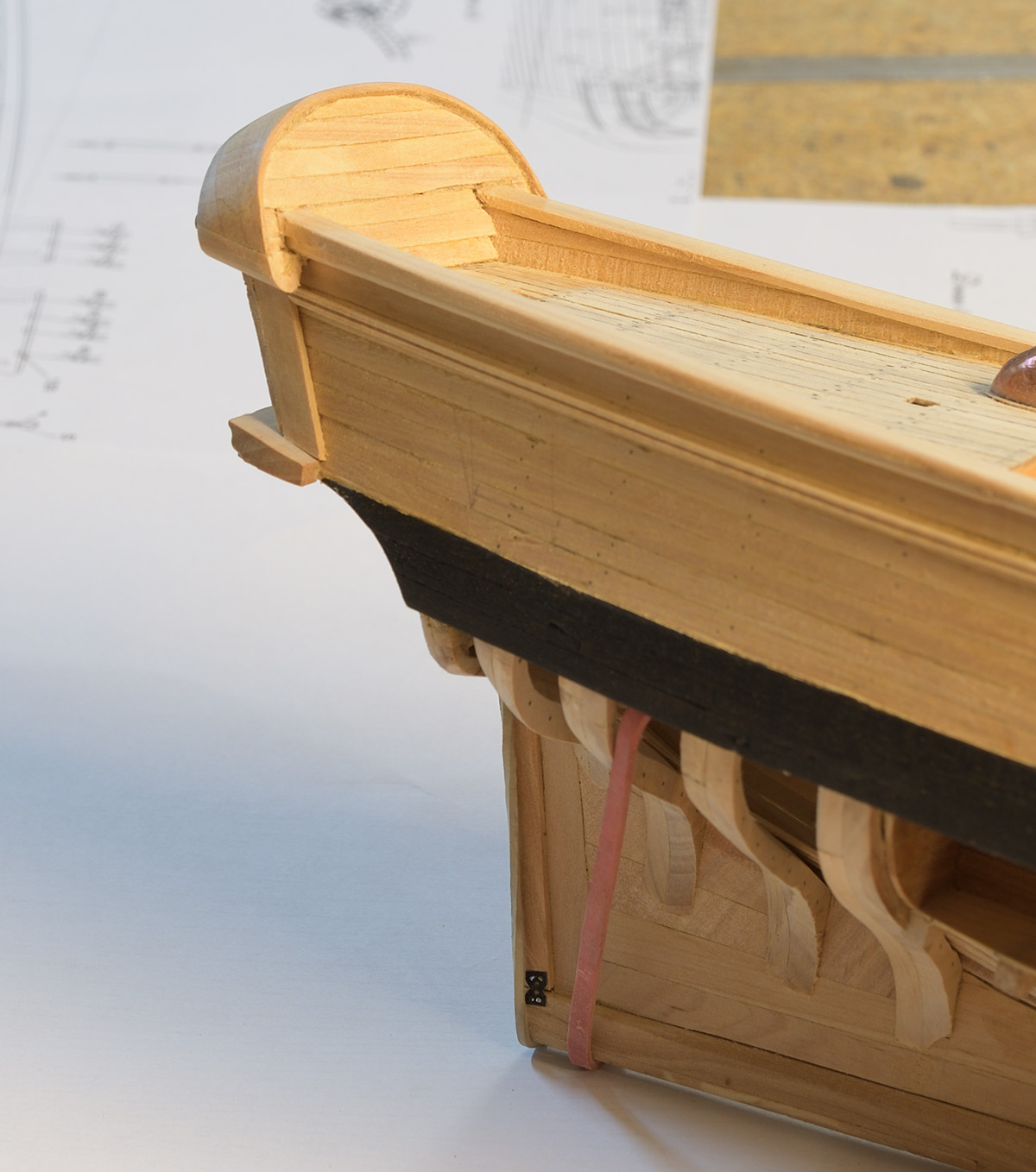 Nie mogłem się doczekać, aby zobaczyć docelowy kolor użytego drewna (olcha, głóg, kawałek egzotyka) i kilka elementów pomalowałem olejem. Trwa montaż burt. Tutaj trochę czasu minie, jest bowiem sporo drobnych akcesoriów, a i samo poszycie jest czasochłonne (1 planka dziennie)
