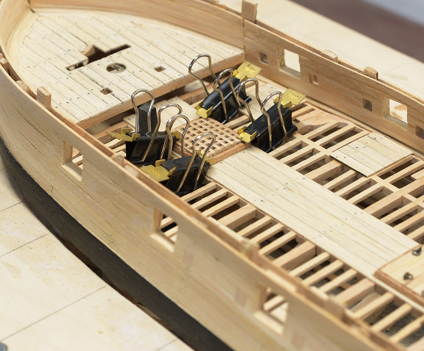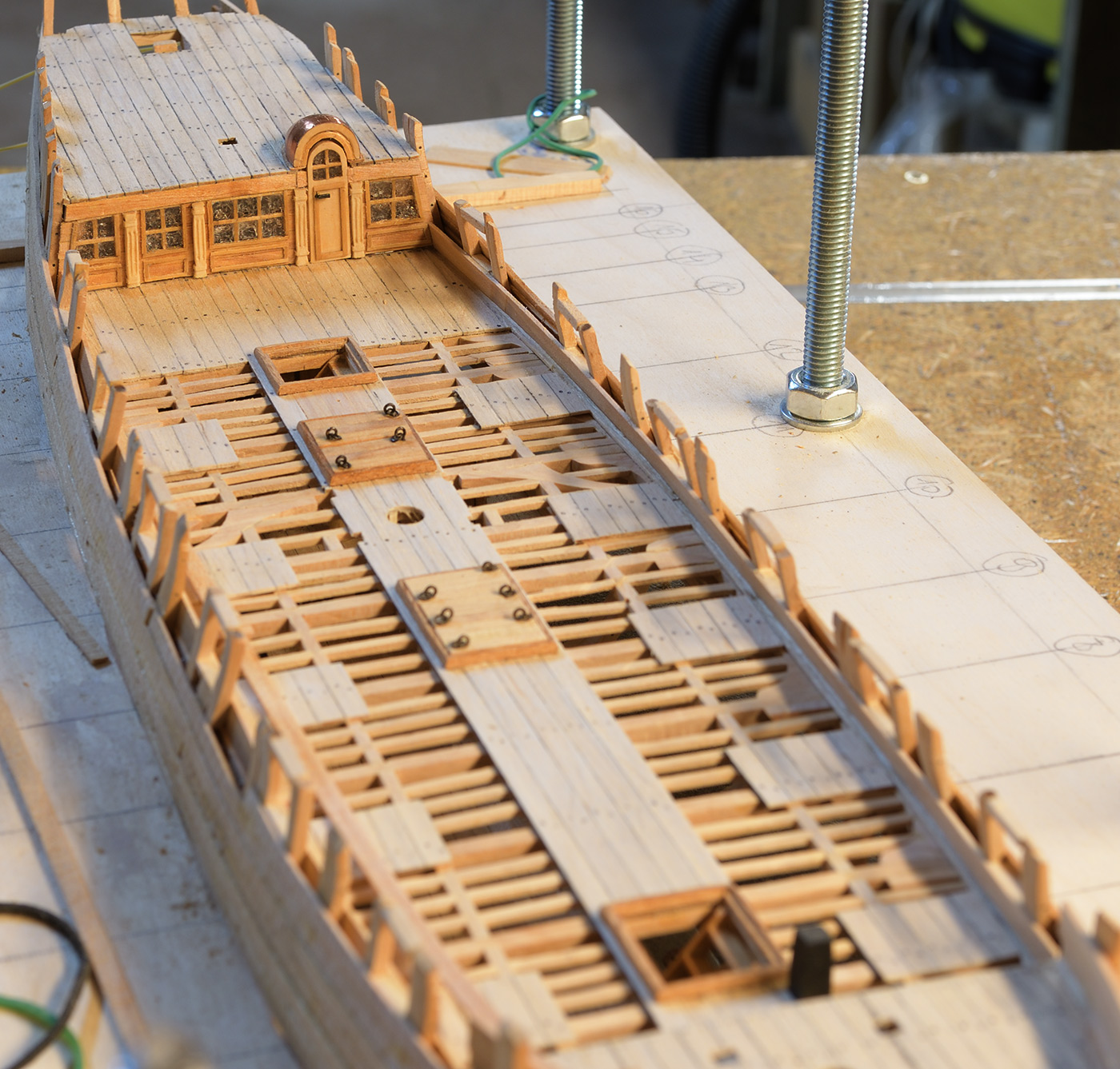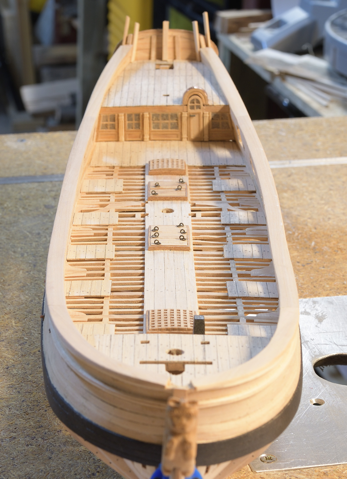 Pokładniki wyszły Ci zawodowo, wszystko dokładnie spasowane. Jeśli chodzi o szyby, to ja też dużo testowałem. Kupiłem nawet jakieś dwuskładnikowe szkło w płynie, ale po wykonaniu próbki, czekałem tydzień aż się utwardzi i niestety się nie utwardziło. Producent pisze że proporcja musi być bardzo dokładna, to chyba trzeba by było mieć wagę na mikrogramy :-) Potem użyłem szkła w płynie (budowlanego), stwardniało bardzo fajnie, było super transparentne, ale też super kruche. Skończyło się na podklejeniu okien od wewnętrznej strony galerii rufowej plastikiem z okładki do bindownicy. Powiem, że wygląda to bardzo fajnie. Bałem się, że będzie to widoczne od wewnątrz, ale nie widać tego zupełnie. Szklenie drzwi w ściankach pod forecastle, robiłem też z tej folii, ale szprosy dawałem po obu stronach.
