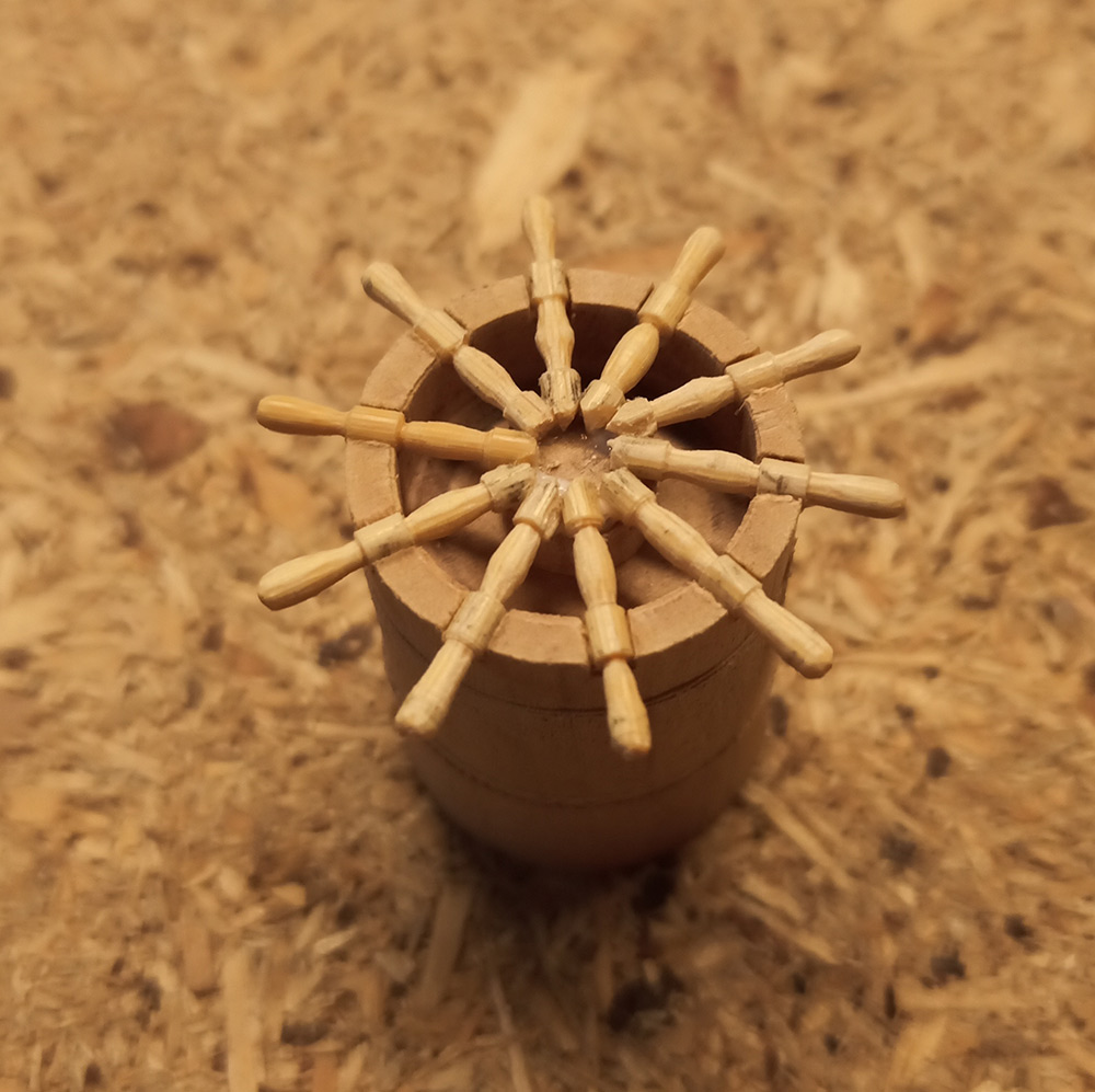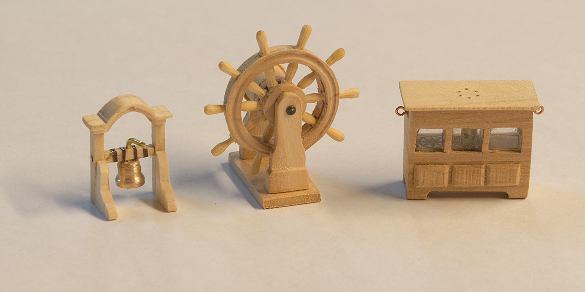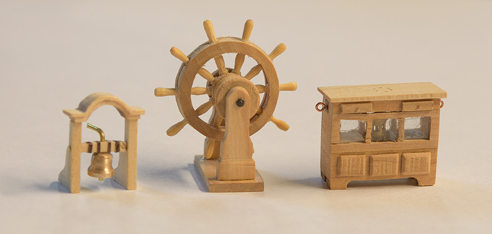 Z akcesoriów skończyłem dzwonniczkę, koło sterowe i szafkę na kompas. Koło sterowe metodą jak u Kazka czy Rafała, uchwyty toczone z wykałaczek wg wzornika podobnego do nagli (posty wcześniejsze)