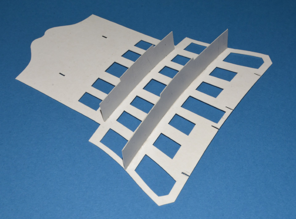 Zanim dojdzie do mnie, że to nie ma sensu rozrysowałem i wyciąłem elementy na próbny szkielet z cienkiego kartonu (grubości brystolu) podklejonym i usztywnionym w miejscach newralgicznych. Celowo nie użyłem grubego kartonu, żeby nie skończyło się jak ostatnio ;)