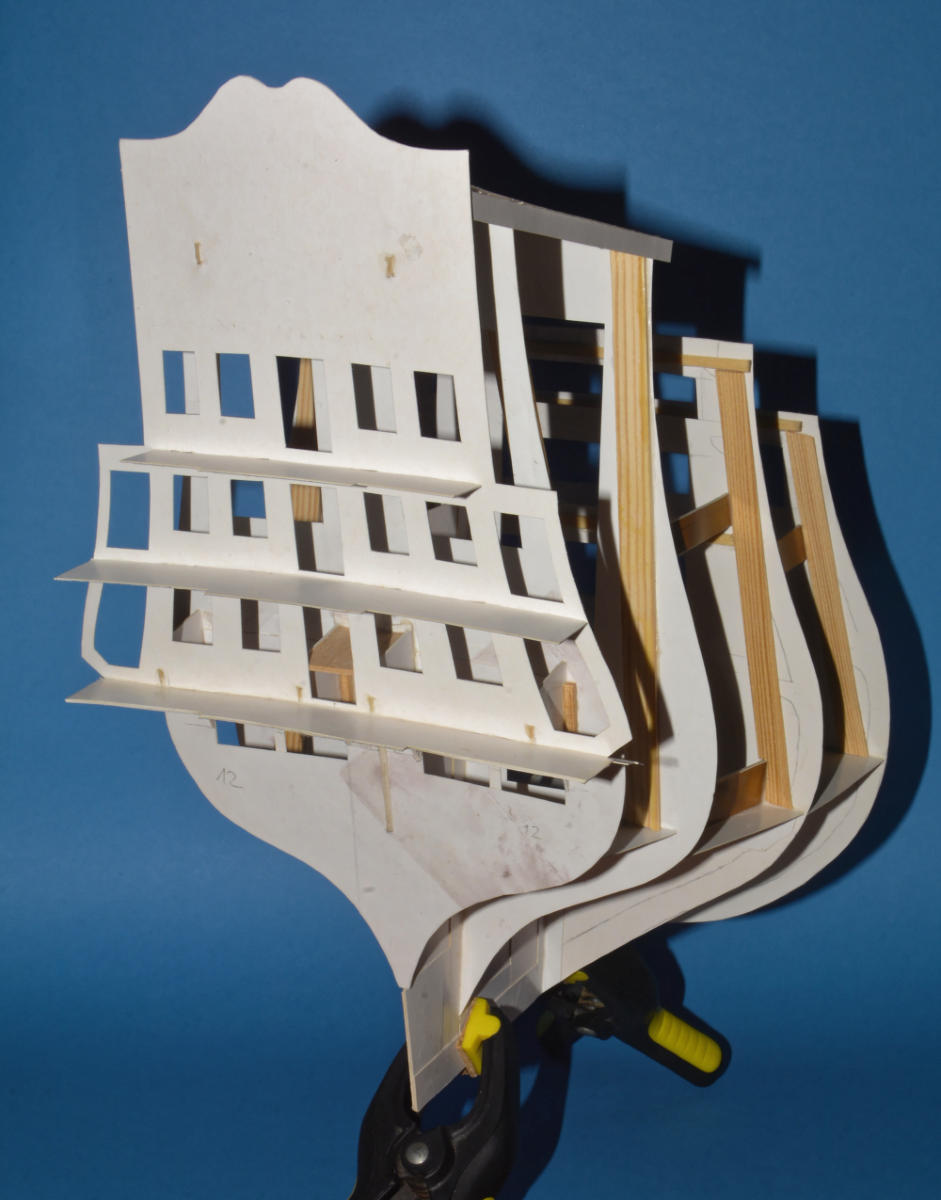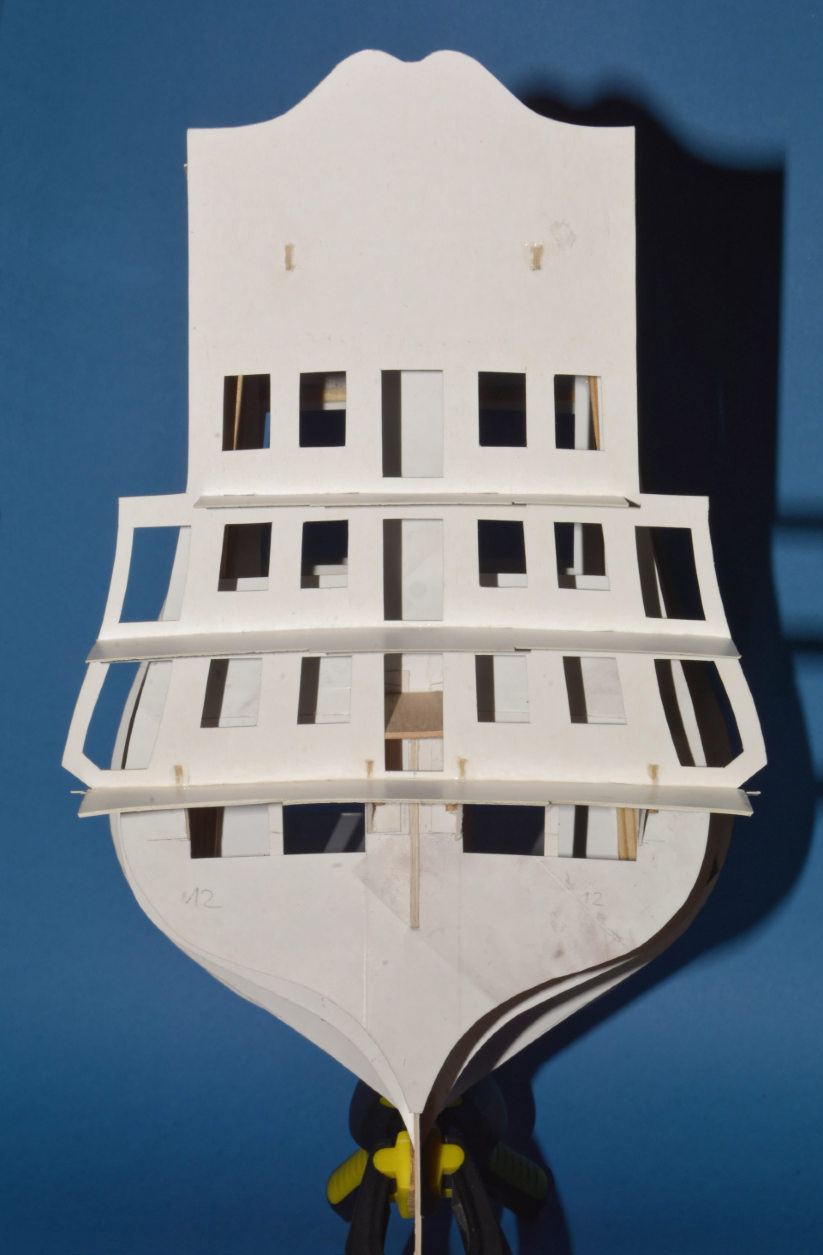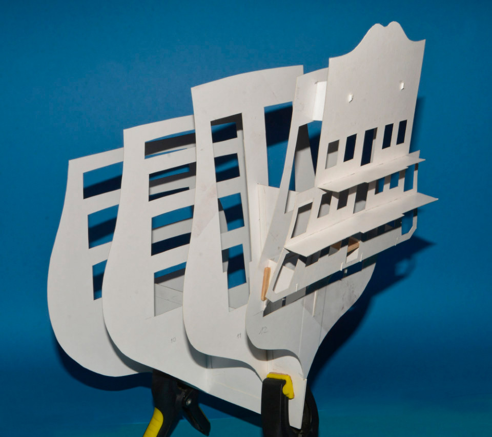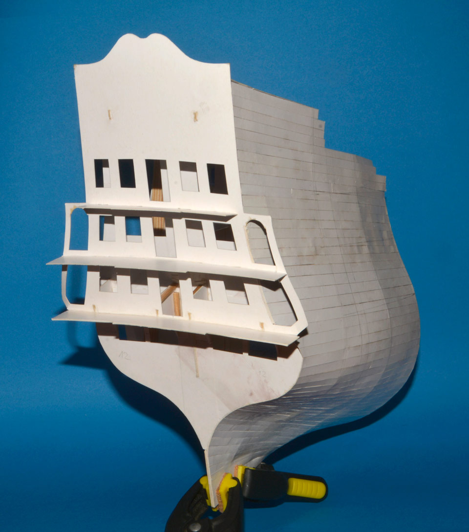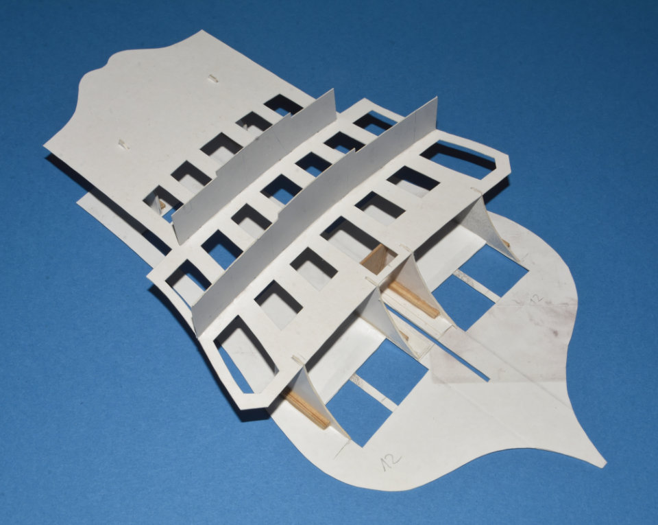 Wręgi podkleiłem listewkami, dodatkowo dla utrzymania odległości wkleiłem kartonowe dystanse, dolny pokład, dalej pokład rufówki i dolny balkon na pawęży.