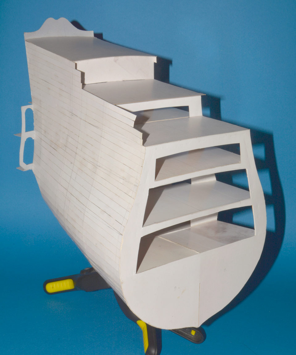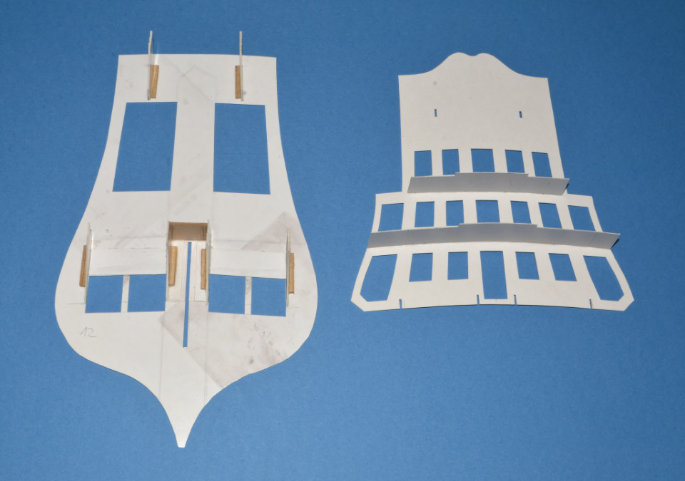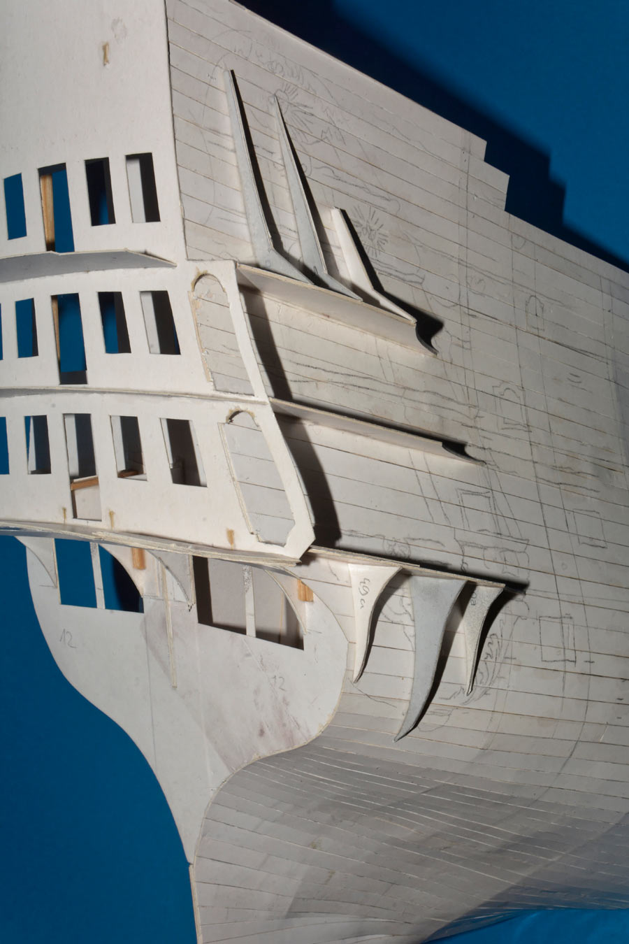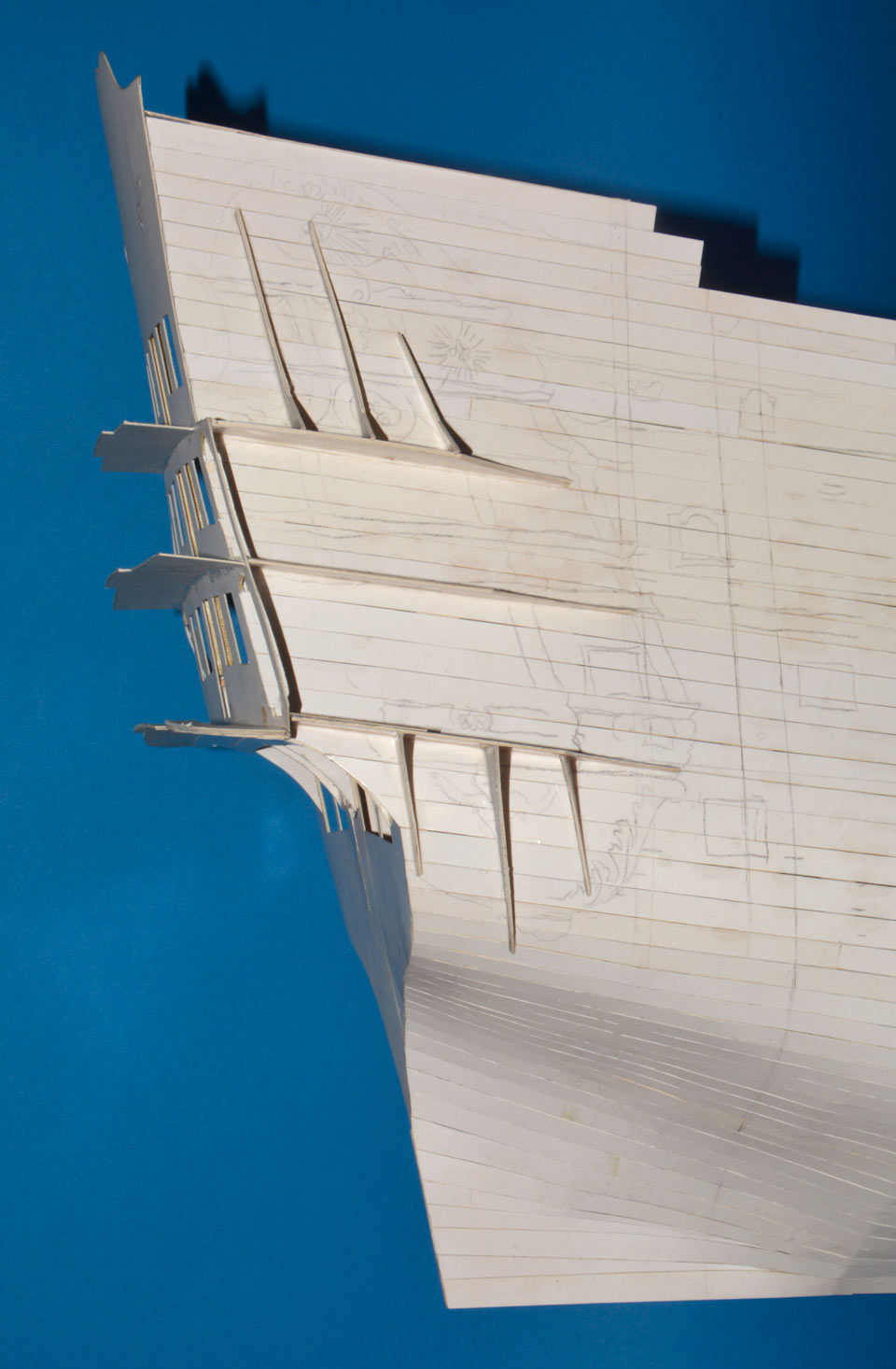 Wręgi podkleiłem listewkami, dodatkowo dla utrzymania odległości wkleiłem kartonowe dystanse, dolny pokład, dalej pokład rufówki i dolny balkon na pawęży.
