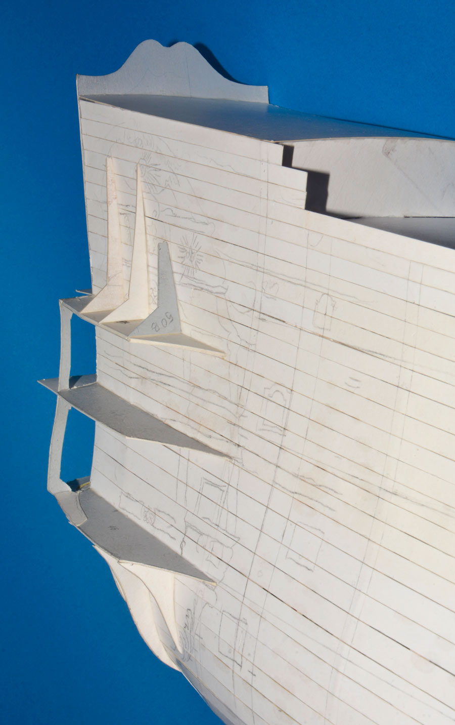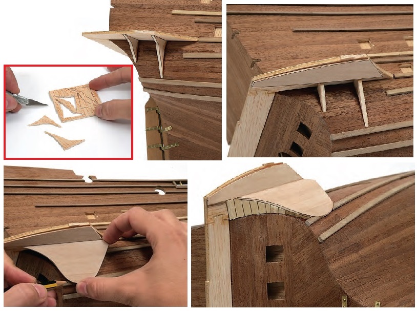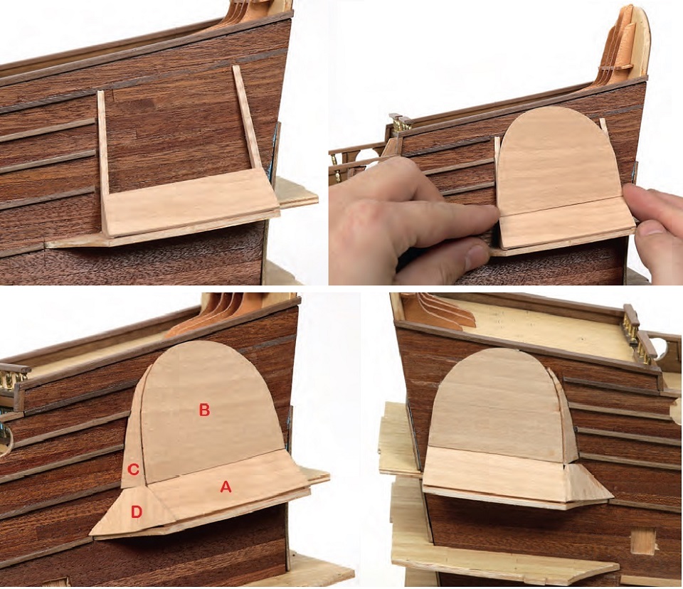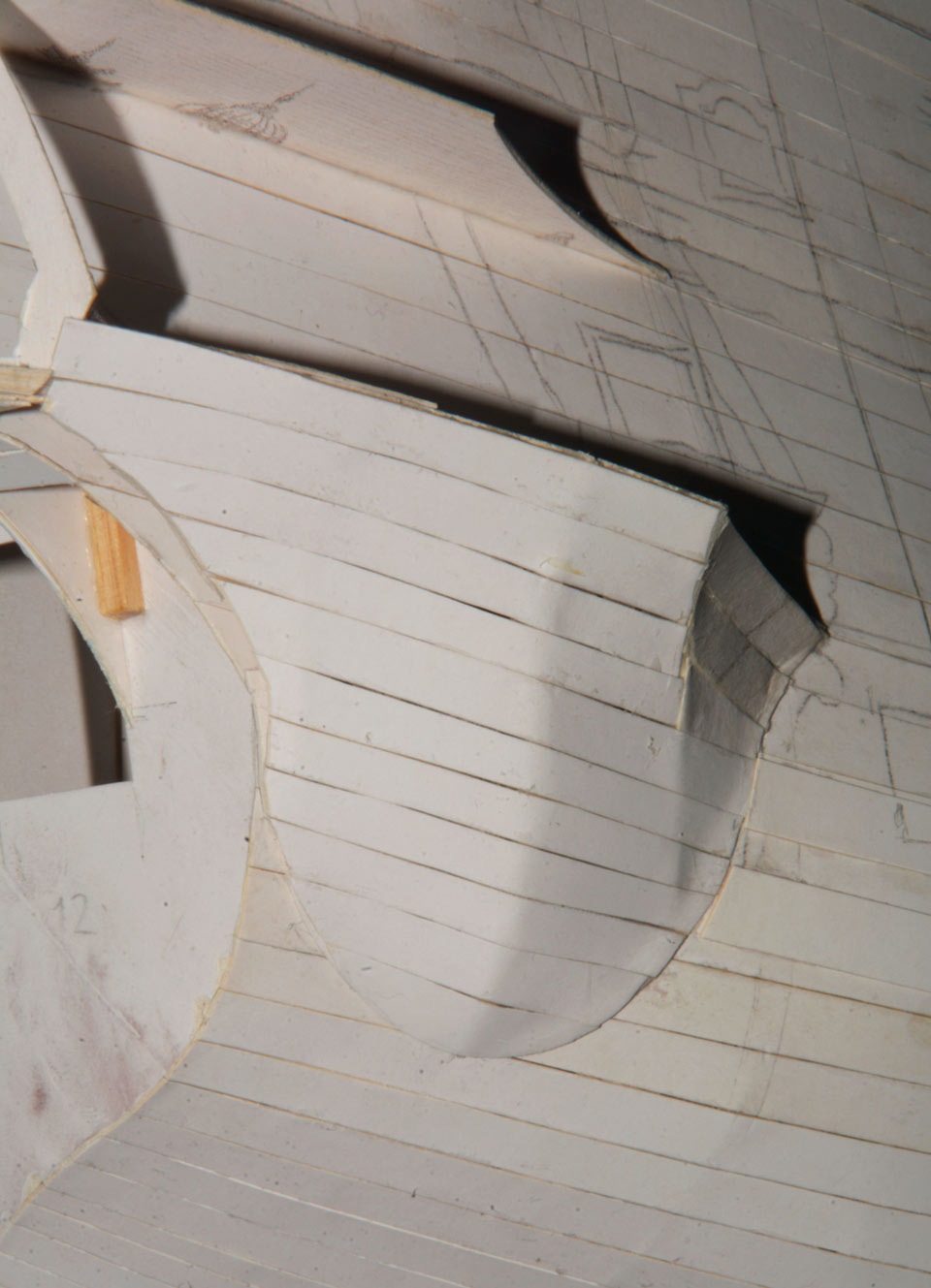 Wręgi podkleiłem listewkami, dodatkowo dla utrzymania odległości wkleiłem kartonowe dystanse, dolny pokład, dalej pokład rufówki i dolny balkon na pawęży.