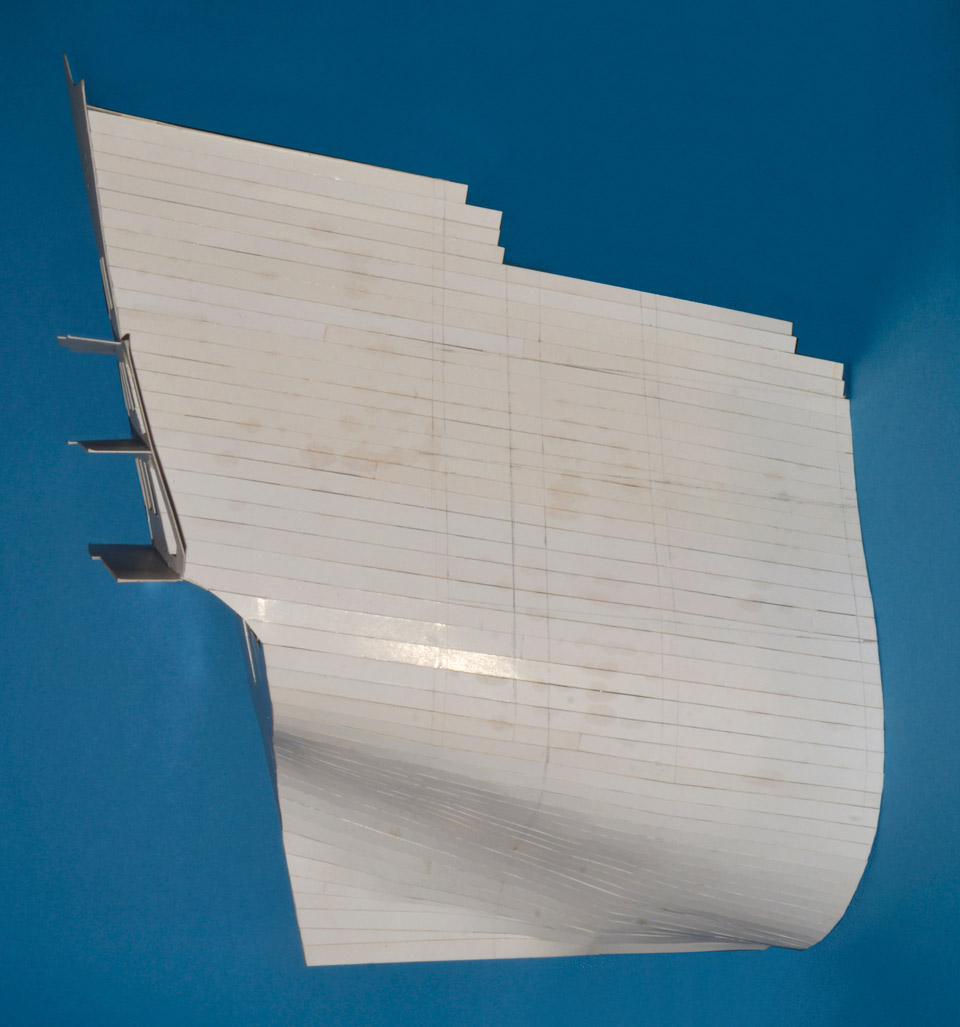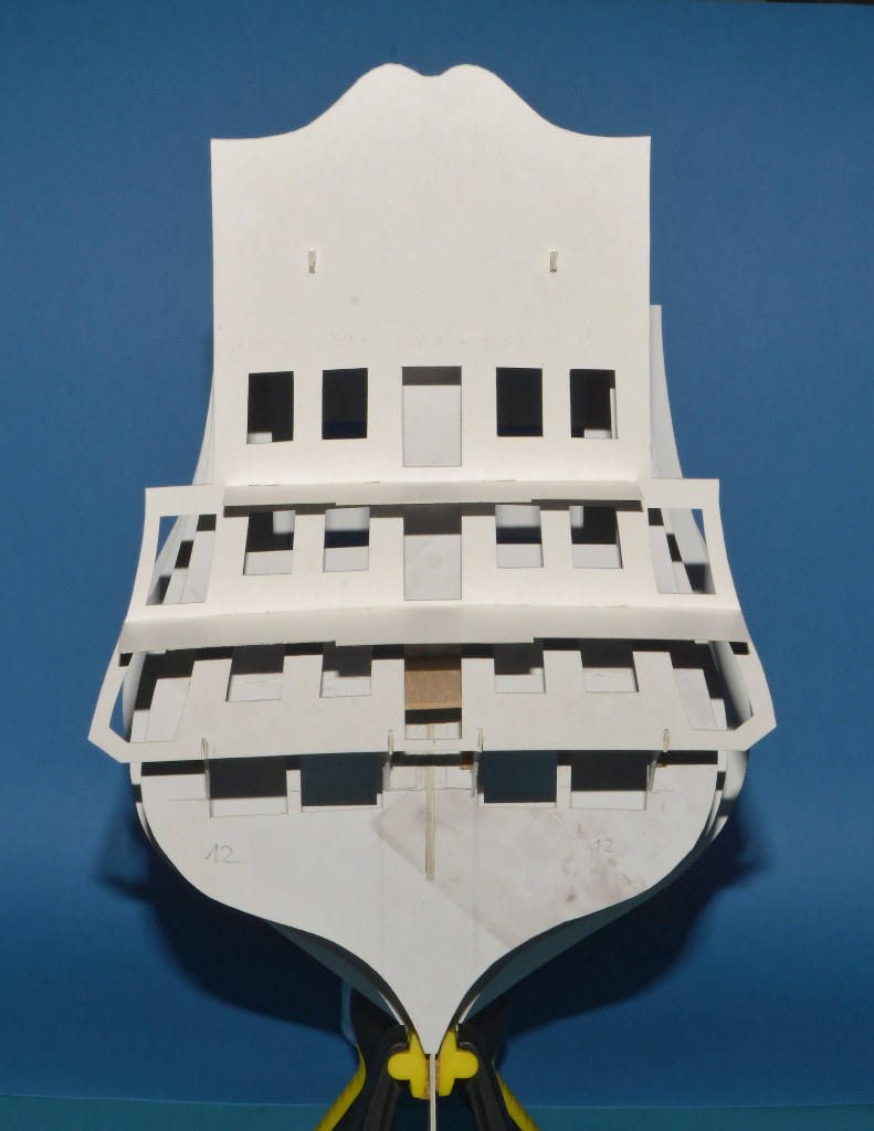Dzięki poszerzonej wiedzy o zestawy Sergal i plastikowy Hellera moje owrężenie będzie się różniło od tego z kolekcji. W kolekcji ostatnia wręga (13 - pawęż) jest pełna, ja w mojej pawęży, podstawie galerii rufowej wytnę otwory na okna i drzwi, ponadto będzie szła po łuku tak jak robiłem w Ambitieux czy Santisima Trinidad. Trochę to komplikuje, bo balkonom i pokładom też trzeba będzie nadać łuki.