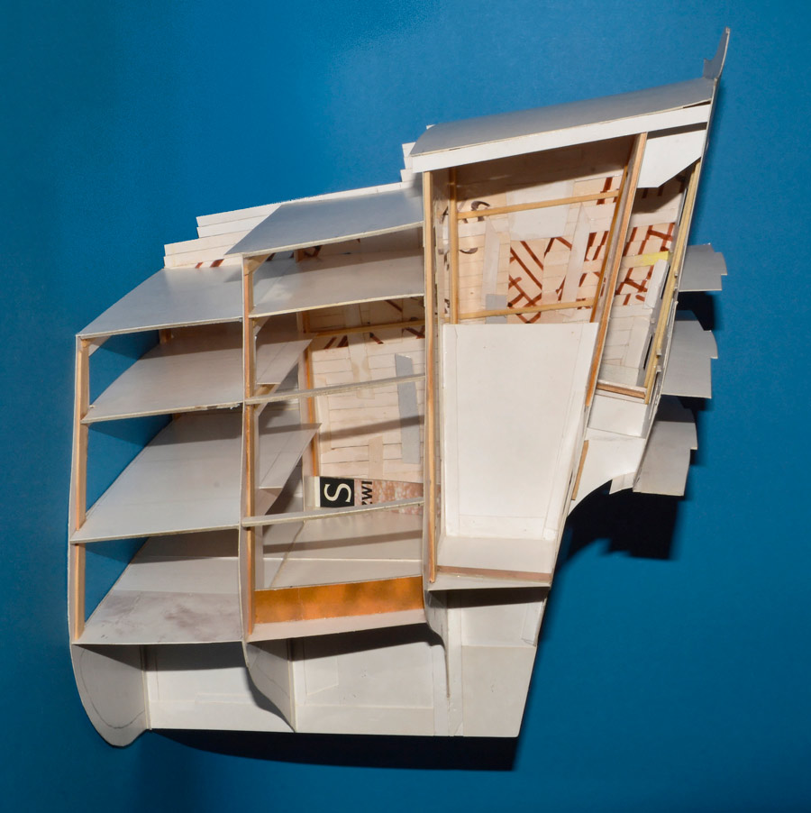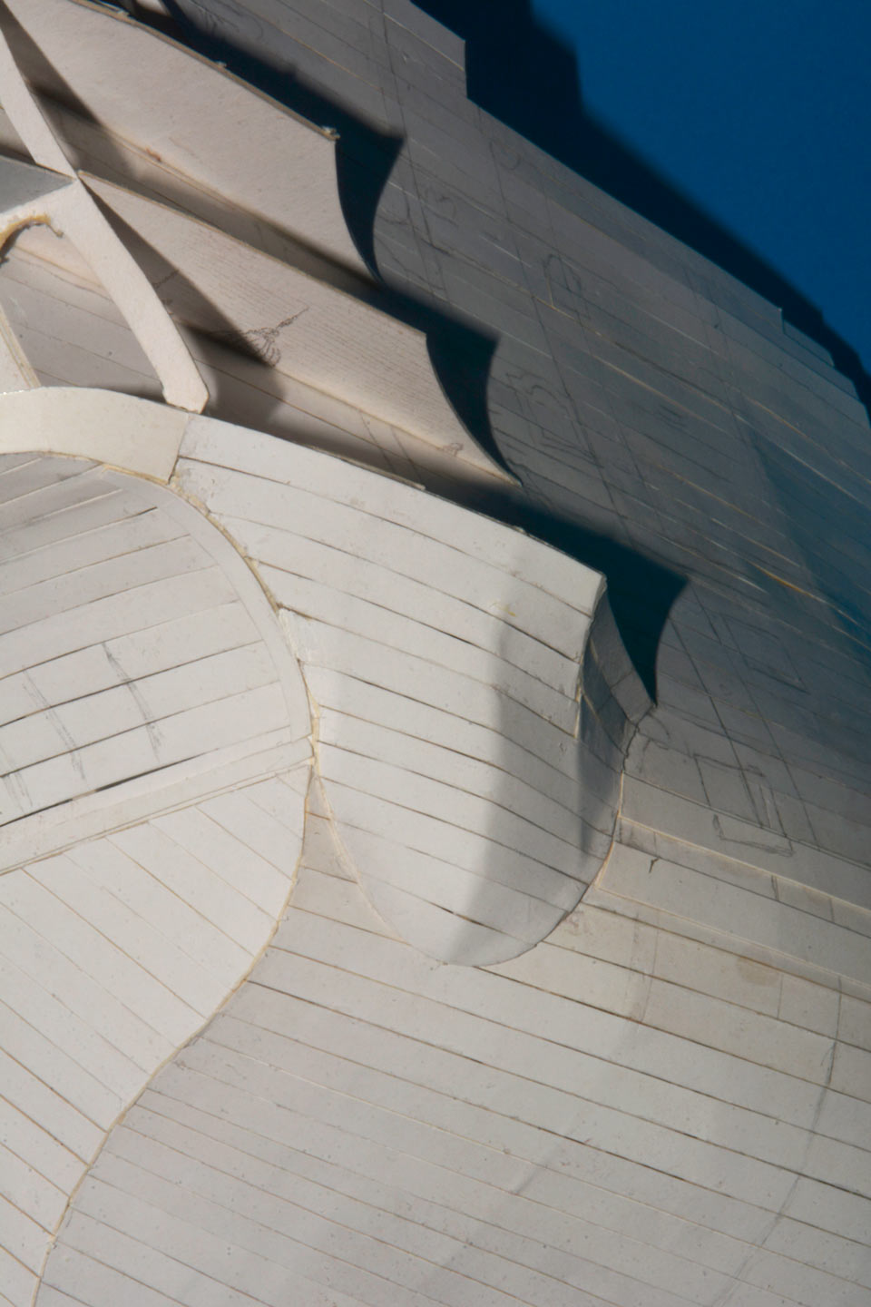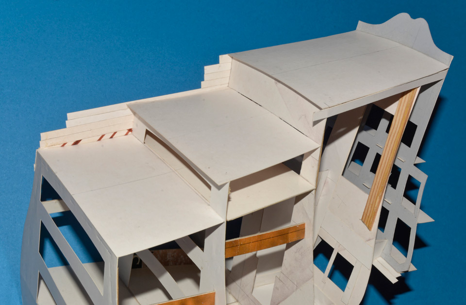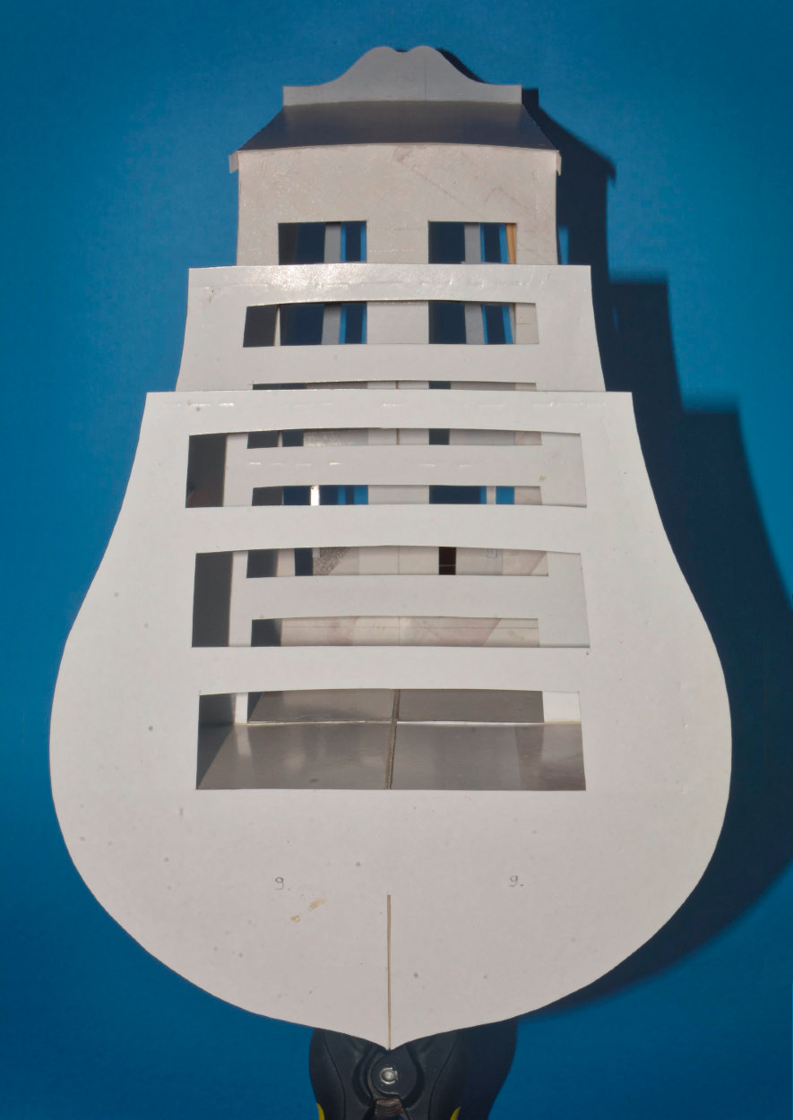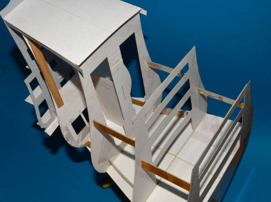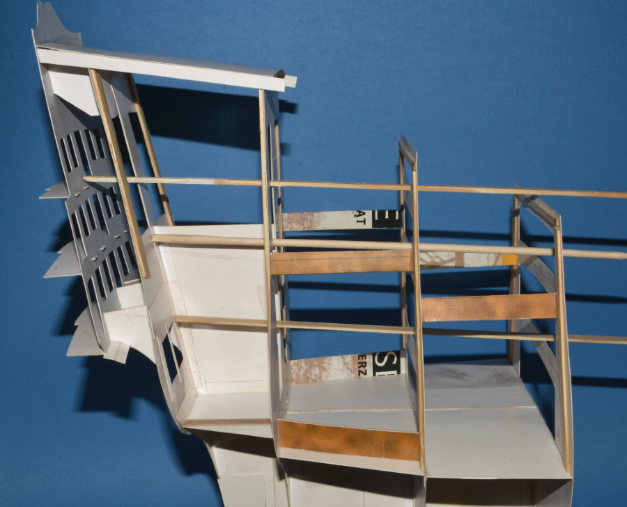 Górny balkon kajuty kapitańskiej. Część środkowa jest wysunięta (tak czytam na modelu Tanneron) o grubość drewienka zapałki.