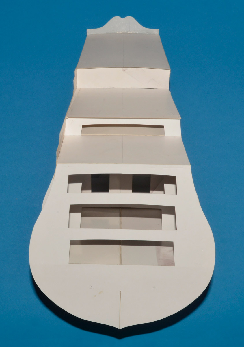 Model z kolekcji ma pięć okien (przychylam się do tej wersji), co sugeruje, że ornament jest wzorowany na rufie Tannerona.