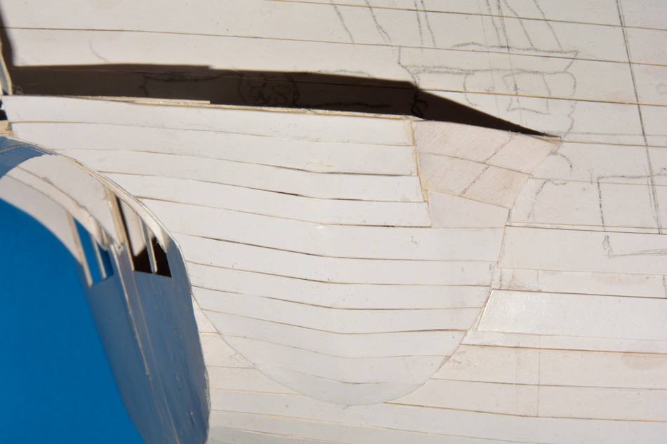 Poszyłem całą sterburtę (na oble i części dennej paski poszycia zwężałem ku pawęży, na dejwudzie odwrotnie), zaznaczyłem wręgi i wstępnie określiłem grubość sekcji - dwie linie pionowe po środku +/- pół centymetra.