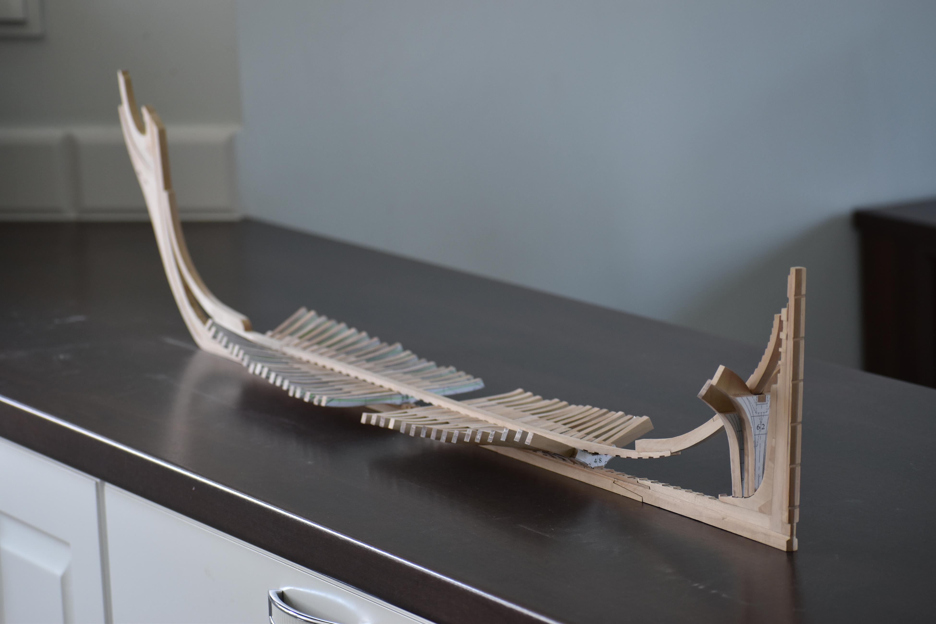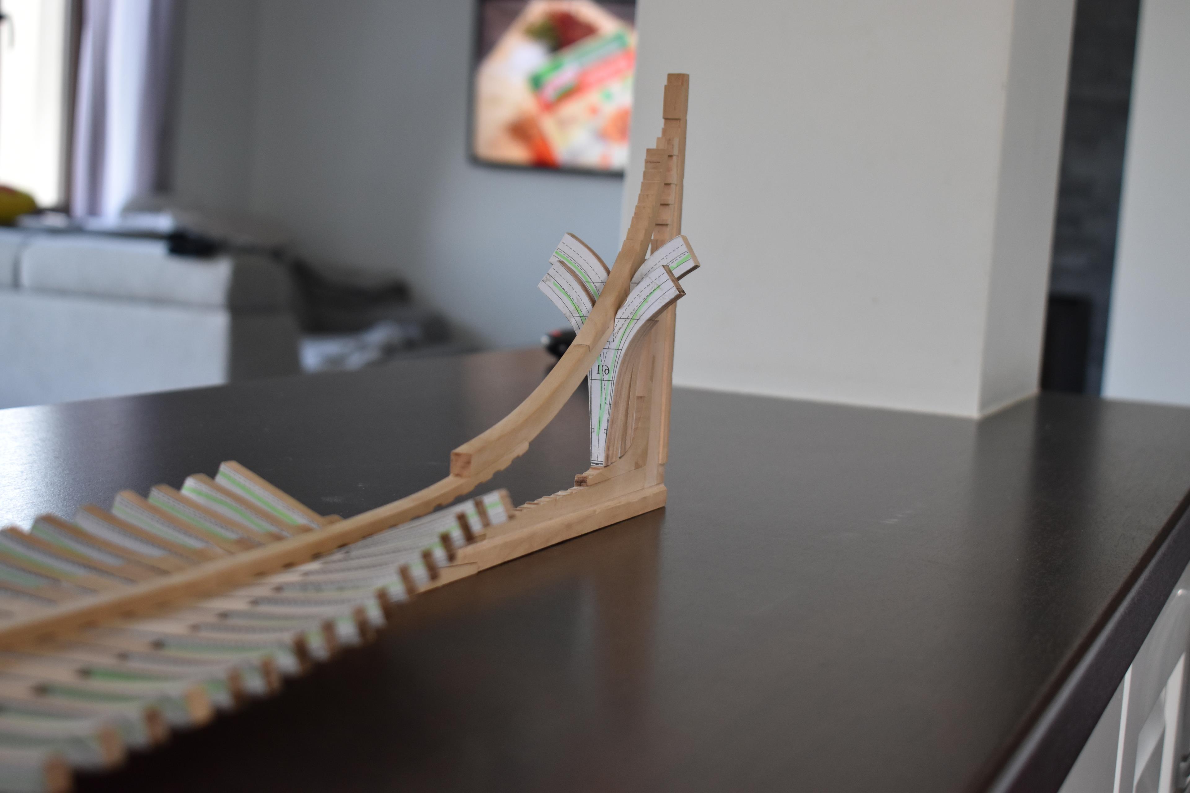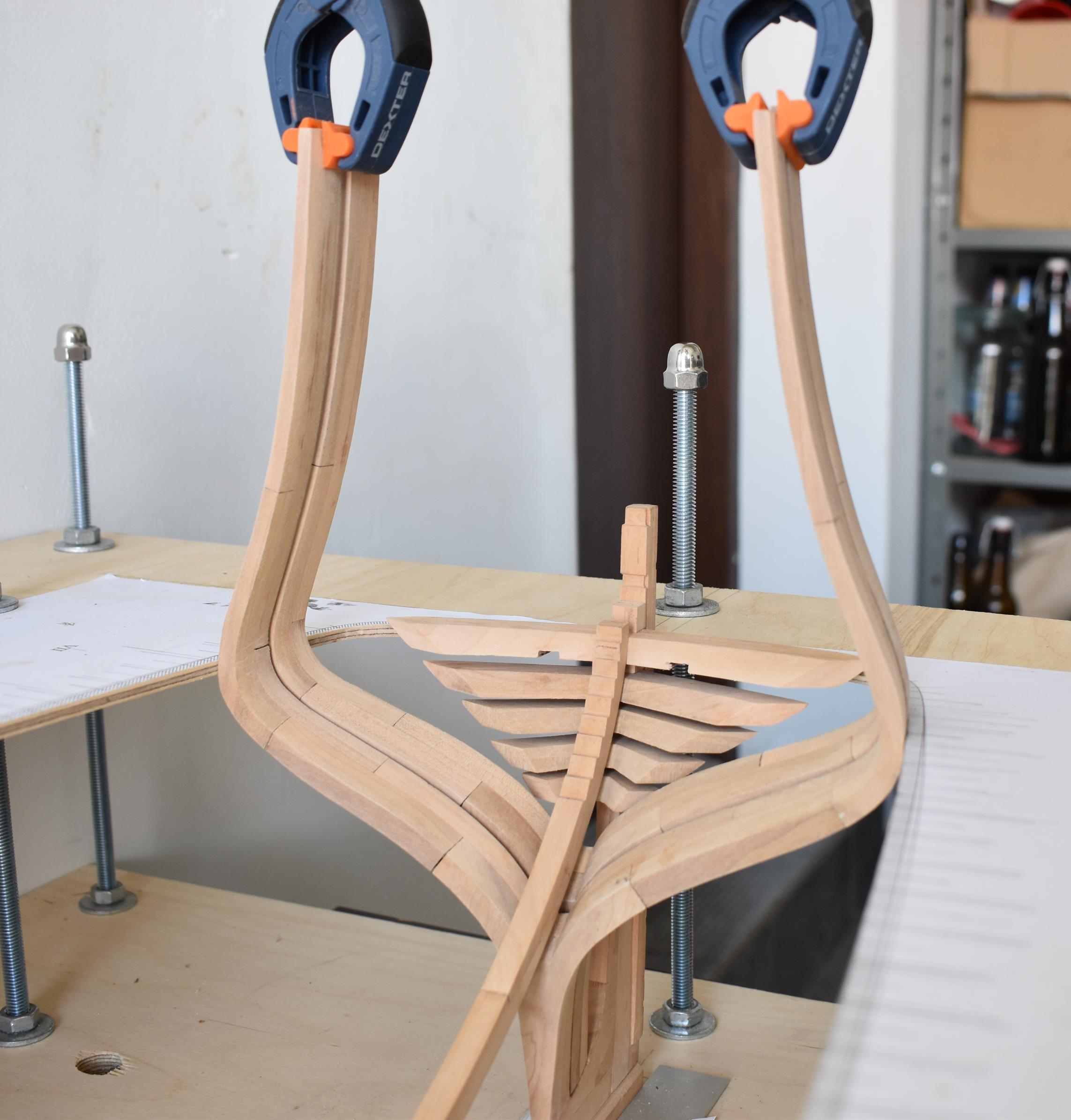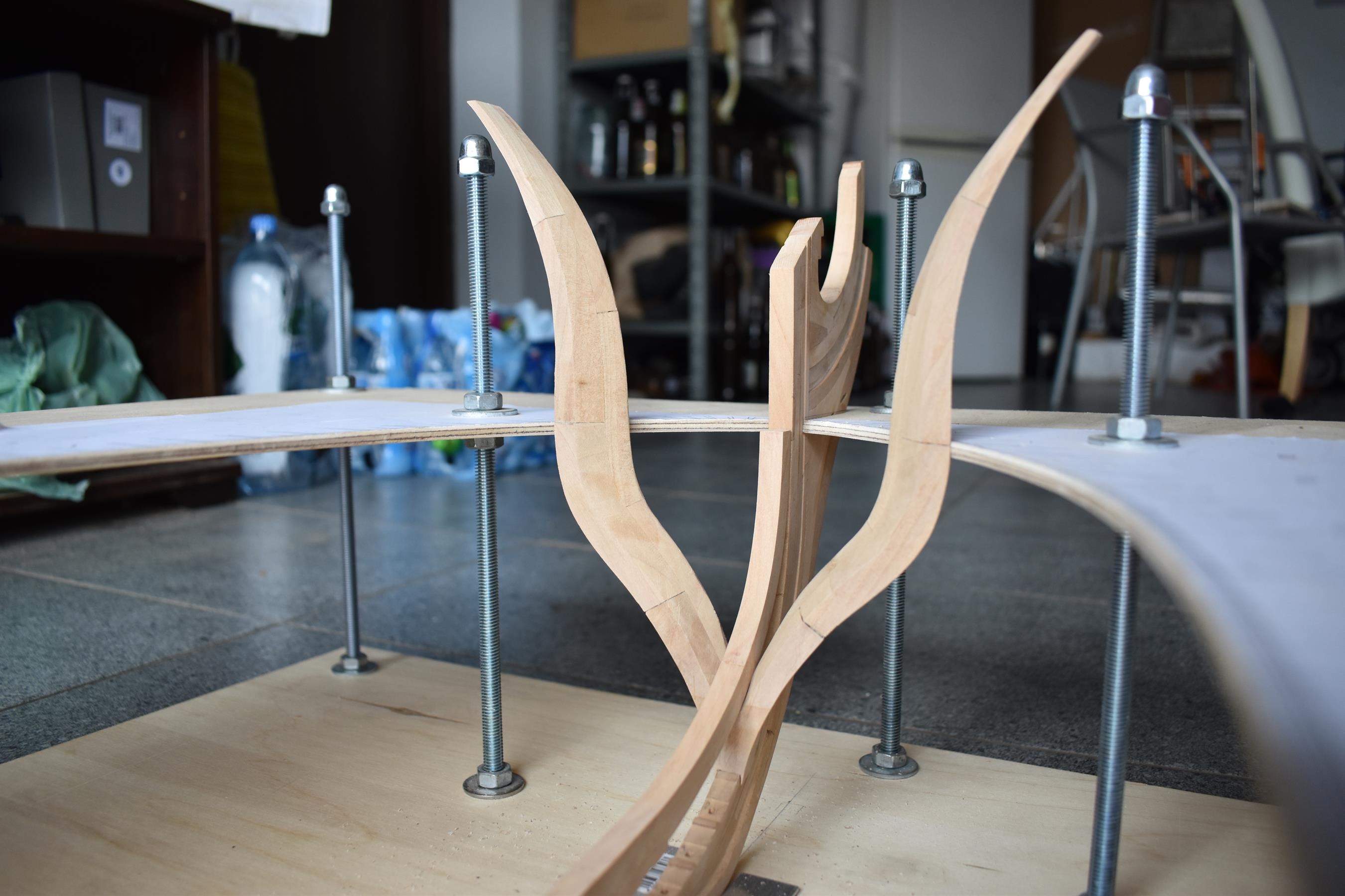 Wręgi kleję na desce montażowej.