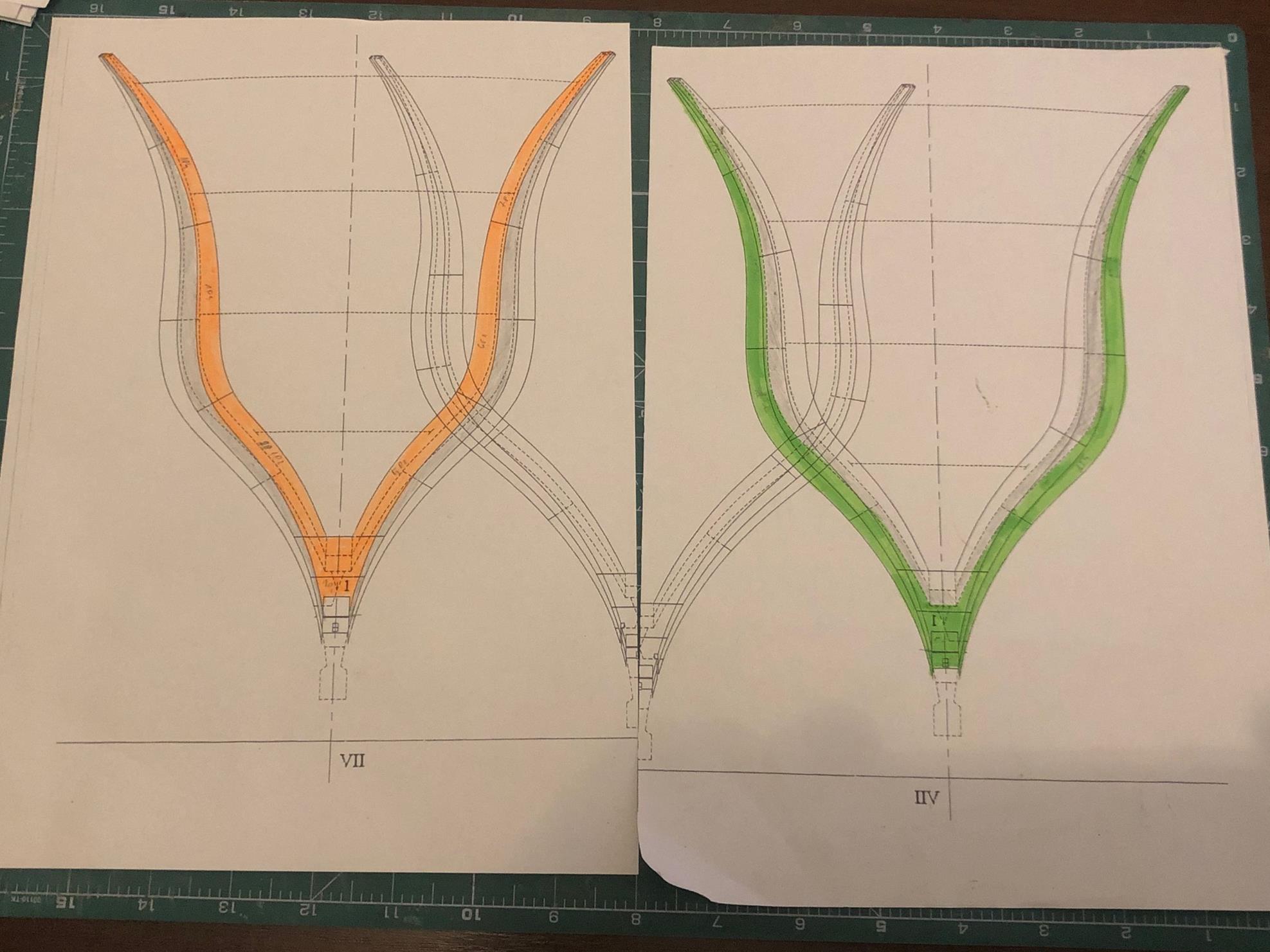 Wziąłem się za wręgi. Początkowo miałem problemy z rozgryzieniem która kreska na planach jest odpowiednią krawędzią wręgi, wiec postanowiłem sobie ułatwić kolorami.
