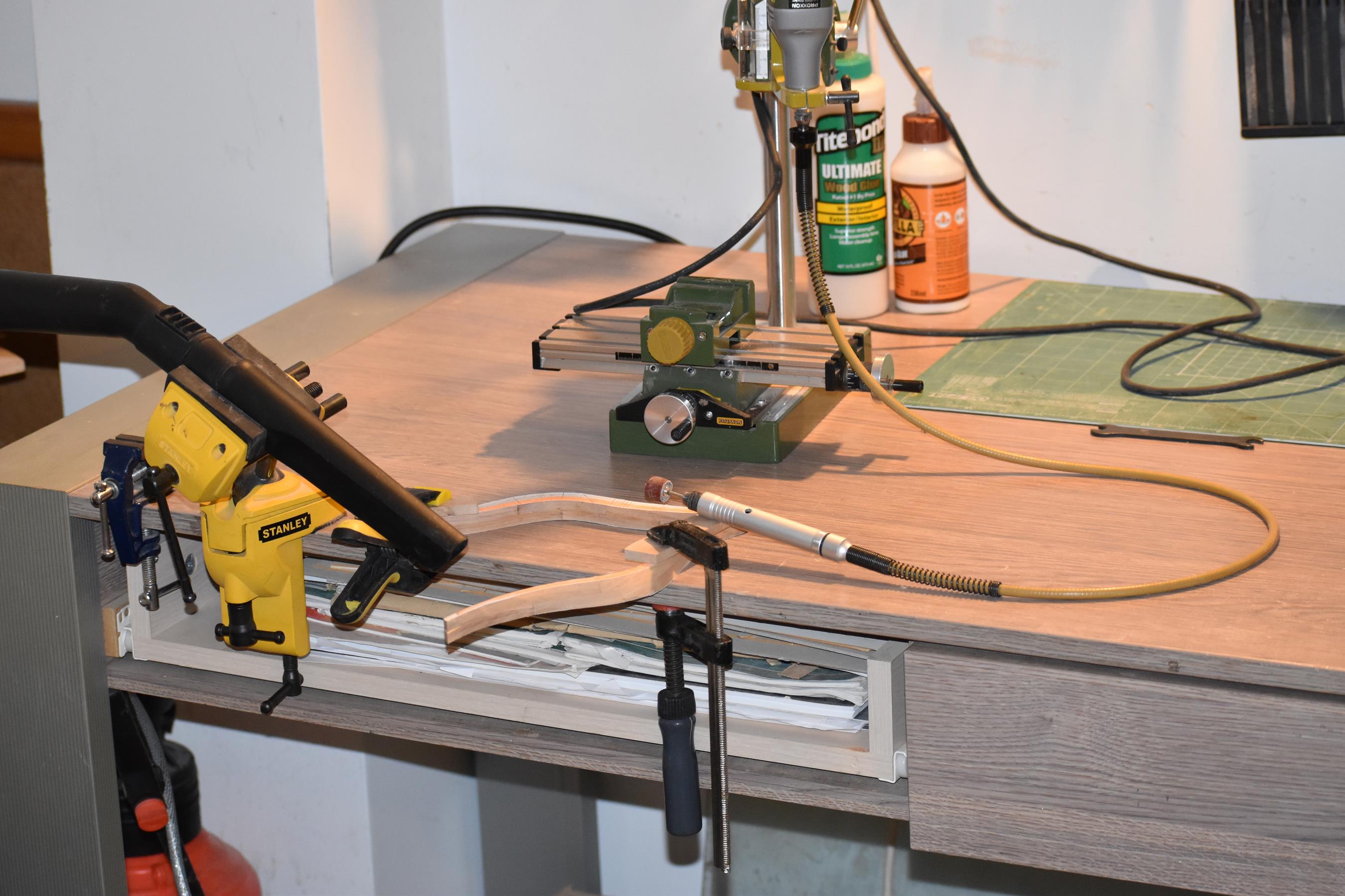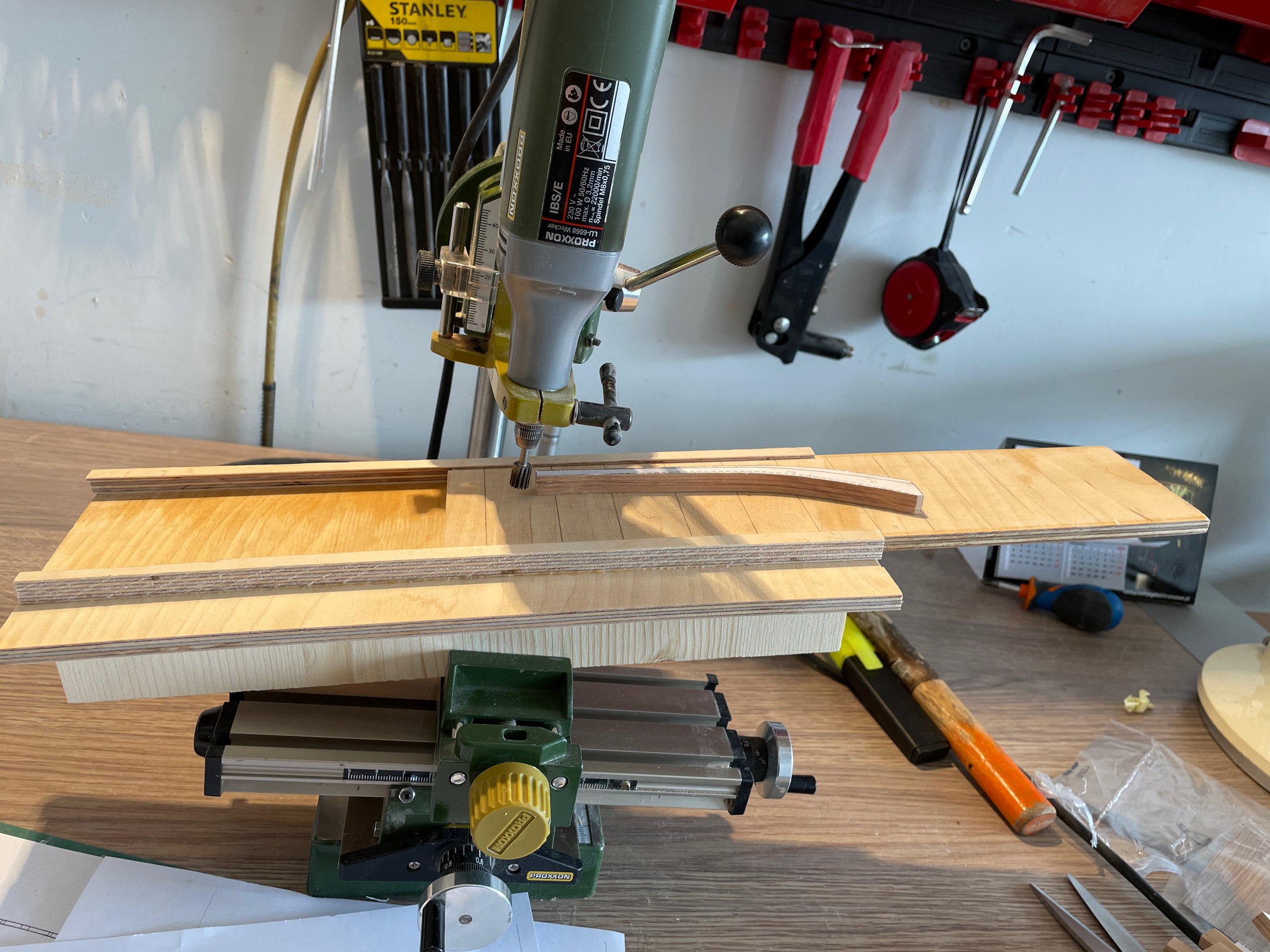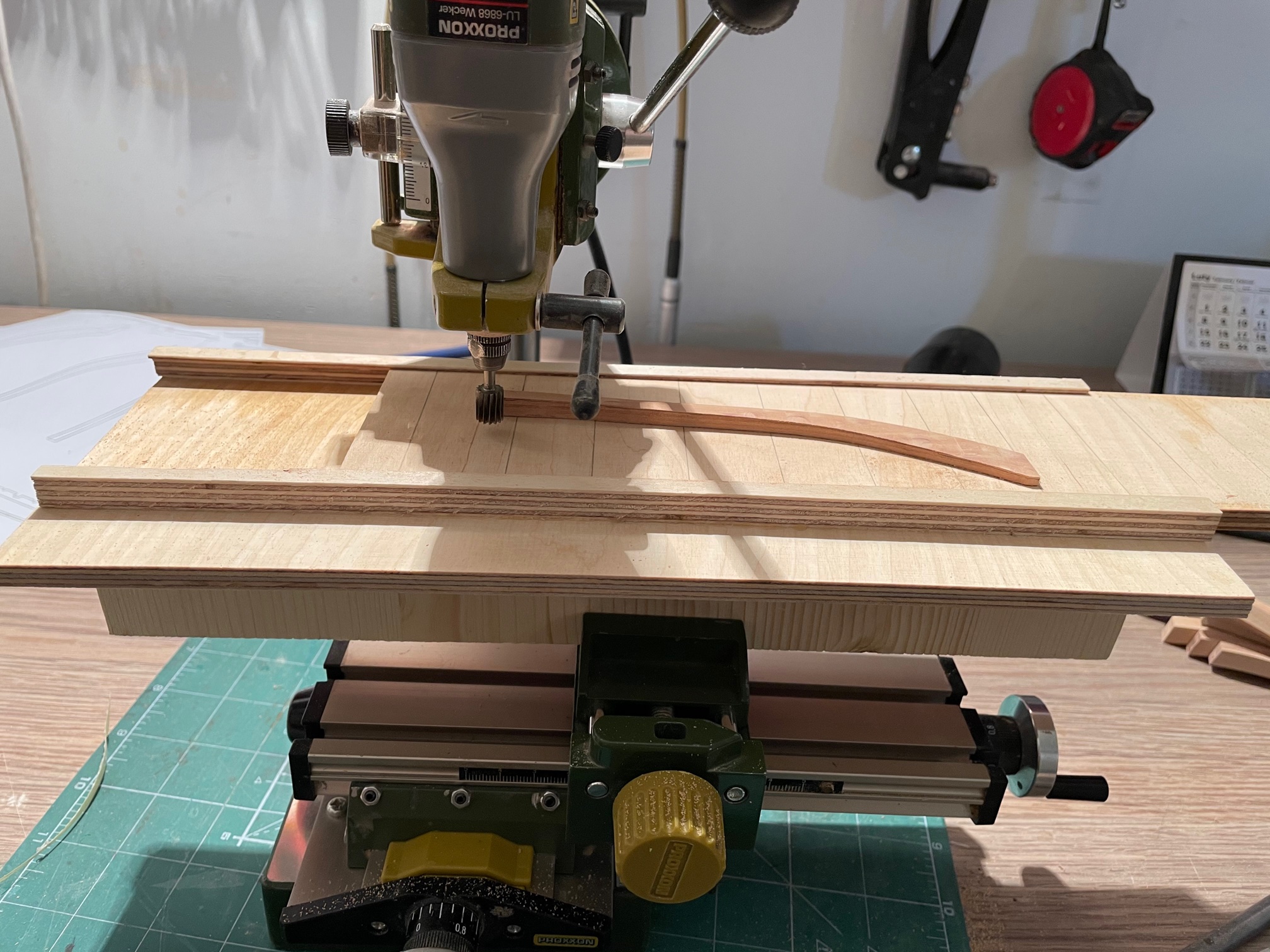 Znudziło mi się szlifowanie wręg, to zabrałem się za wręgi dziobowe. Trochę trzeba pogłówkować, zobaczymy co z tego wyjdzie. Wręgi zmieniają się po długości na szerokość. Ponieważ stół krzyżowy proxxona ma za mały zakres przesuwu, musiałem dorobić sobie urządzenie, które pozwala na frezowanie długich elementów.