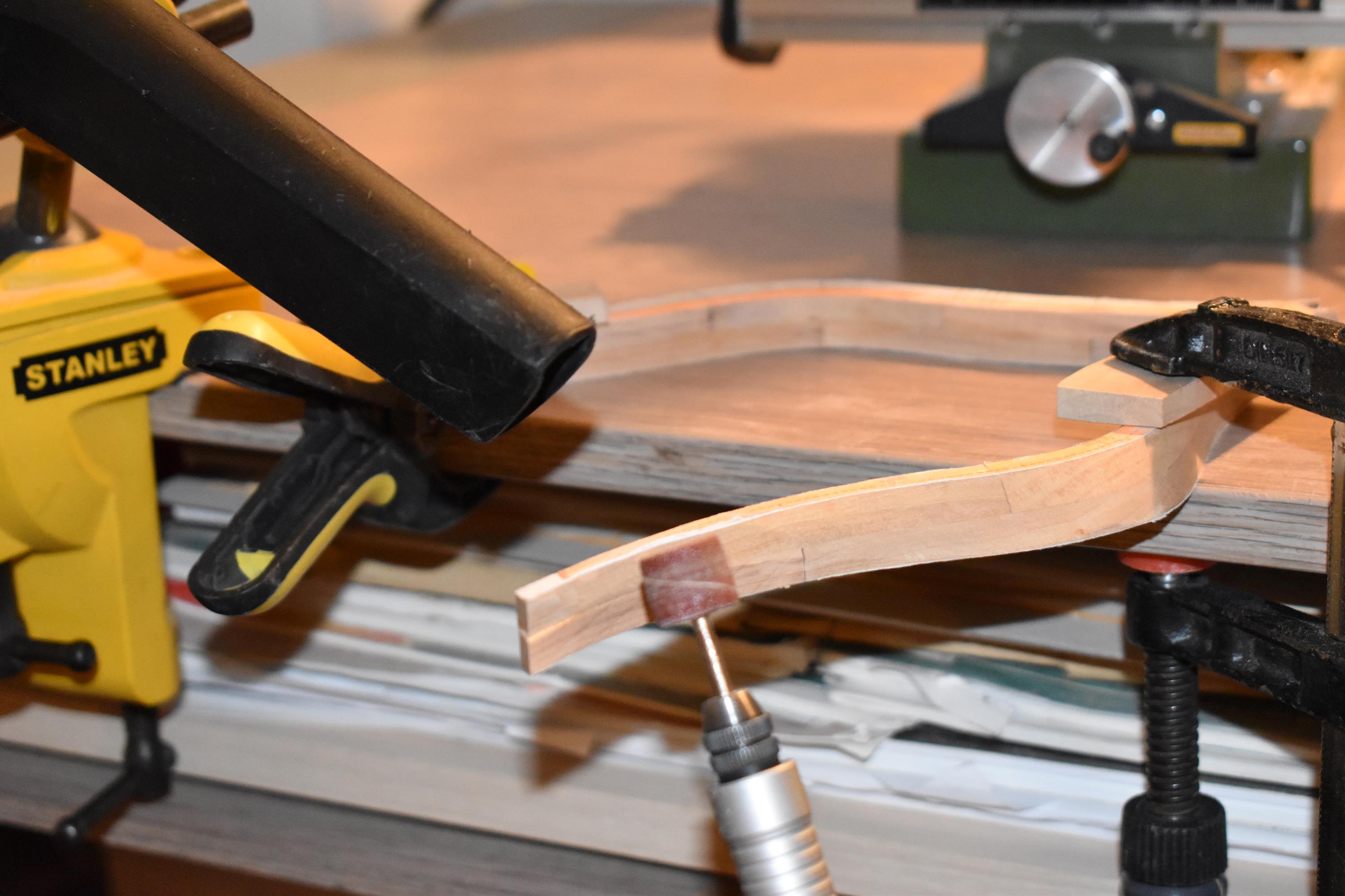 Tymczasem skleiłem wręgi od 1 do 33. Powoli je szlifuję i osadzam w stoczni. Szlifuję proxxonem i pilnikami. Na koniec cyklinuję ostrzem nożyka, aby złapać równą płaszczyznę między skrajnymi krawędziami wręgi. Staram się szlifować prawie na gotowo.