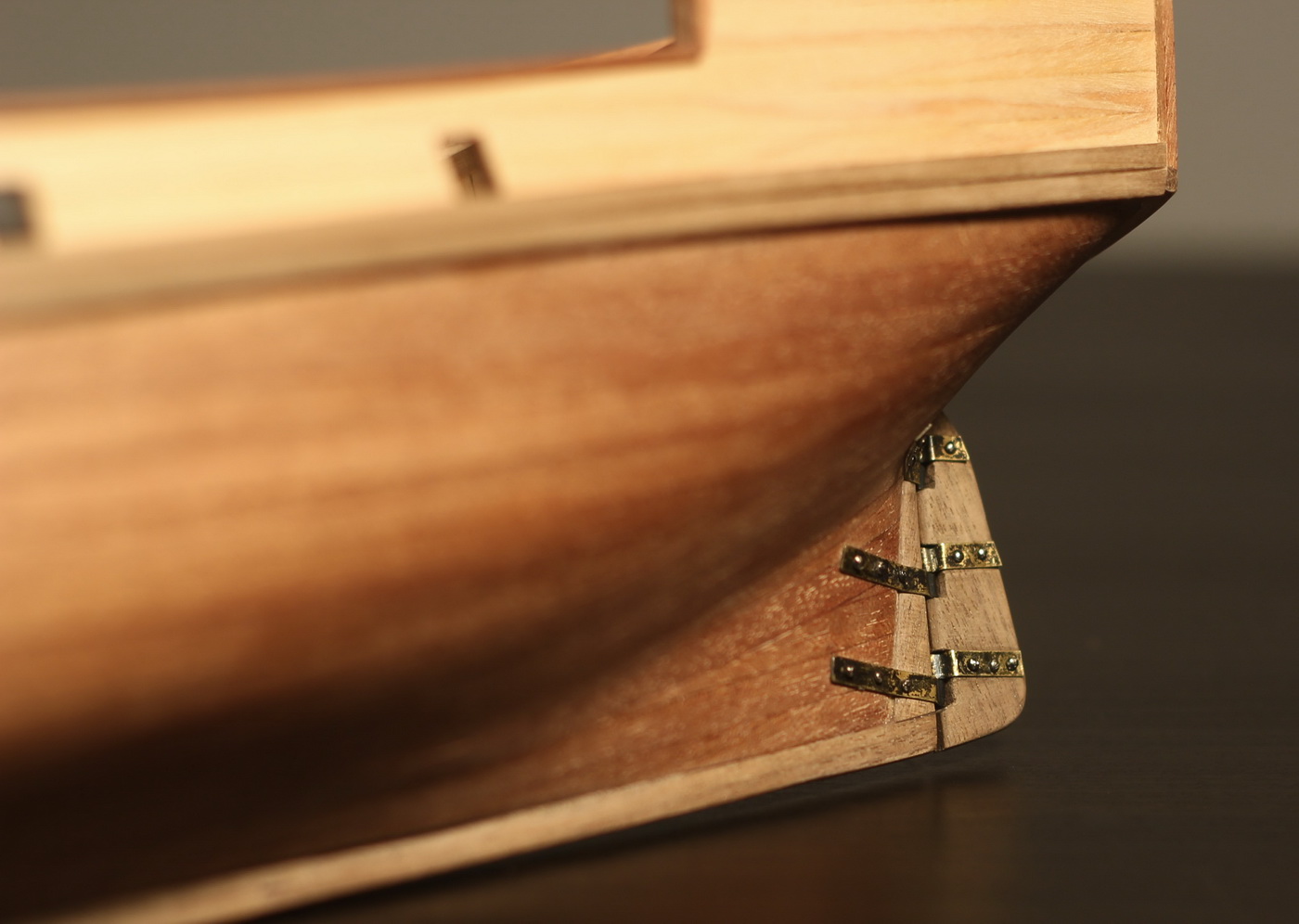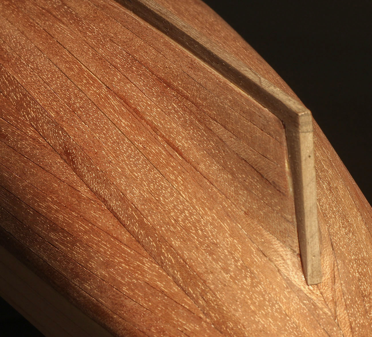 Przyszła stępka, stewa dziobowa i rufowa. Zgodnie z wcześniejszymi planami zastąpiłem gotowe elementy ze sklejki 5mm na orzech afrykański 4mm.