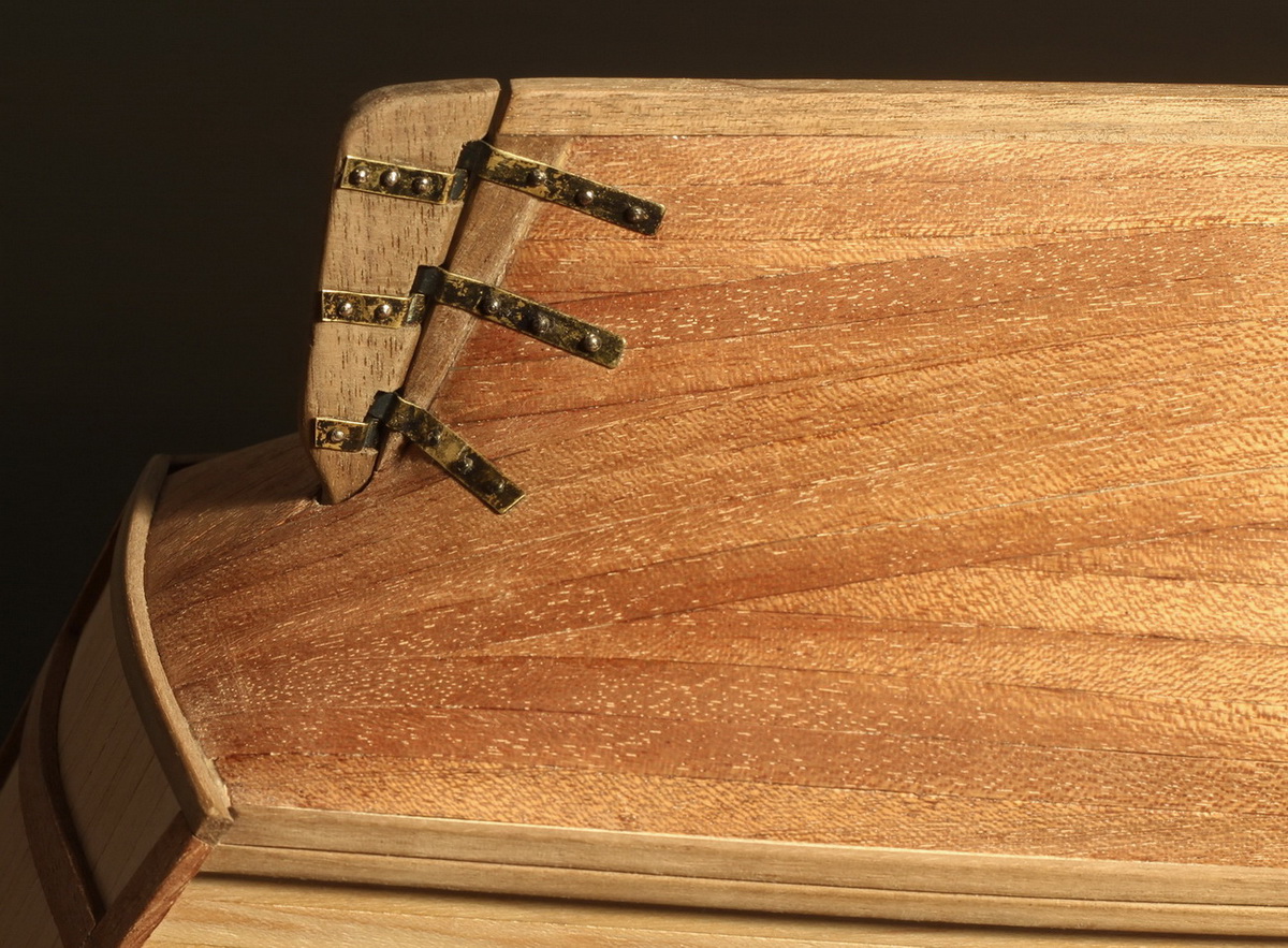Wykończyłem górę burt sklejką własnej roboty, zrobioną z trzech warstw forniru mahoniowego 0,6 mm, klejonego wzdłuż słojów. W zestawie były na to wycięte elementy ze sklejki do pomalowania czarnym flamastrem / pobejcowania. To jest ta listewka poniżej. Dla porównania te listewki powyżej to zwykły lity mahoń: