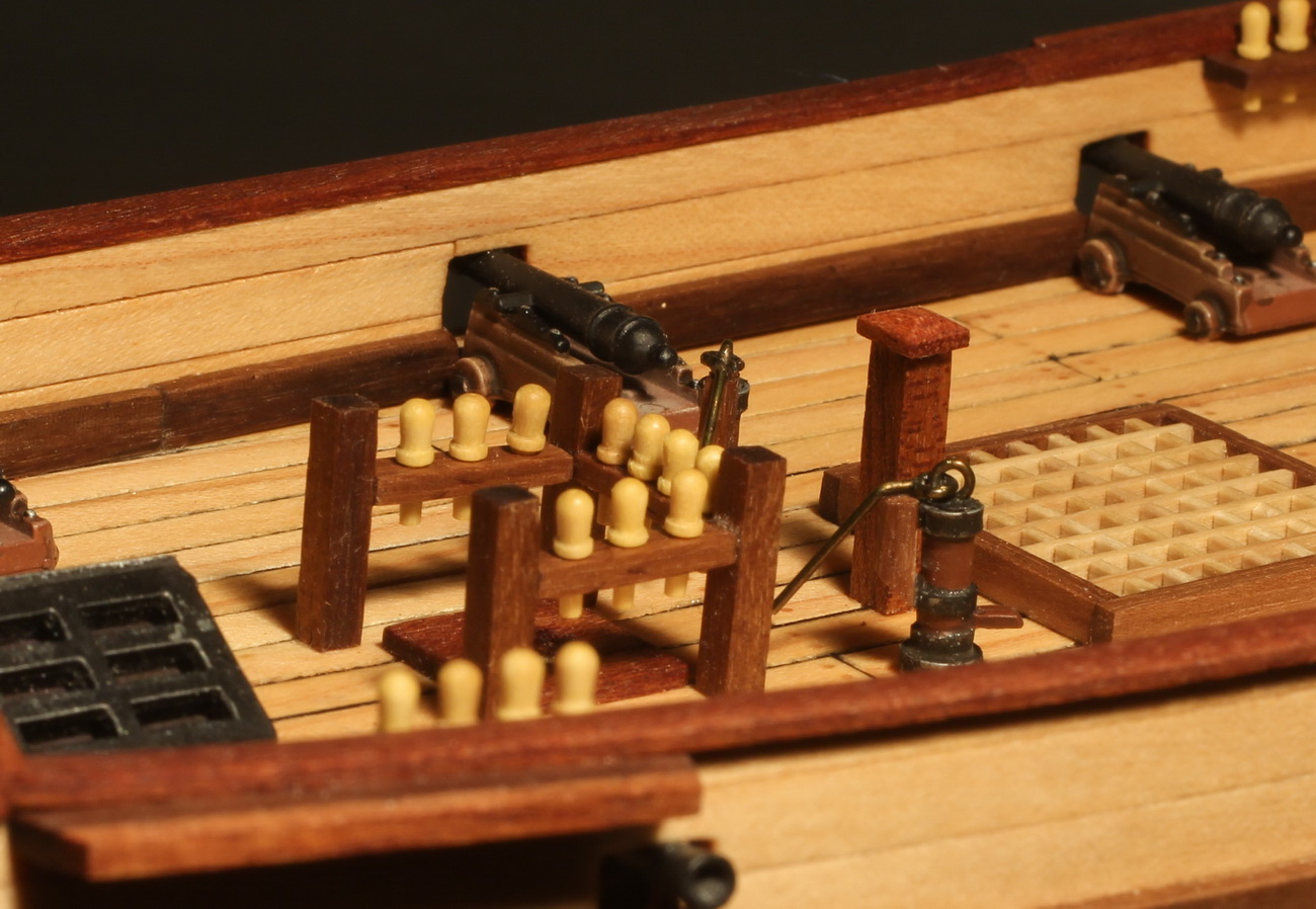 1) Wózki armat nie są w żaden sposób przymocowane, jedynie klejone do pokładu. Planuję dorobić mocowania do burt, wzorując się na HMS Bounty daliego.