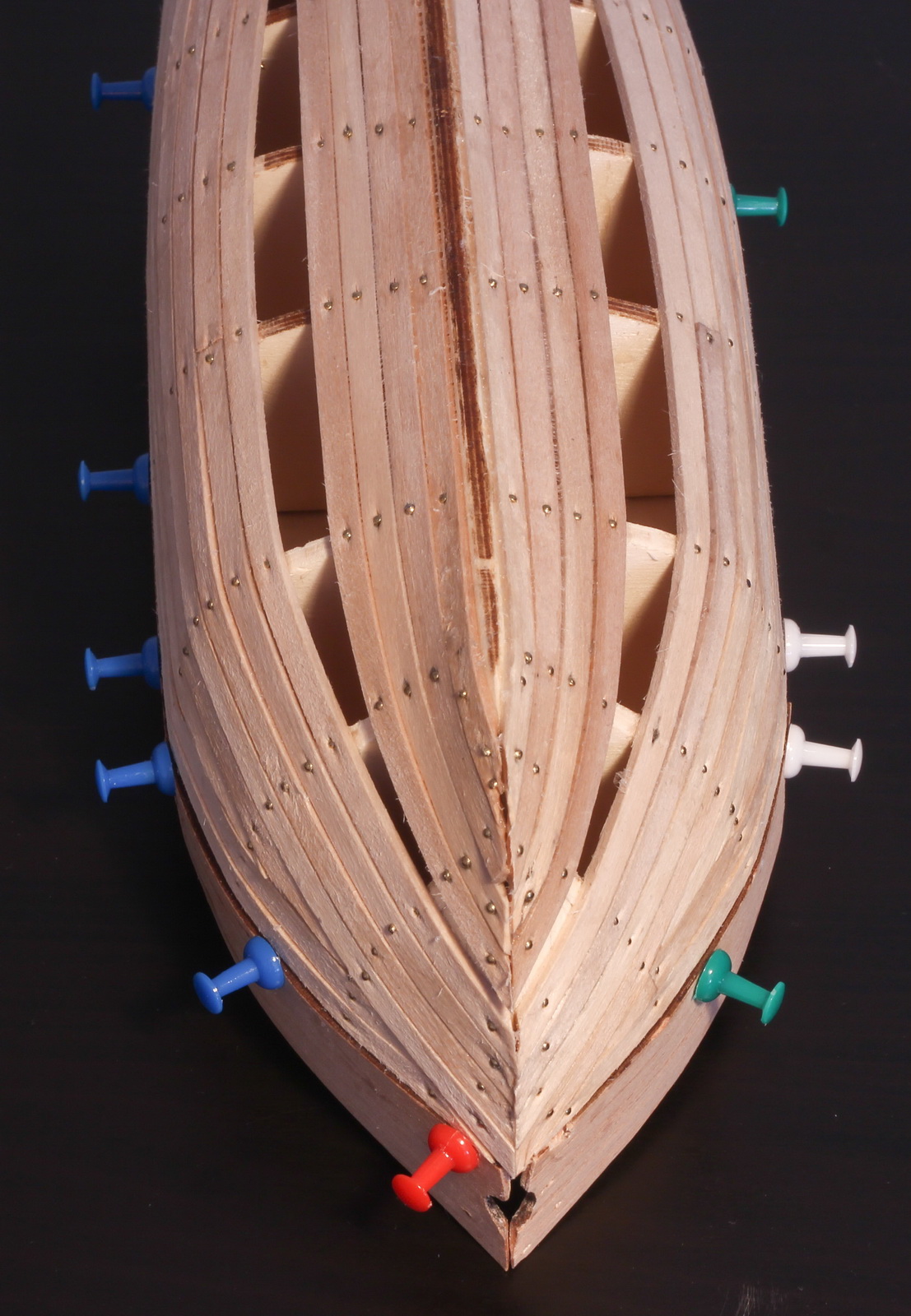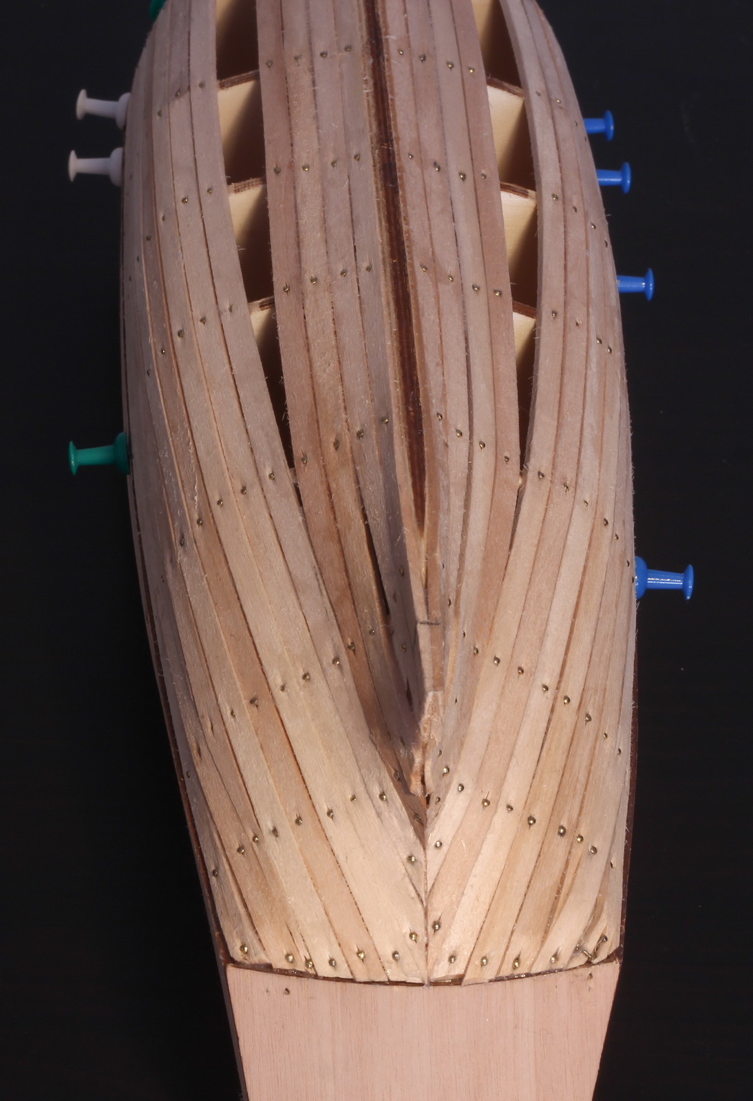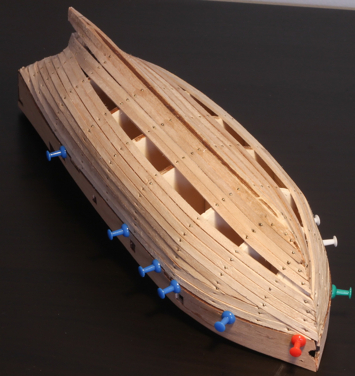 Dokończyłem pierwszą warstwę poszycia, i wkleiłem kołki w pokład. Jutro wielkie szlifowanie.