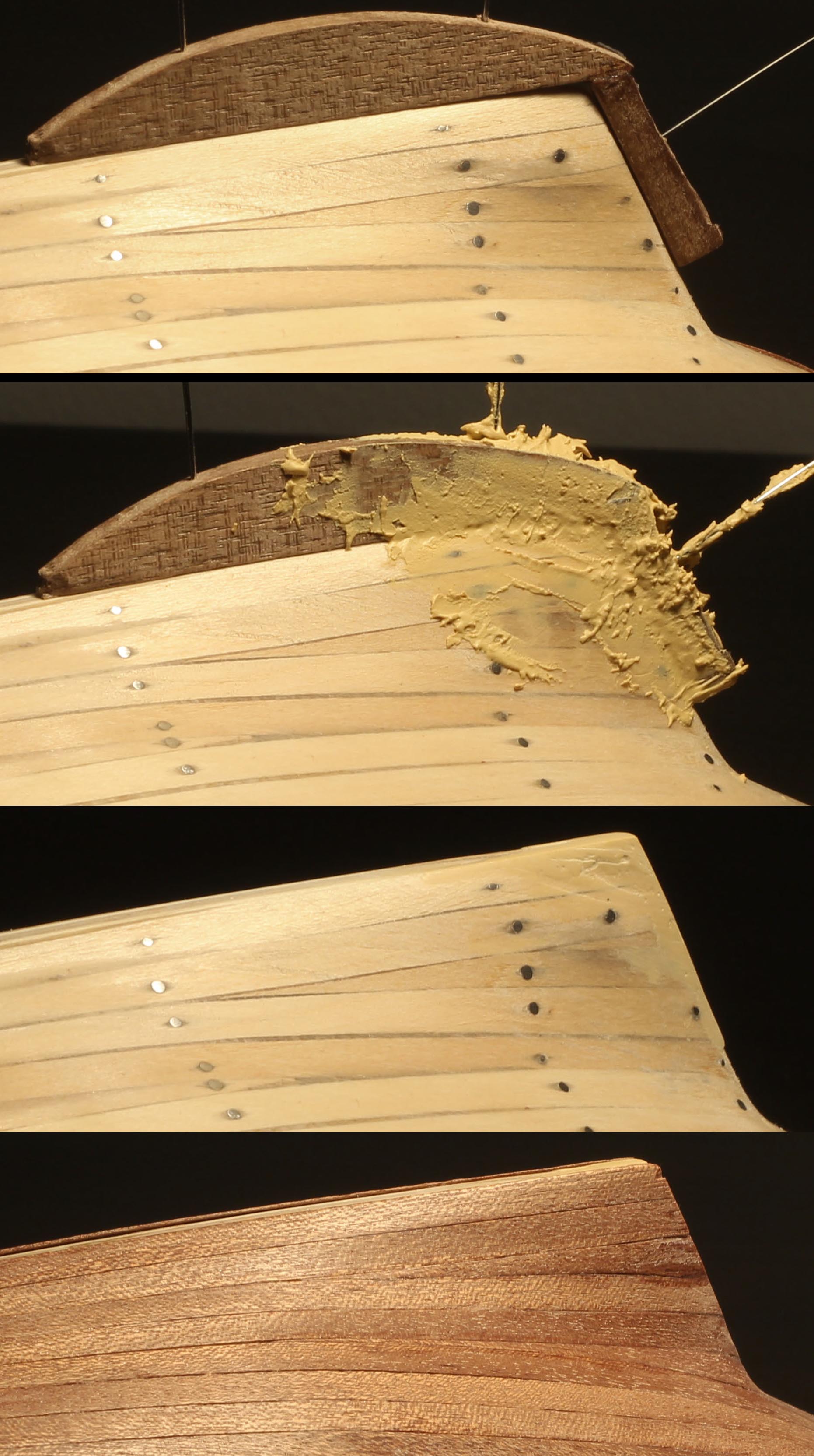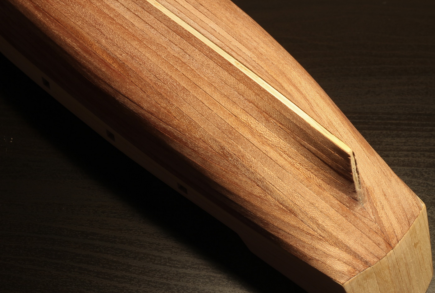 Ogolna zasada jest taka, ze kazda para planek (jedna z nich na bakburcie i druga - analogiczna dla niej - ta na sterburcie) przebiega nieprzerwanie od stewy rufowej do dziobnicy a nie tak, jak Ty zrobiles - owszem, przyklejajac niektore swoje planki nieprzerwanie od rufy do dziobnicy, ale, nie profilujac ich odpowiednio (tzw. plank spiling), uzyskales przeto zbyt waskie przestrzenie (albo brak takowych) dla kolejnych planek na dziobie. I w rezultacie zakonczyles tamte na ostry "szpikulec", nie dochodzac ich koncami do dziobnicy czy stewy rufowej, a wcisnales je miedzy sasiadujace planki.