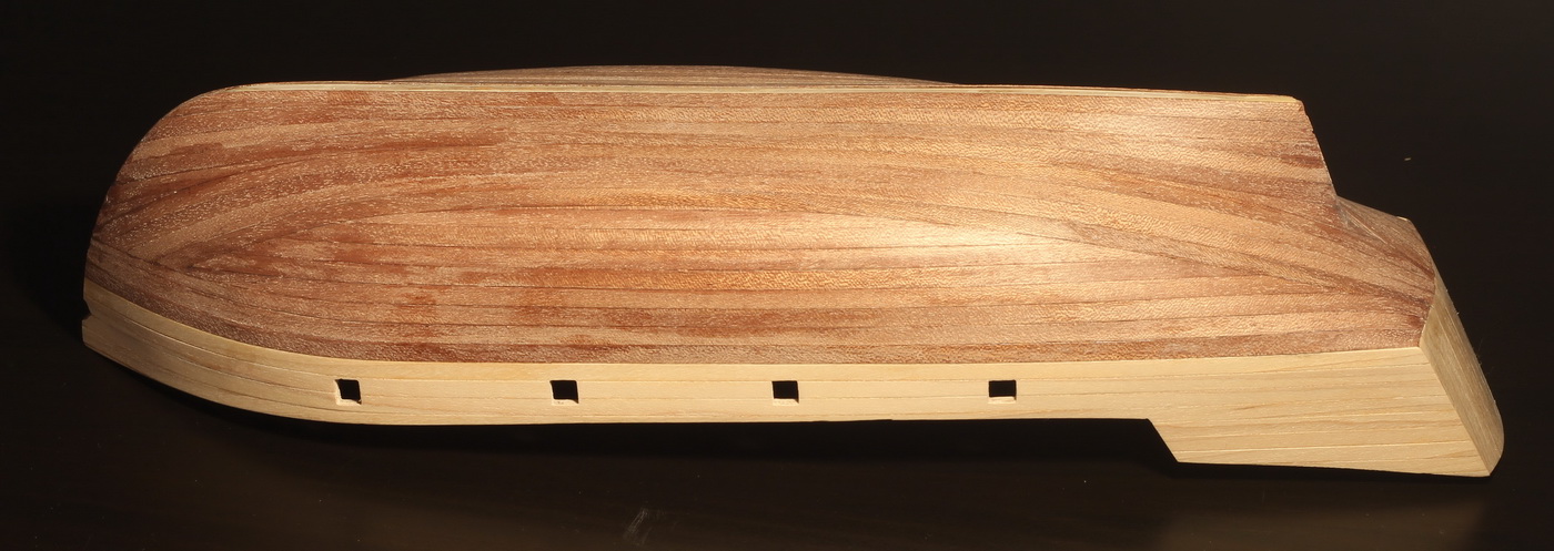 Jak widać na zdjęciach powyżej, przykleiłem pierwszy pasek forniru z Mahoniu Sapeli. Drugą warstwę poszycia chciałem zrobić sposobem, pokazanym przez Romka z budowy Stanty Marii, by planki poniżej poziomu wody, były z jednego odcinka forniru. Niestety zamówiony arkusz forniru nie ma wystarczającej długości, a w instrukcji nie ma wzoru prawidłowego układu planek.