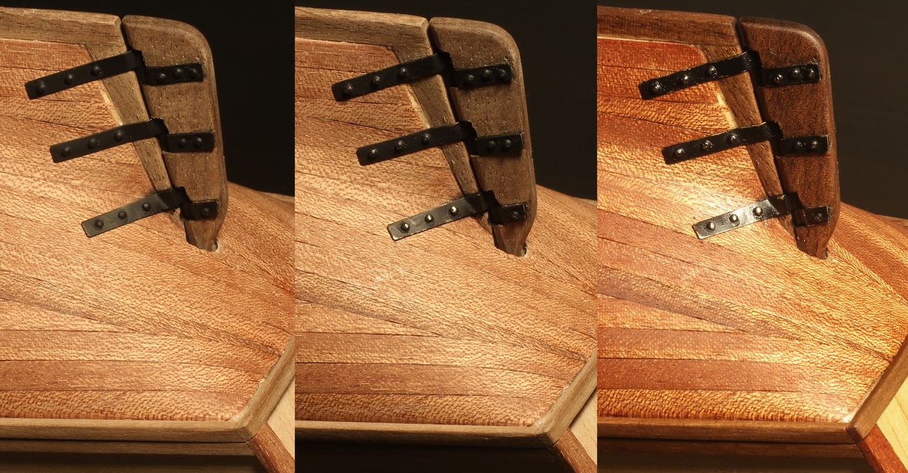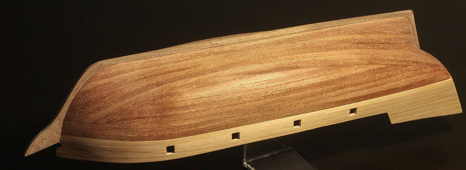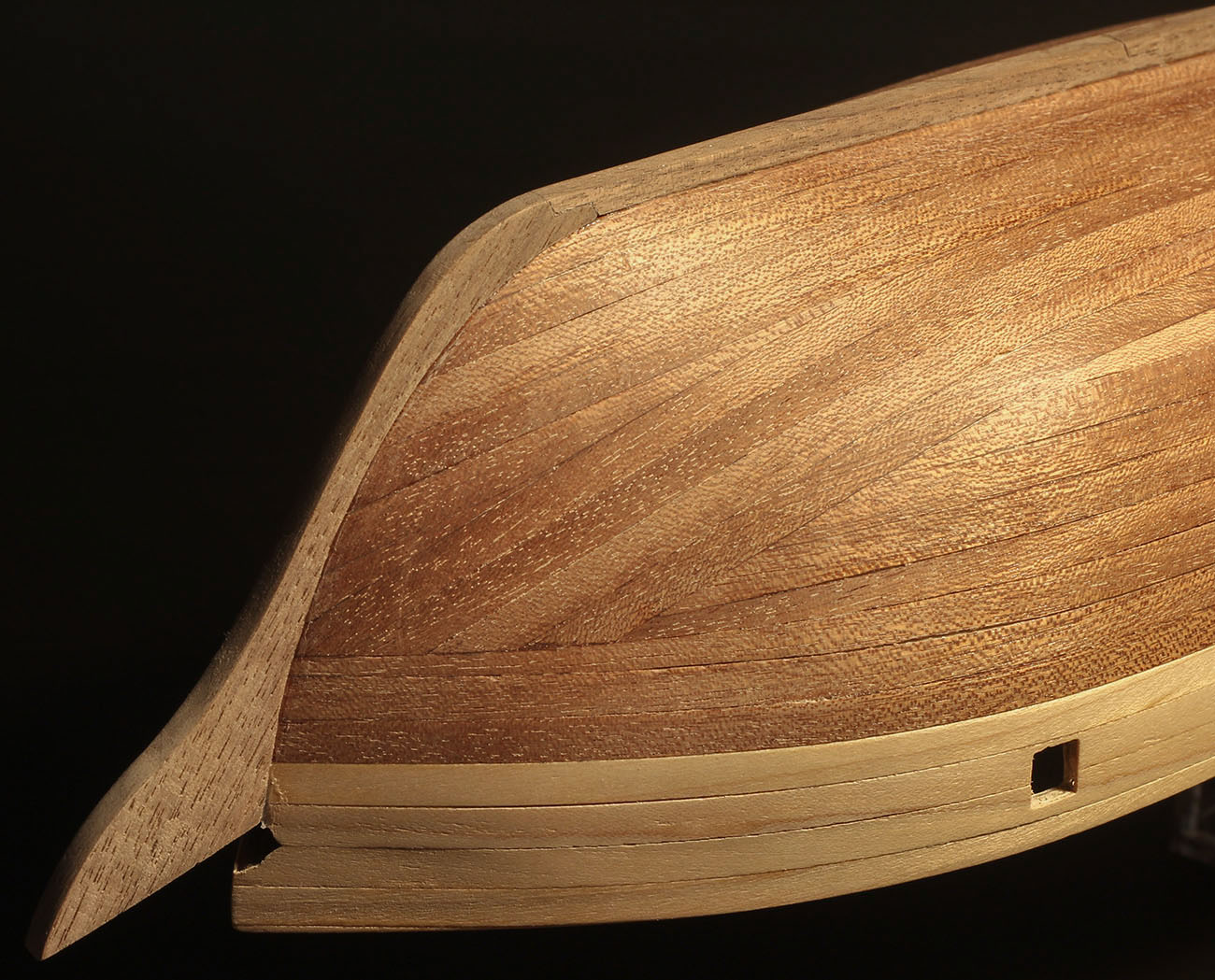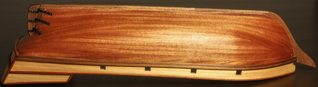Wykończyłem górę burt sklejką własnej roboty, zrobioną z trzech warstw forniru mahoniowego 0,6 mm, klejonego wzdłuż słojów. W zestawie były na to wycięte elementy ze sklejki do pomalowania czarnym flamastrem / pobejcowania. To jest ta listewka poniżej. Dla porównania te listewki powyżej to zwykły lity mahoń: