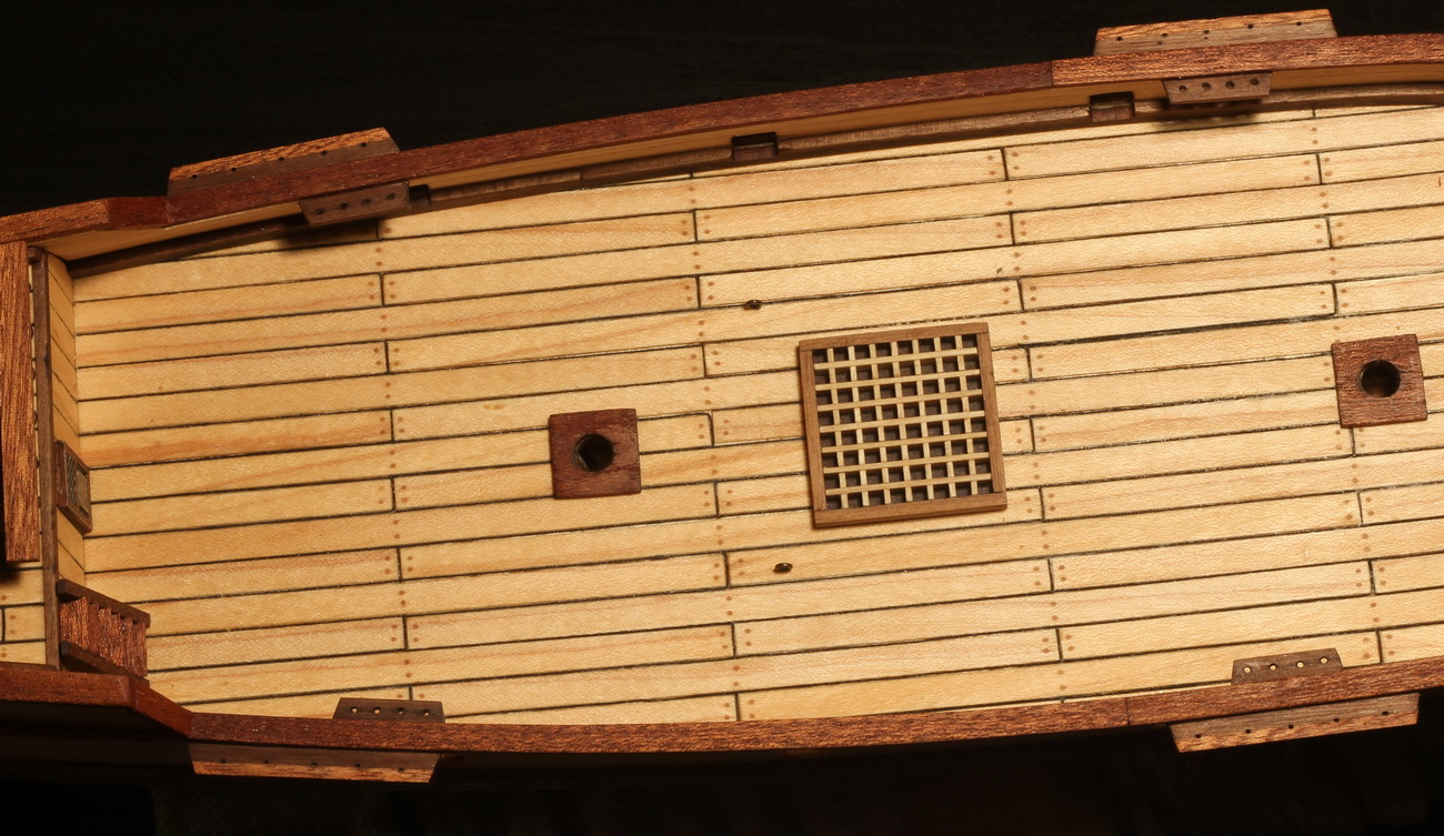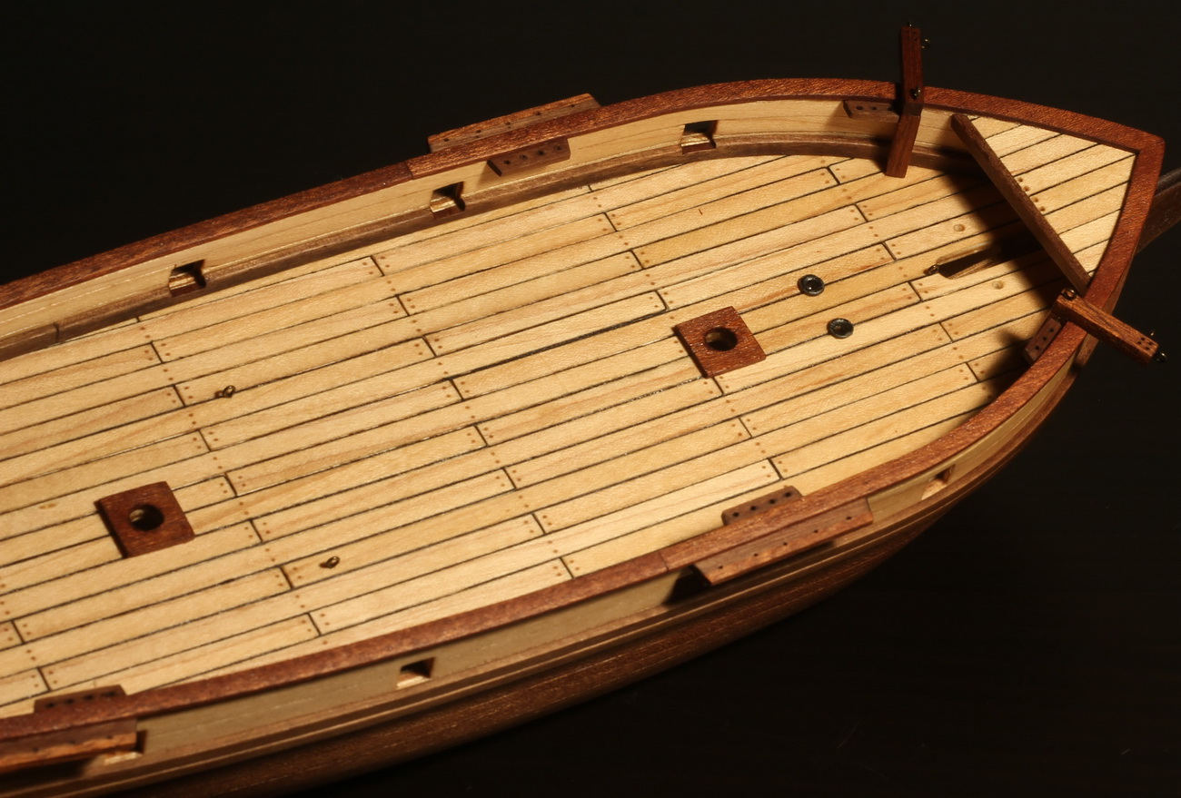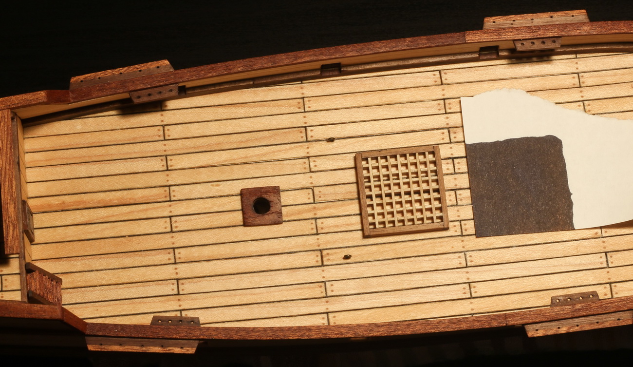 Wstrzymałem się z olejowaniem pokładu. Na pokład przyszły pomalowane okucia otworów na linę kotwiczną i wykończenia otworów masztów z mahoniowej sklejki: