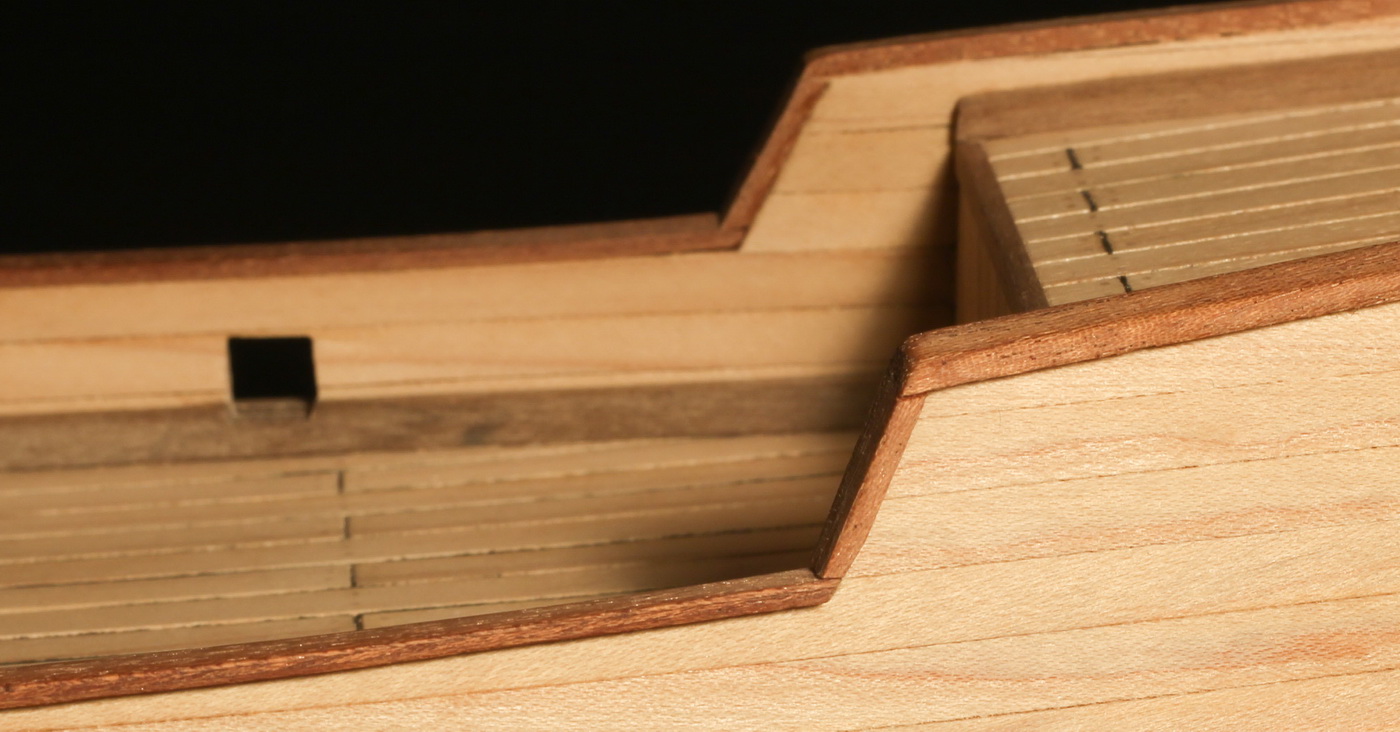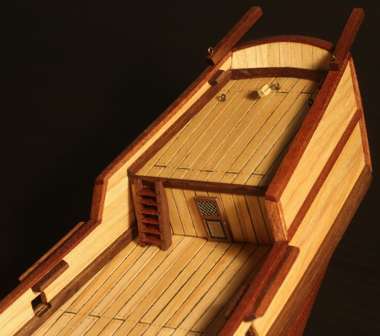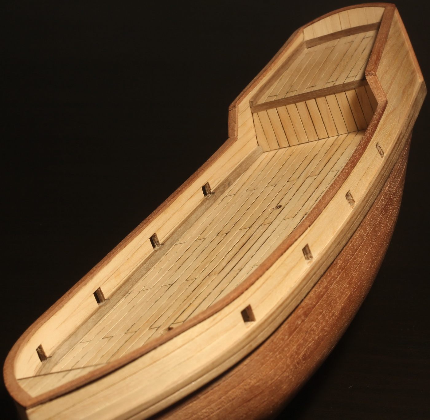 Wstrzymałem się z olejowaniem pokładu. Na pokład przyszły pomalowane okucia otworów na linę kotwiczną i wykończenia otworów masztów z mahoniowej sklejki: