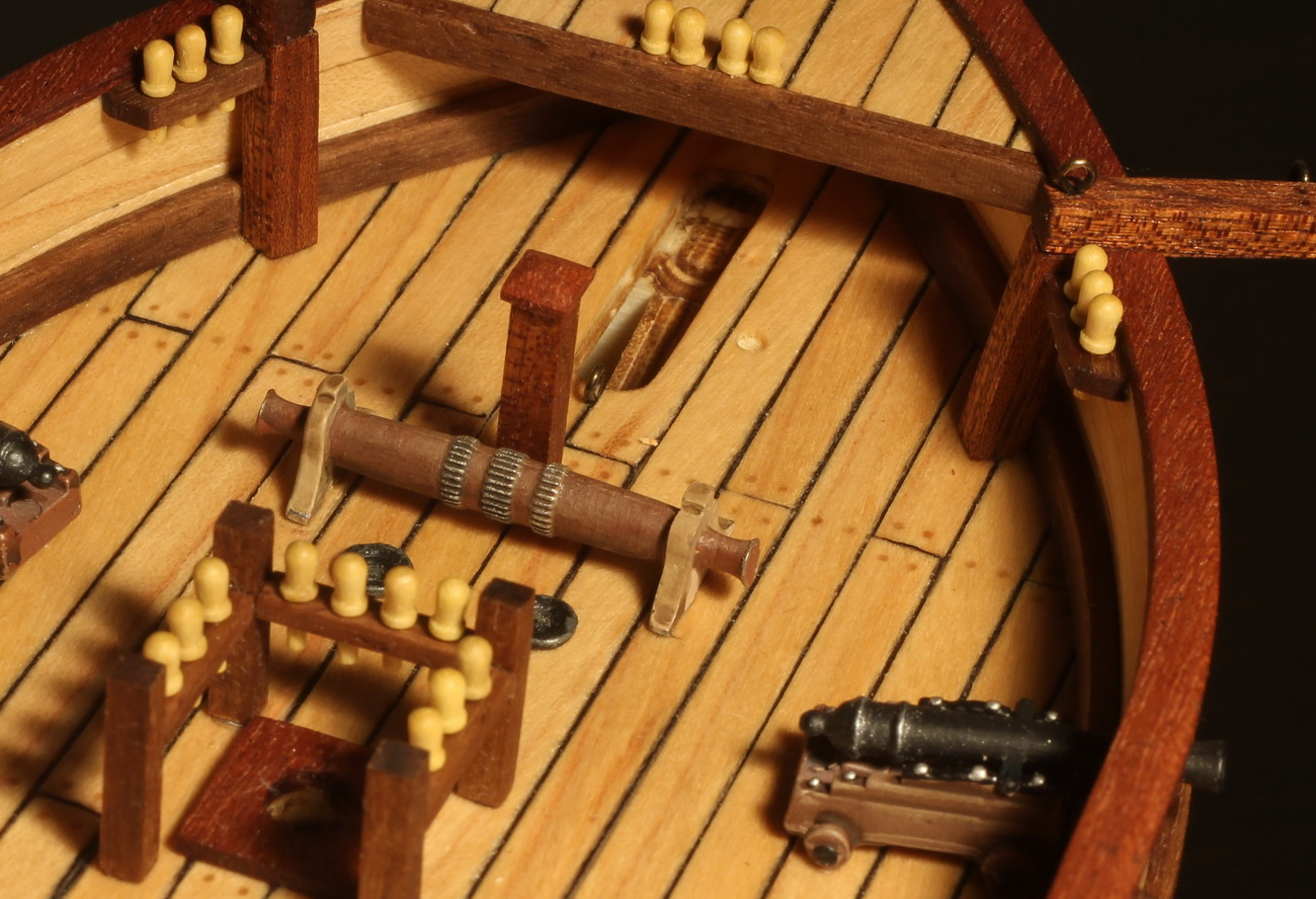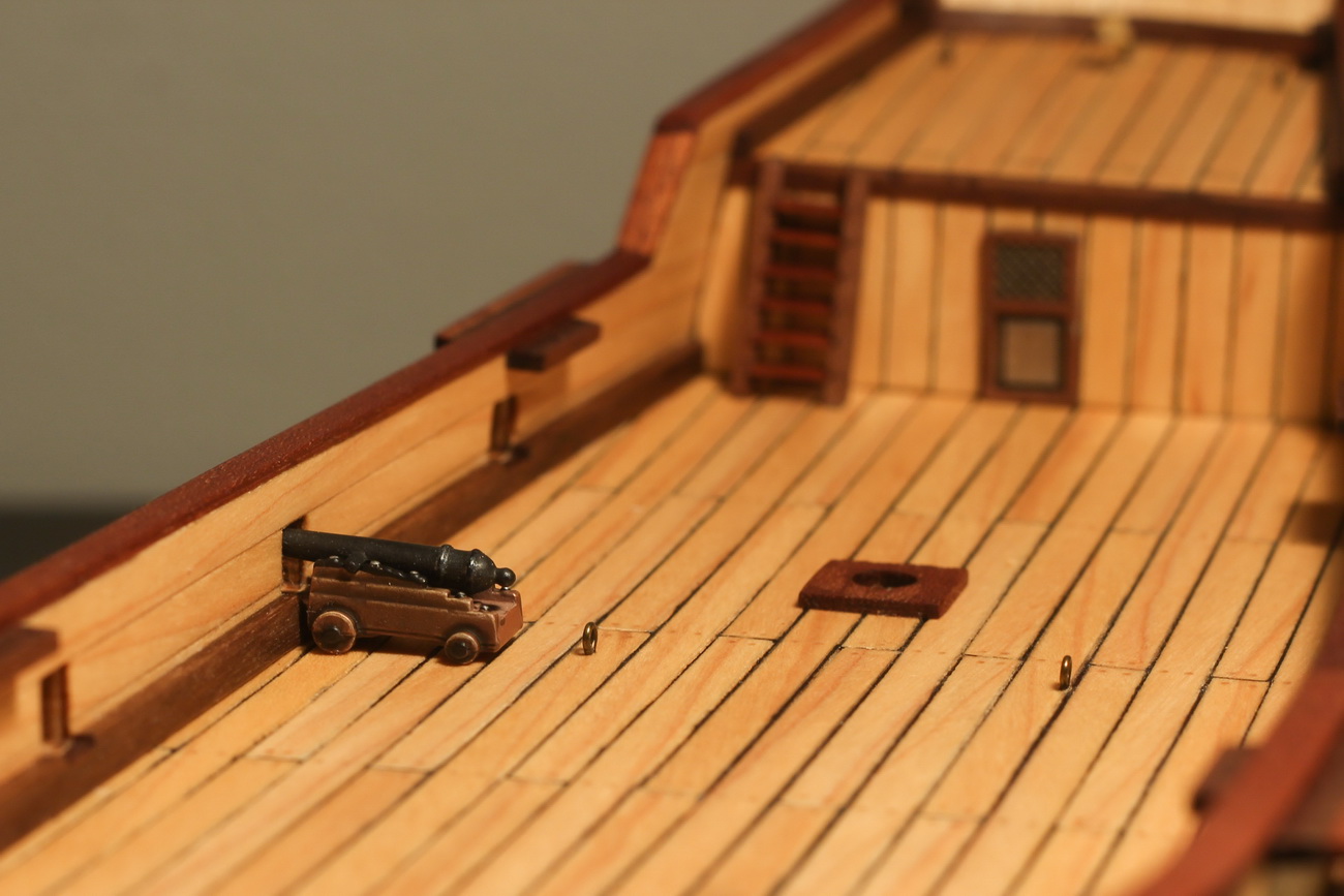1) Wózki armat nie są w żaden sposób przymocowane, jedynie klejone do pokładu. Planuję dorobić mocowania do burt, wzorując się na HMS Bounty daliego.