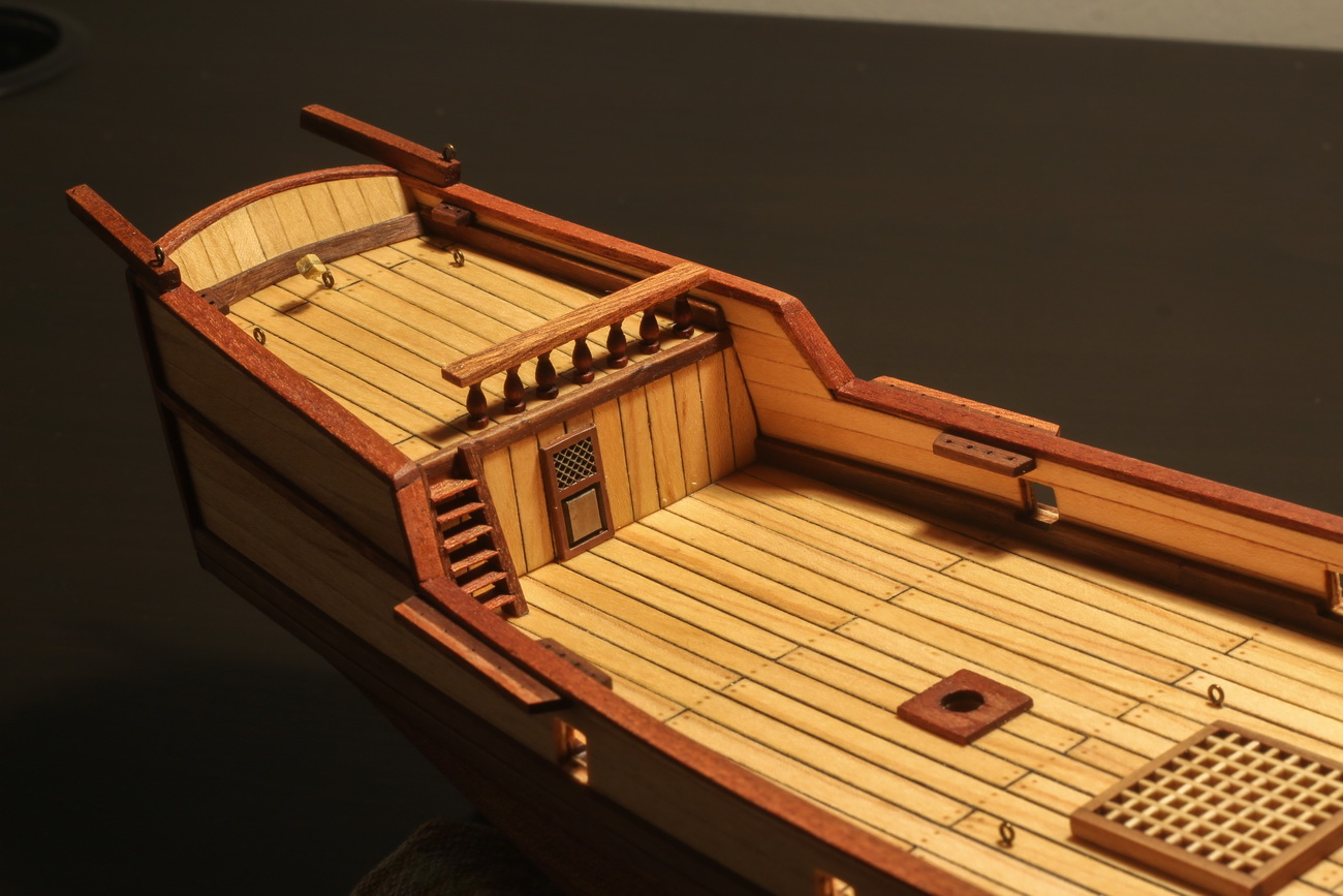 Gotową drabinę postanowiłem zastąpić schodkami. Na rufie pojawiły się też drzwi, żurawie szalupy i pierwszy bloczek: