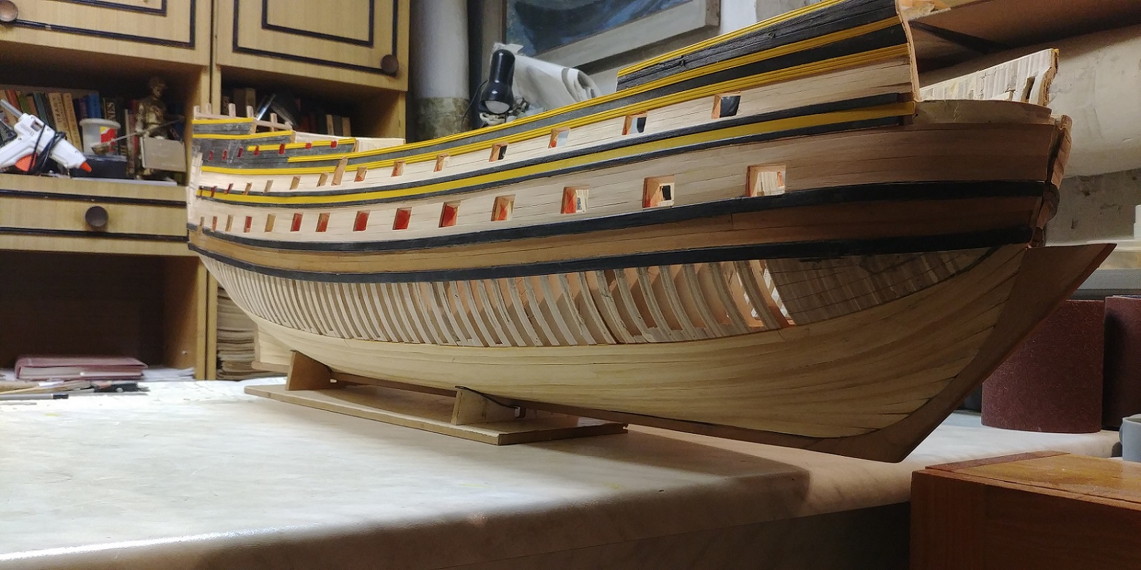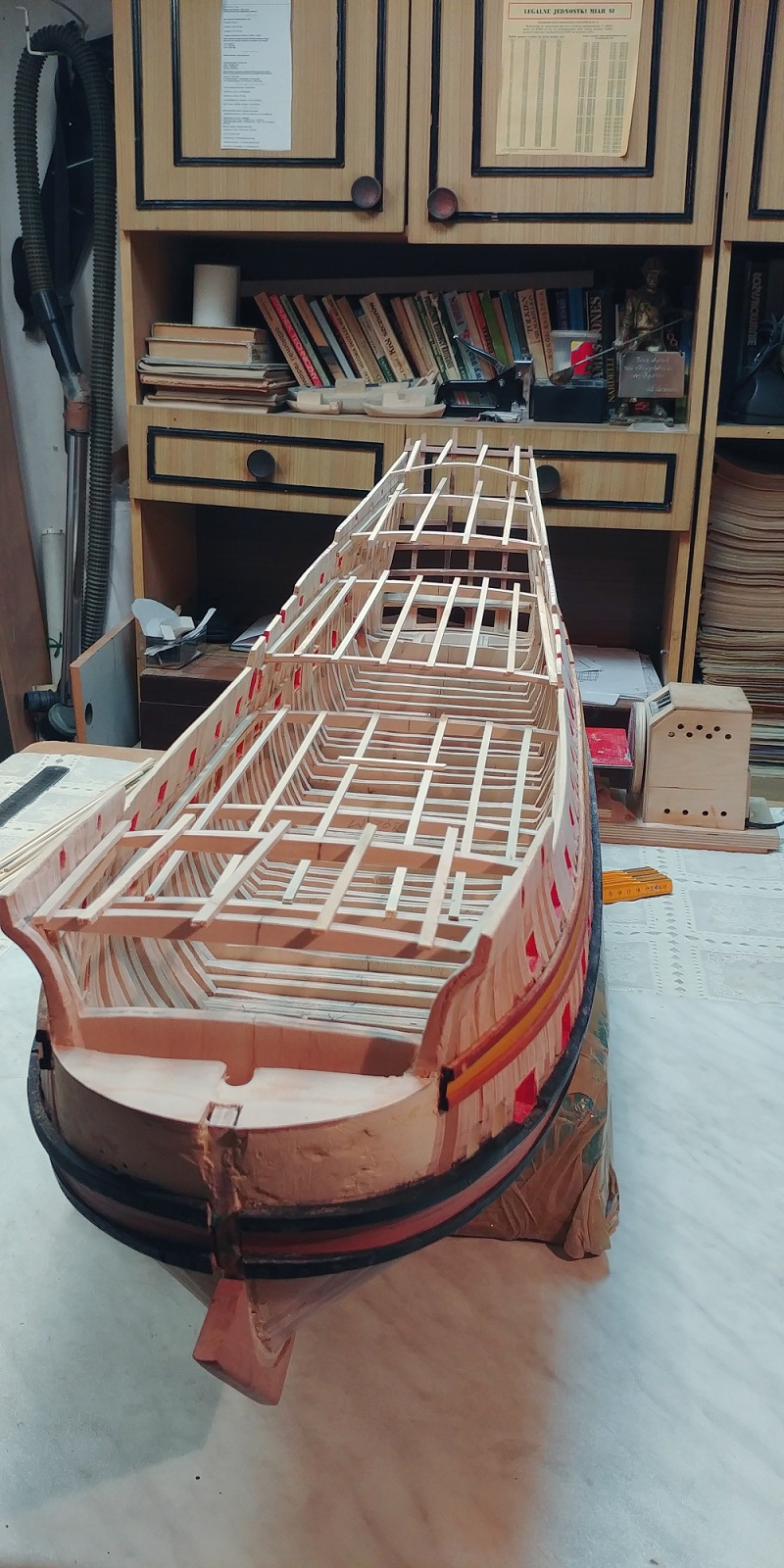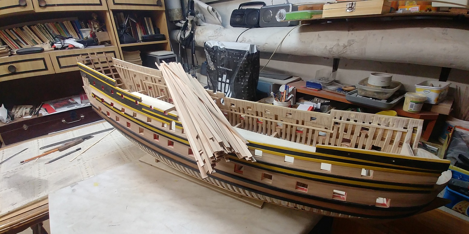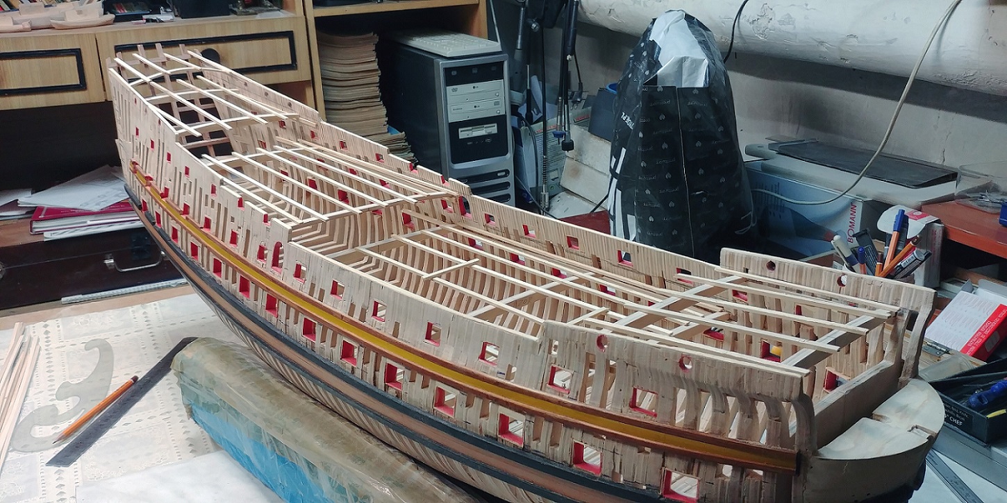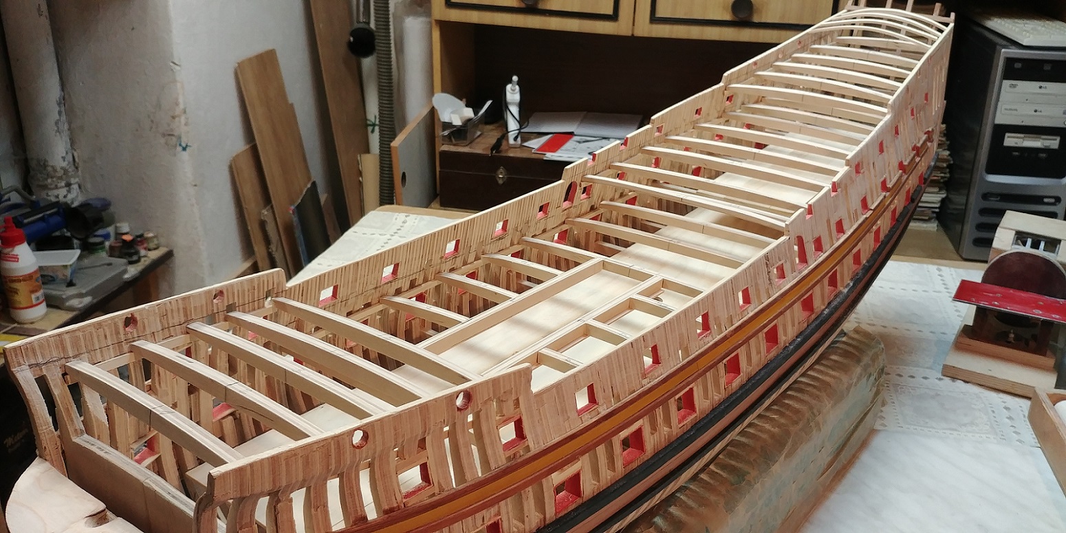 Aby zejściówki nie trafiały w pustkę zabudowałem wewnętrzny pokład którego praktycznie widać nie będzie,bo furty będą zamknięte.Ale tak dla zasady.Ta ilość pokładników myślę wystarczy,aby utrzymać równo pokłady.Narazie przymiarka.Czekam na listwy aby zabrać się za poszycie kadłuba.