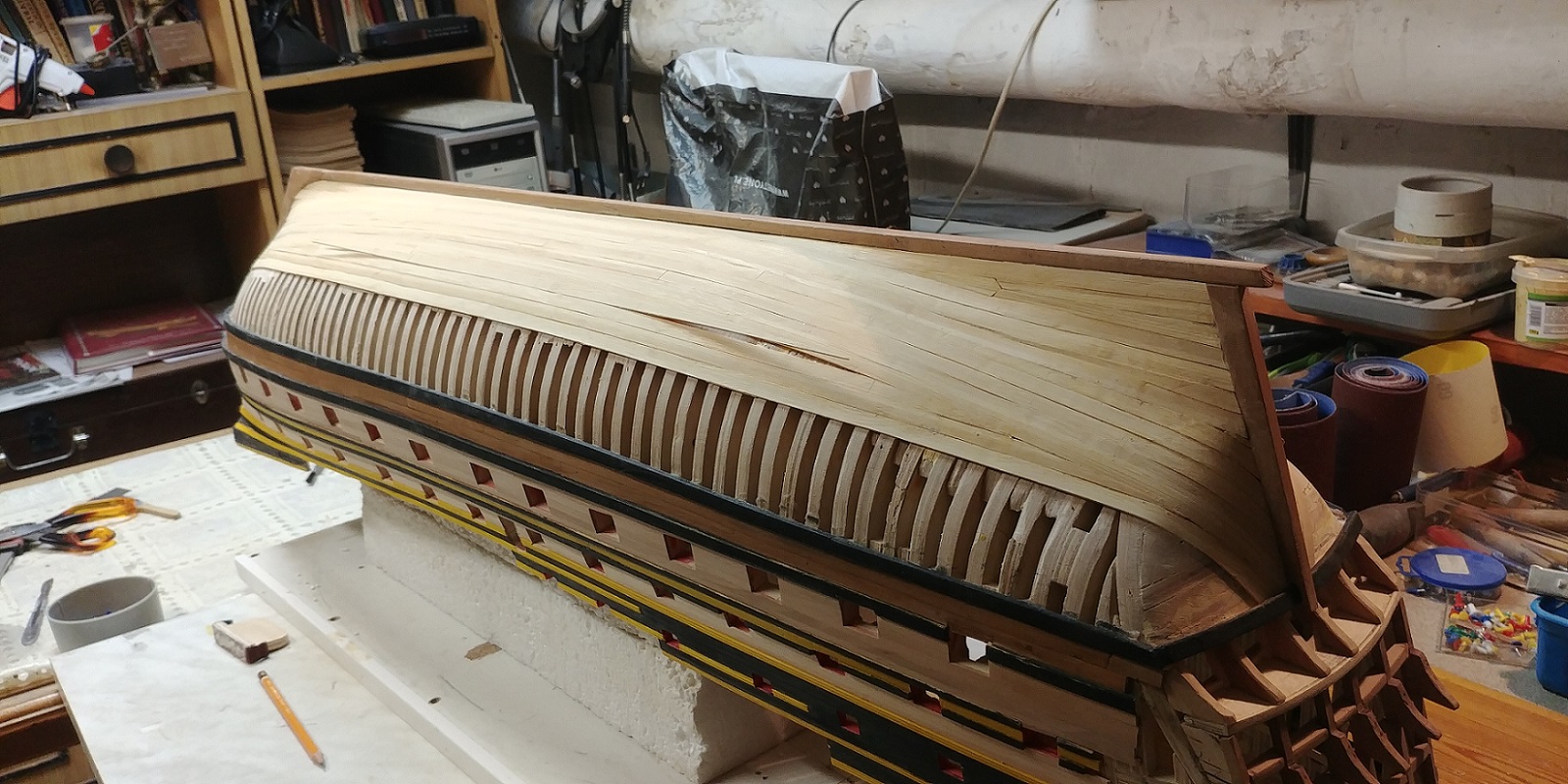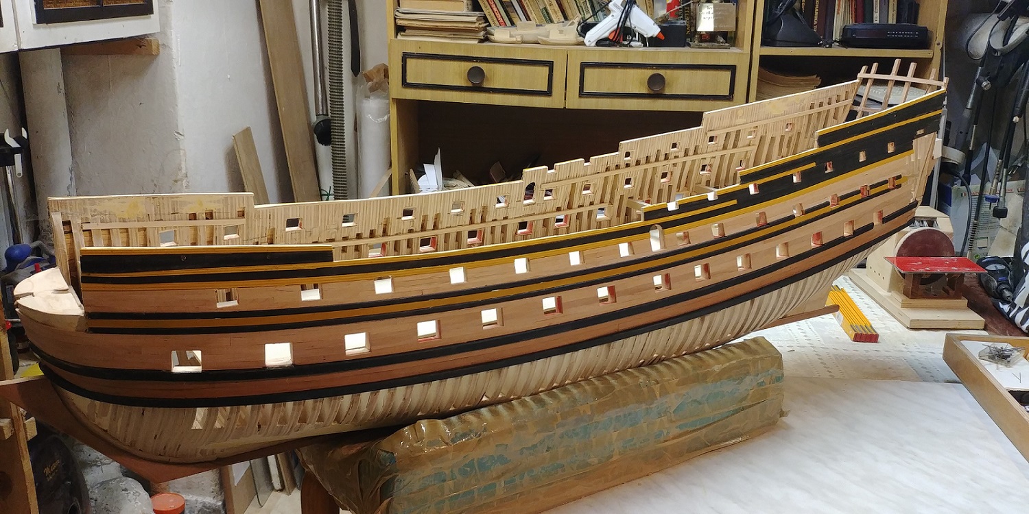 Wyprowadziłem poszycie burt.Tak to teraz wygląda.To była pestka,gorzej będzie z poszywaniem dołu,szczególnie z wyobleniem rufowym.Pozdrawiam.K.