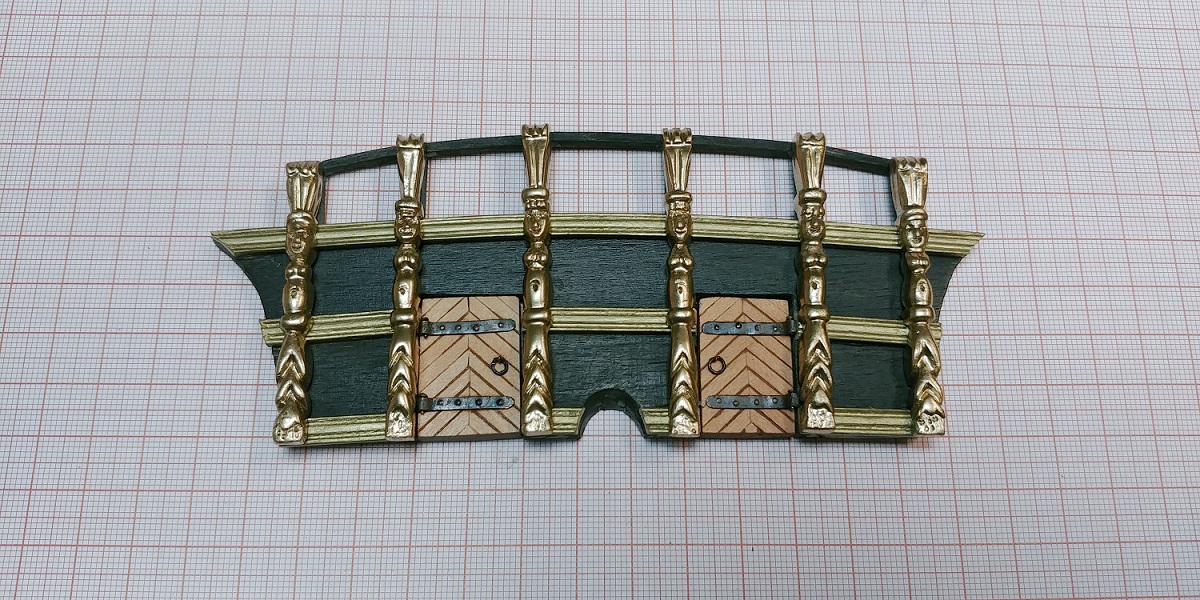 Główny pokład z gretingami już przyklejony.Przy okazji dorobiłem ster i kluzy.