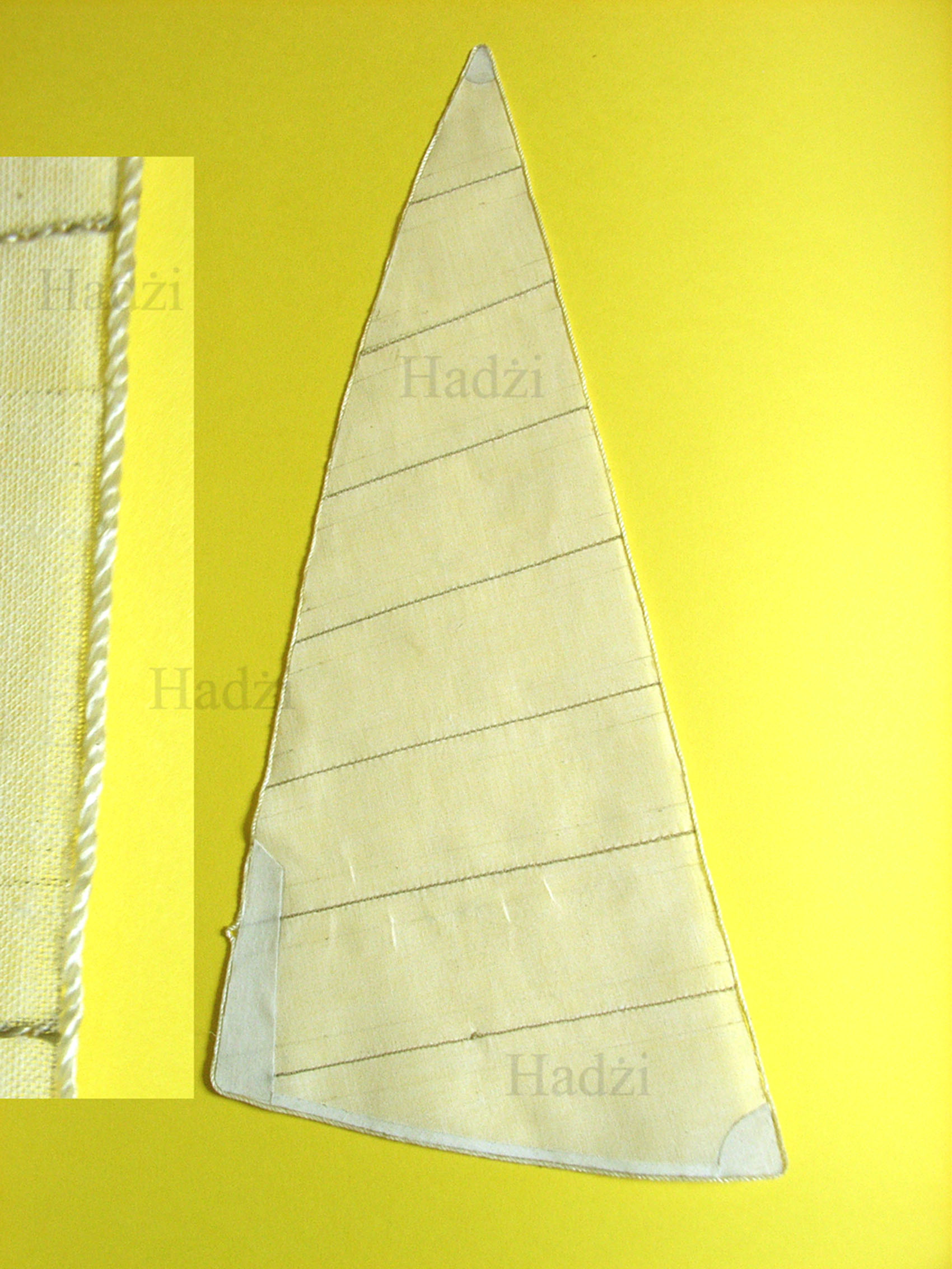 Ja na żagle zakupiłem materiał Batyst w kolorze ecru [ekri] i nie będzie niczym barwiony. Barwienie czysto białego materiału w herbacie jest od dawna znane modelarzom. Batyst jest jednym z najcieńszych materiałów. Cieńszym, a właściwie mniej gęstszym materiałem od Batystu jest Etamina. Do usztywniania materiału stosuję usztywniaczy dostępnych w handlu. Są to usztywniacze odwracalne. Usztywnienie klejowe mam zamiar zastosować w fazie końcowej, podczas kształtowania wybrzuszeń. Rysowanie brytów ołówkiem jest uproszczeniem. Podczas przeszywania materiał się marszczy gdy stopka maszyny wywiera zbyt duży nacisk na transporter. Nie mam problemu z szyciem tylko z utrzymaniem równej linii szycia. W krawiectwie , to nie jest problem, ale modelarstwie tak. U mnie grotżagiel ma usztywnienia wszystkich lików i rogów. Usztywnienia będą miały 2 mm szerokości i będą obustronnie klejone klejem do tkanin.