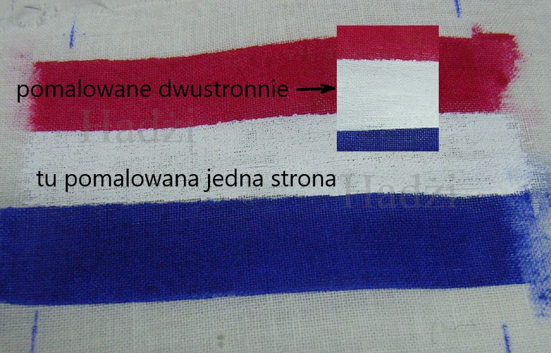 Najmniejsze opakowanie, to 50ml. Na moją flagę wykorzystałem max. 1ml każdej z trzech. No cóż może jeszcze je do czegoś wykorzystam. Na flagę wykorzystałem ten sam materiał jak i na żagle, czyli batyst. Cieńszy od niego jest tylko szyfon, tiul, ale nie mam. Nie wiem też jak by się zamalowywał. Do maskowania pasów najpierw użyłem taśmy malarskiej. Okazało się, że dokładnie nie przylega do materiału i farba podcieka. Zastosowałem, więc taśmę dwustronnie klejąca i zdała egzamin. Pasy barwne malowane są dwustronnie. Efekt przedstawiam na poniższych zdjęciach.