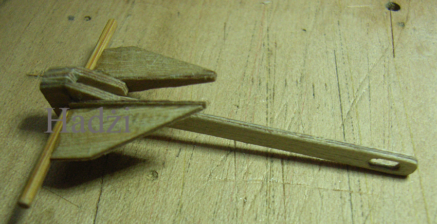 Kotwice wykonane. Danfortha wykonana jest z sklejki lotniczej gr. 1mm trzon i jarzmo. Łapy z gr. 0,8 i 0,4 . Długość jarzma i trzonu, to 39 mm. Szerokość, to 28 mm, długość łapy, to 15 mm.