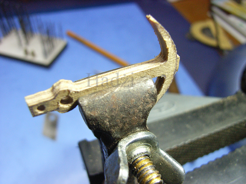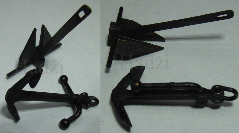 Kotwica admiralicji też jest wykonana ze sklejki lotniczej gr. 3 mm. Po wycięciu zgrubnym wypiłowana i wyprofilowana iglakami. Z początku próbowałem wykonać je z litego drewna: z lipy, topoli, gruszy, ale podczas obróbki się rozłamywały. Dlatego zdecydowałem się na wykorzystanie sklejki. Danfortha powinna być pomalowana na szaro, ale jest pomalowana na czarno tak jak i admiralicji (na jedna kotwicę nie będę kupował puszki farby). Zdjęcia poniżej.