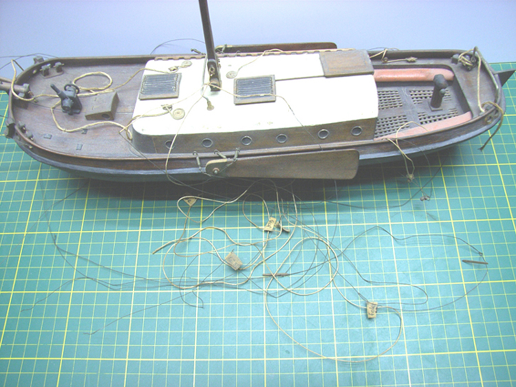 Zdezelowany model został dokurzony, do myty na ile się dało i ponownie pomalowany lakierem mat. Tylko dach nadbudówki nie będzie malowany, pozostanie taki jak jest. Linki ruchome będą też tylko częściowo wymienione. Niektóre linki stalowe [cantalowe] musiałem sztukować. Cantal jest kruchy i przy próbie zawinięcia na oczku potrafi się ukruszyć. Takie problemy miałem też przy tali jednego z baksztagów. W tamtych czasach jak był model budowany nie było takiej palety klejów jak dzisiaj. Dostępny był oprócz kleju roślinnego klej rybi i nitrocelulozowy AK20. Po tylu latach odklejają się niektóre okucia. Maszt przed montowaniem pierwszych linek wzmocniłem tymczasowymi łupkami, które finalnie będą zdjęte. Jako pierwsze linki zostały zamontowane baksztagi i sztagi sztaksli. Zdjęcia poniżej: