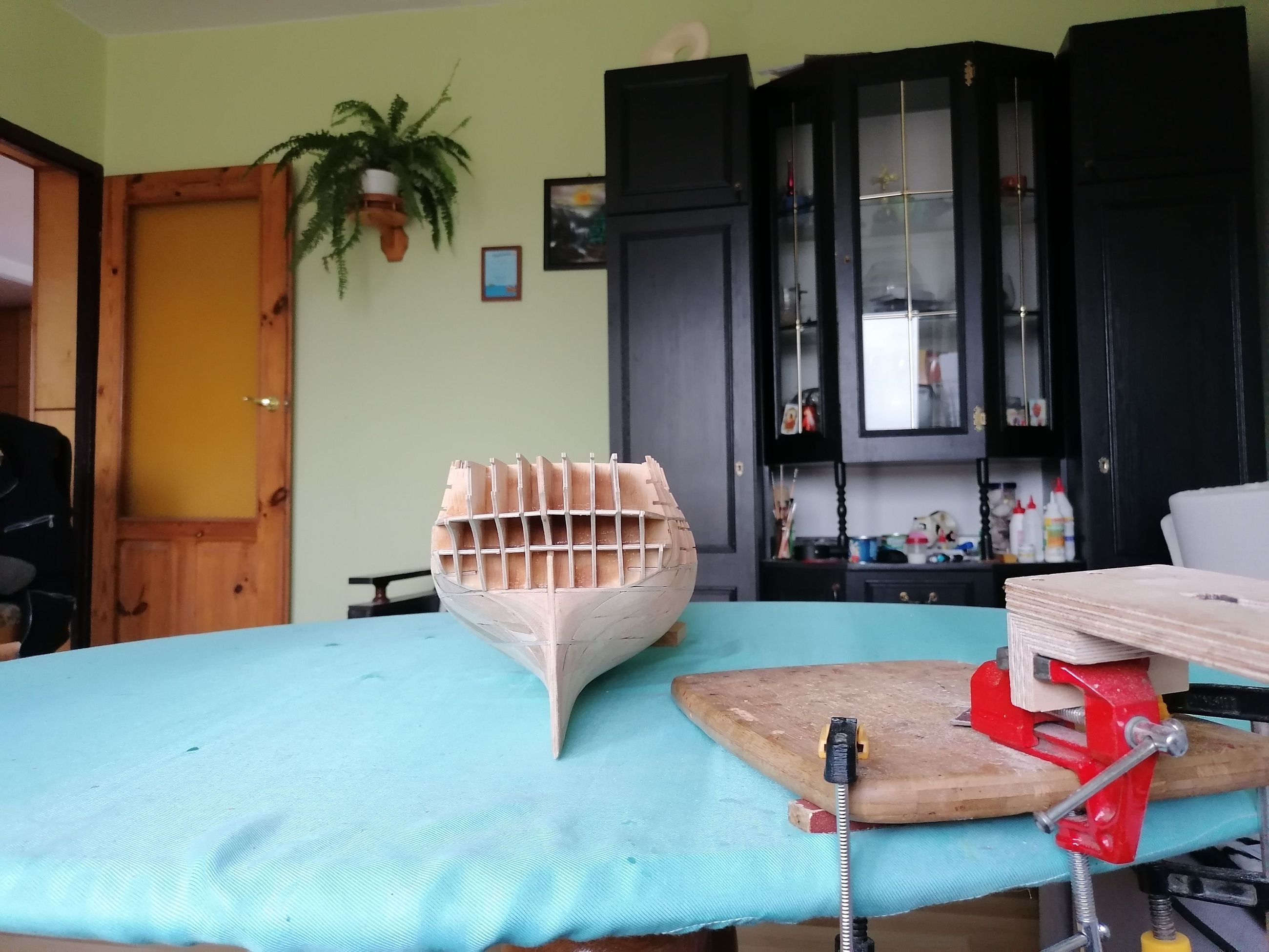 Po sklejeniu szkieletu zacząłem wypełniać listewkami olchy przestrzenie między wręgami. Używam kleju rakoll GLX-3. (jest super).Najgorsza była rufa z dziobem poszło już łatwiej. Wypełnianie kadłuba i jego szlifowanie to najgorsza robota przy budowie modelu. Zapyliłem całą modelarnię.