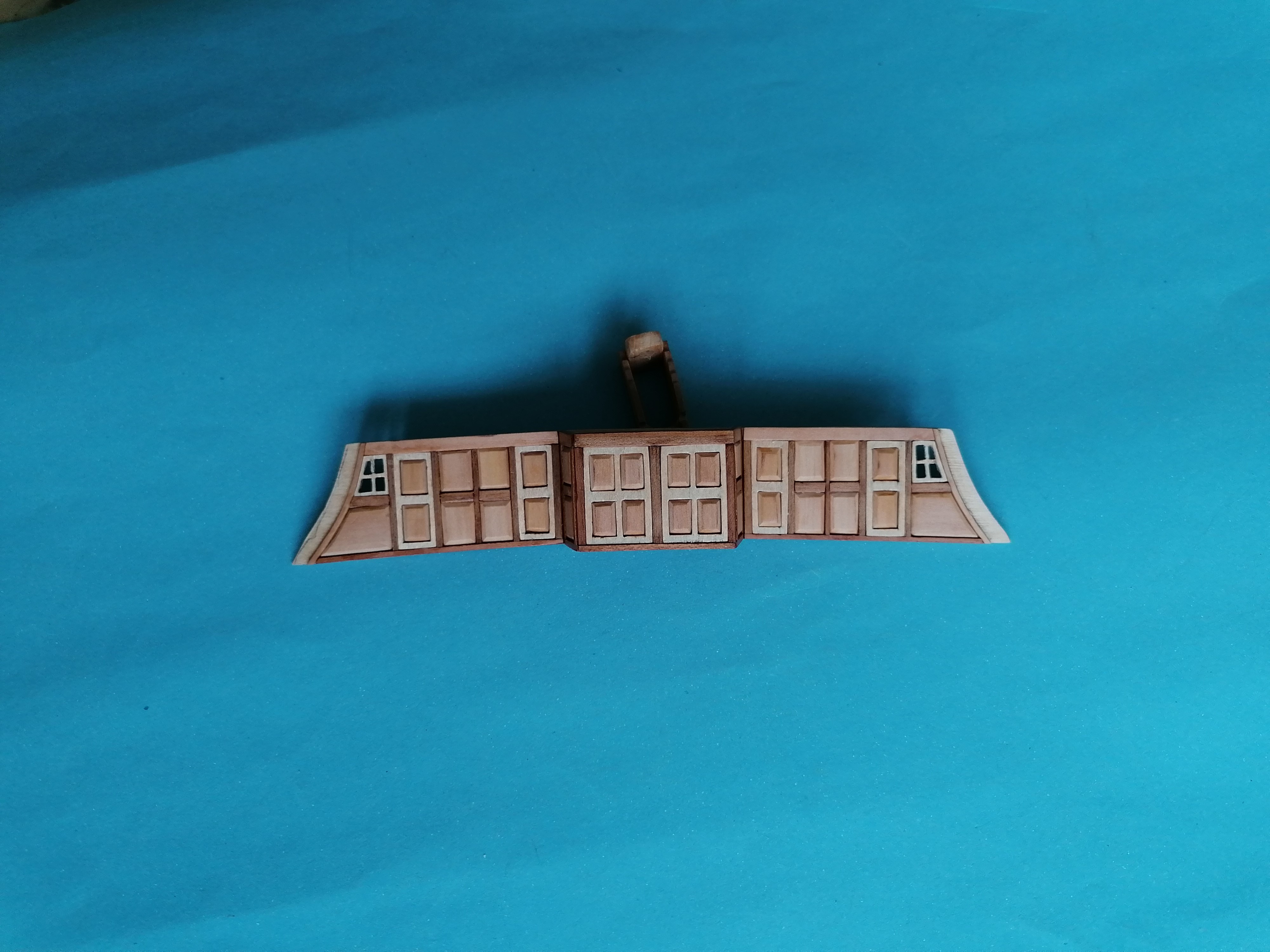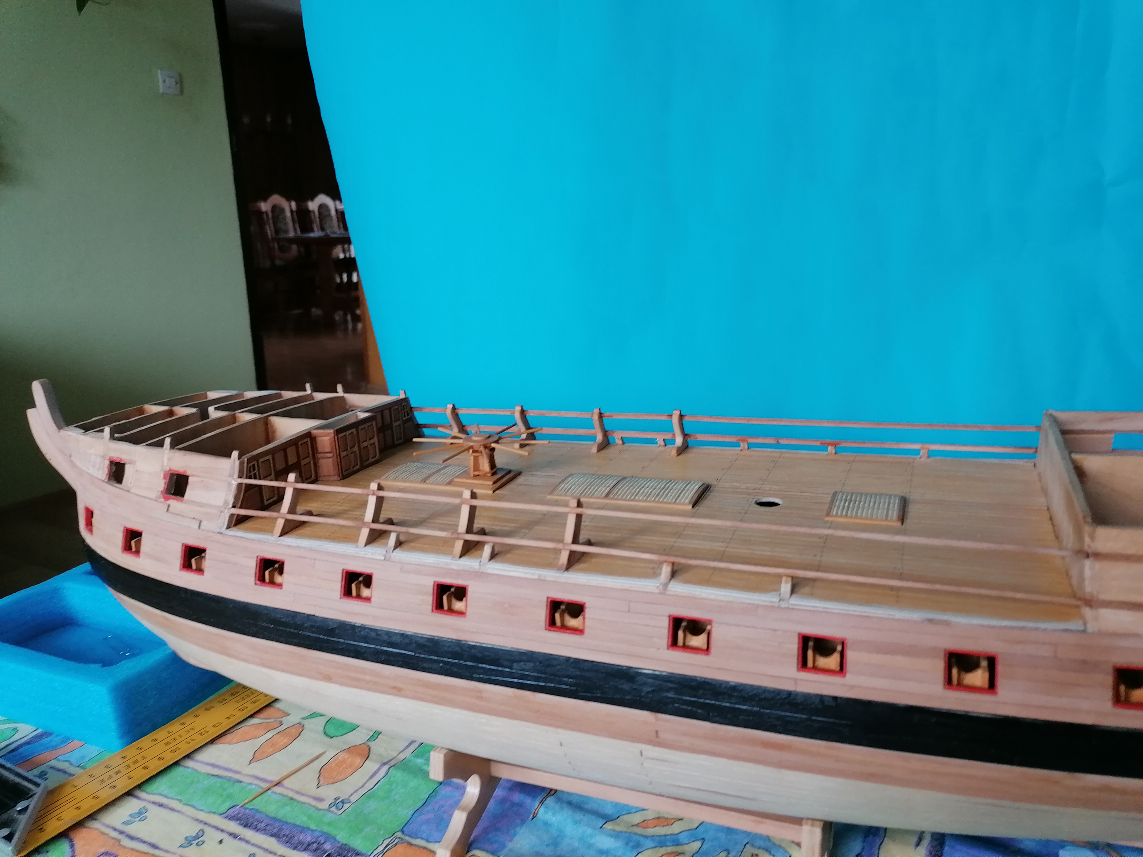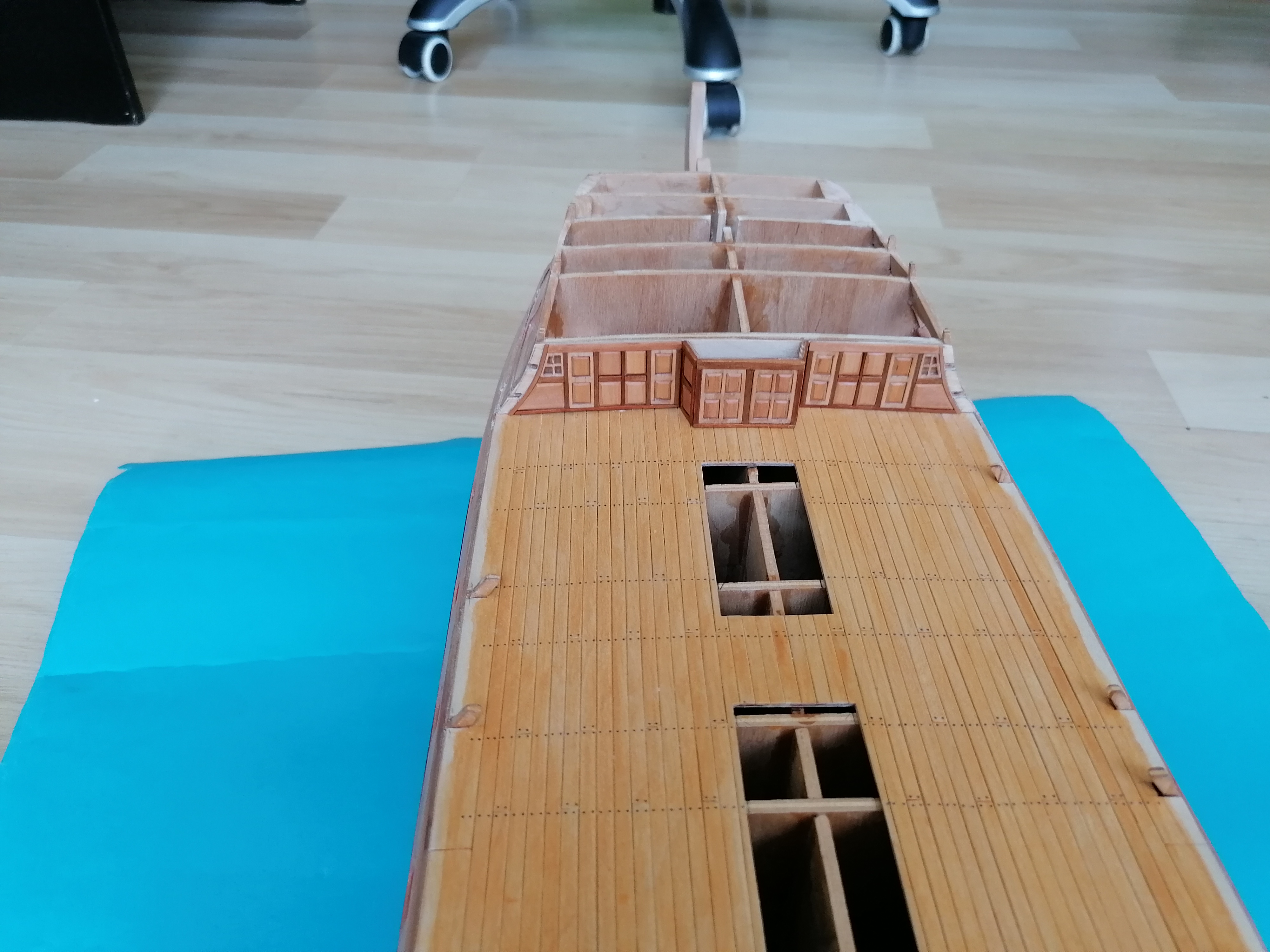 Zaczynam dłubanie na pokładzie śródokręcia. Przykleiłem planki mają szerokość około 3,5mm i około 0,8mm grubości. Następnie zabrałem się za ściankę znajdującą się na dziobie pokładu środkowego. Nakleiłem zeskanowane uprzednio kartki na brystol i wyciąłem takie szablony. Wyciąłem ze sklejki 1 mm taką podstawę ścianki, wycinam i wstępnie szlifuję pierwsze listewki ramek i naklejam na podstawkę. Ramki wypełniłem takimi „kasetonami” i wstawiłem dwa „okienka”. Jeszcze kilka godzin wycinania i szlifowania i skleiłem razem całą ściankę. Całą ściankę przeszlifowałem i po telefonicznej korepetycji od Kazka na temat malowania pokostem, pomalowałem wszystko pokostem lnianym. Ścianka na sucho przyłożona do pokładu. Wykonanie tej ścianki zajęło mi ponad dwadzieścia godzin. Najwięcej było szlifowania. Myślę, że wykonanie takiej ścianki w skali 1:1 przy pomocy maszyn zajęło by mi o wiele mniej czasu.