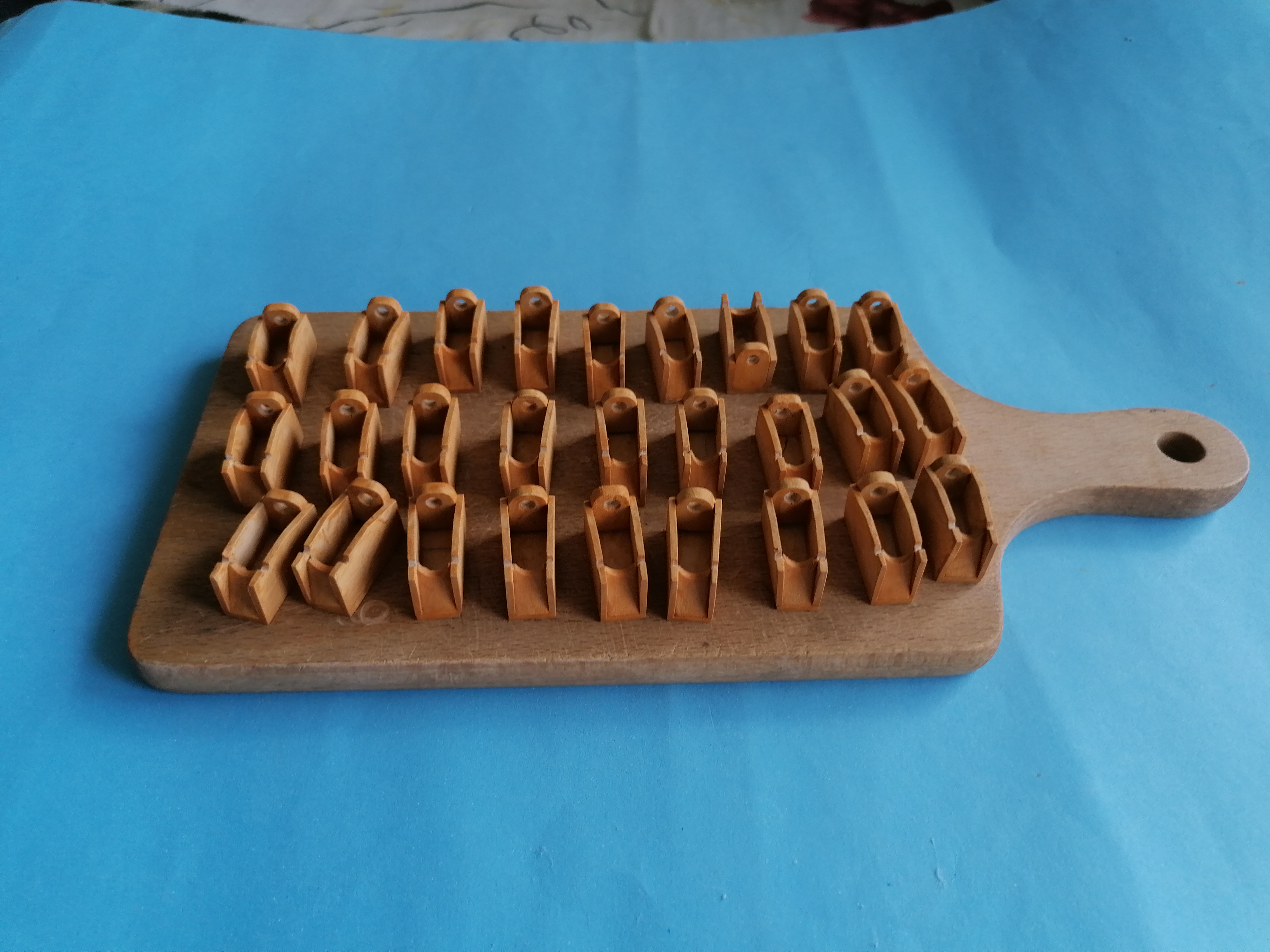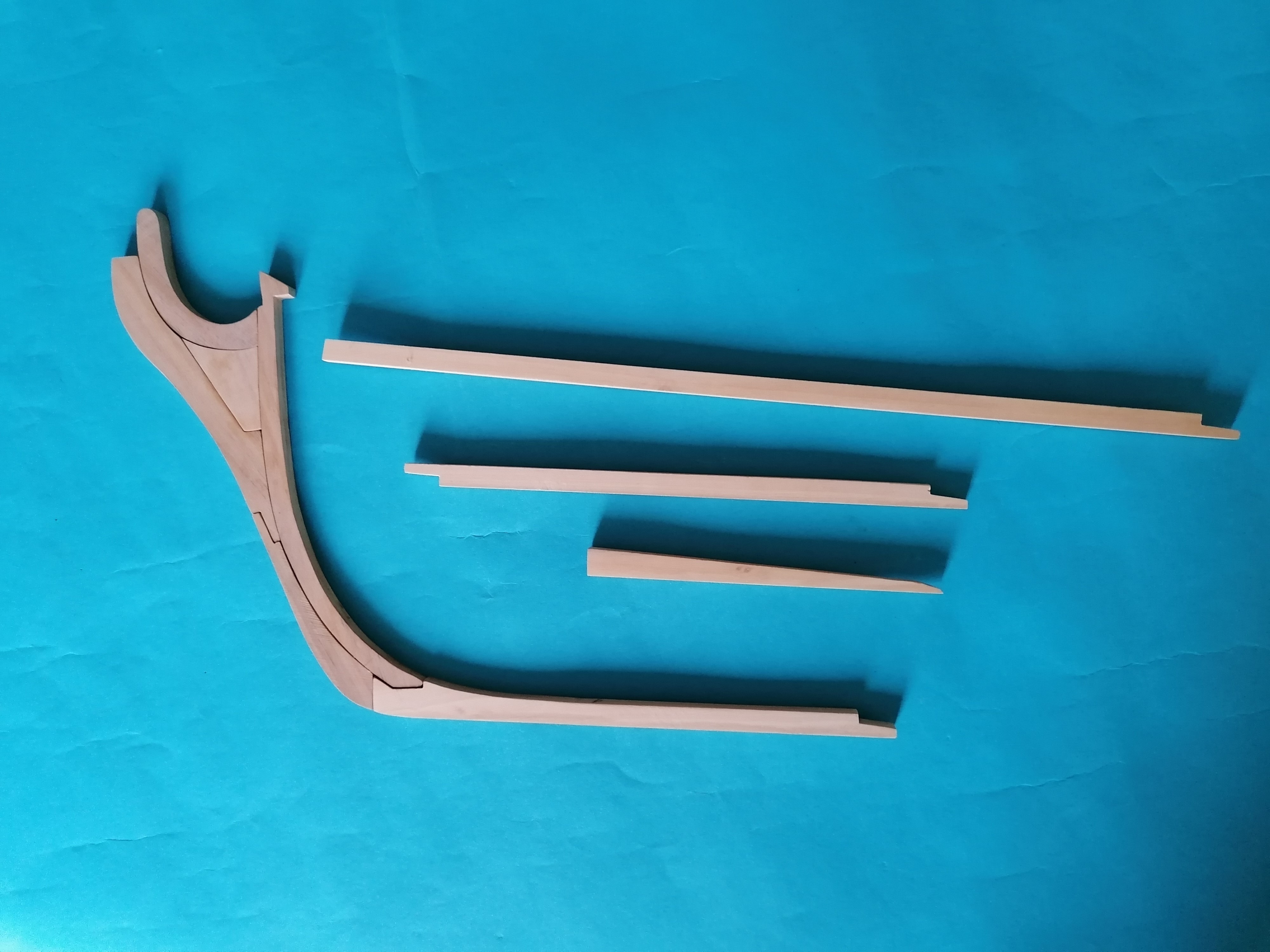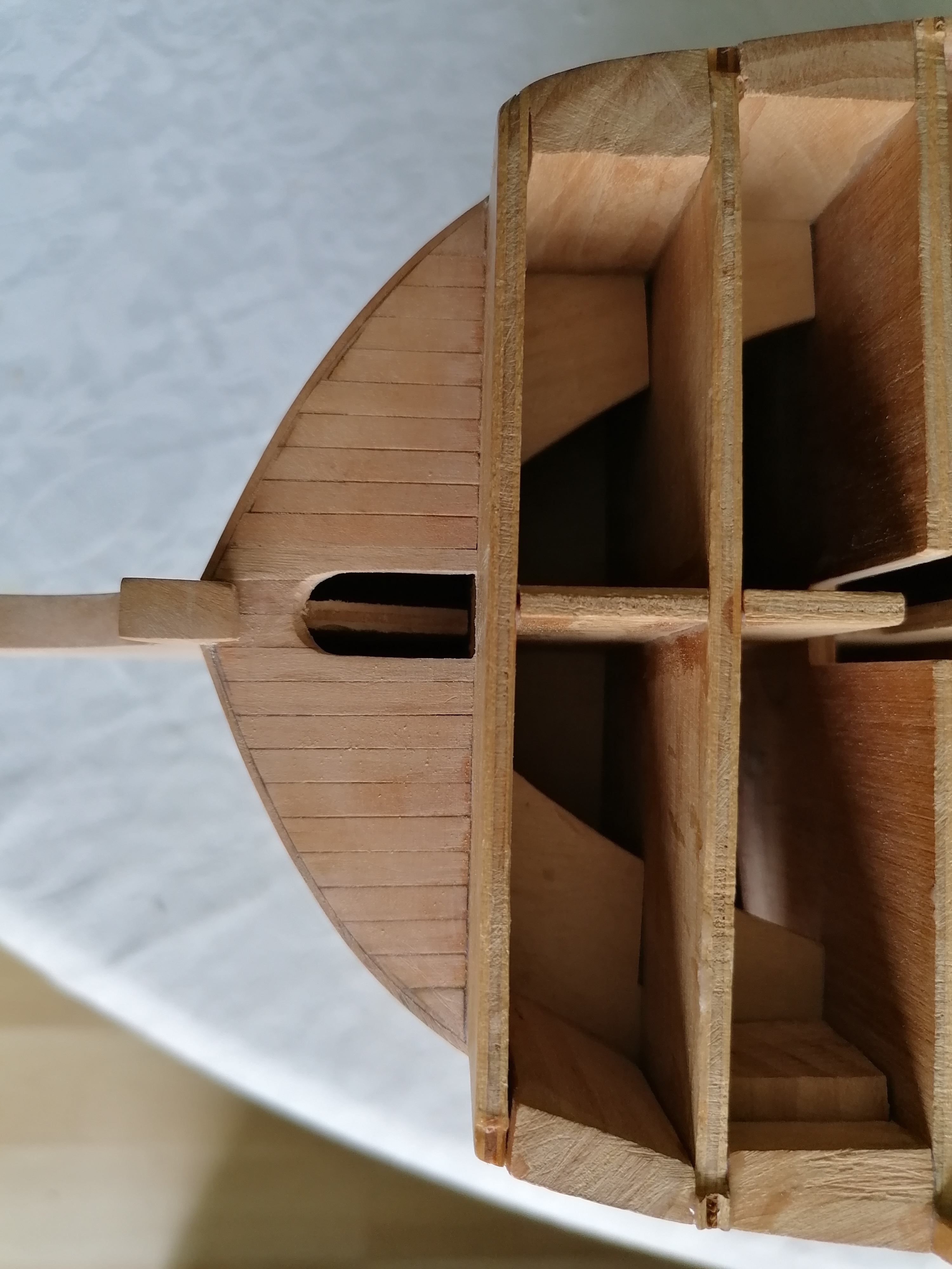 Zaczynam dłubanie na pokładzie śródokręcia. Przykleiłem planki mają szerokość około 3,5mm i około 0,8mm grubości. Następnie zabrałem się za ściankę znajdującą się na dziobie pokładu środkowego. Nakleiłem zeskanowane uprzednio kartki na brystol i wyciąłem takie szablony. Wyciąłem ze sklejki 1 mm taką podstawę ścianki, wycinam i wstępnie szlifuję pierwsze listewki ramek i naklejam na podstawkę. Ramki wypełniłem takimi „kasetonami” i wstawiłem dwa „okienka”. Jeszcze kilka godzin wycinania i szlifowania i skleiłem razem całą ściankę. Całą ściankę przeszlifowałem i po telefonicznej korepetycji od Kazka na temat malowania pokostem, pomalowałem wszystko pokostem lnianym. Ścianka na sucho przyłożona do pokładu. Wykonanie tej ścianki zajęło mi ponad dwadzieścia godzin. Najwięcej było szlifowania. Myślę, że wykonanie takiej ścianki w skali 1:1 przy pomocy maszyn zajęło by mi o wiele mniej czasu.