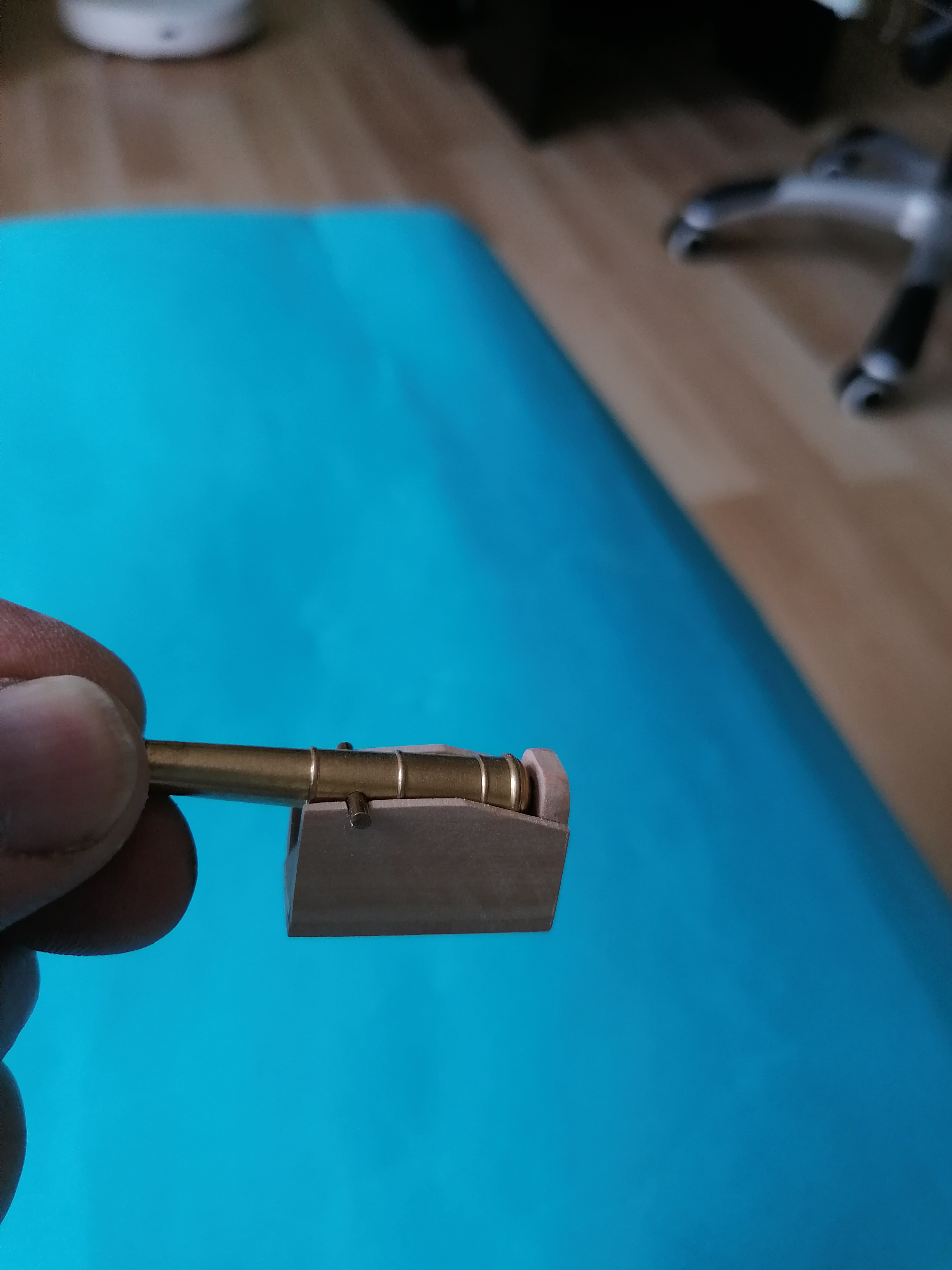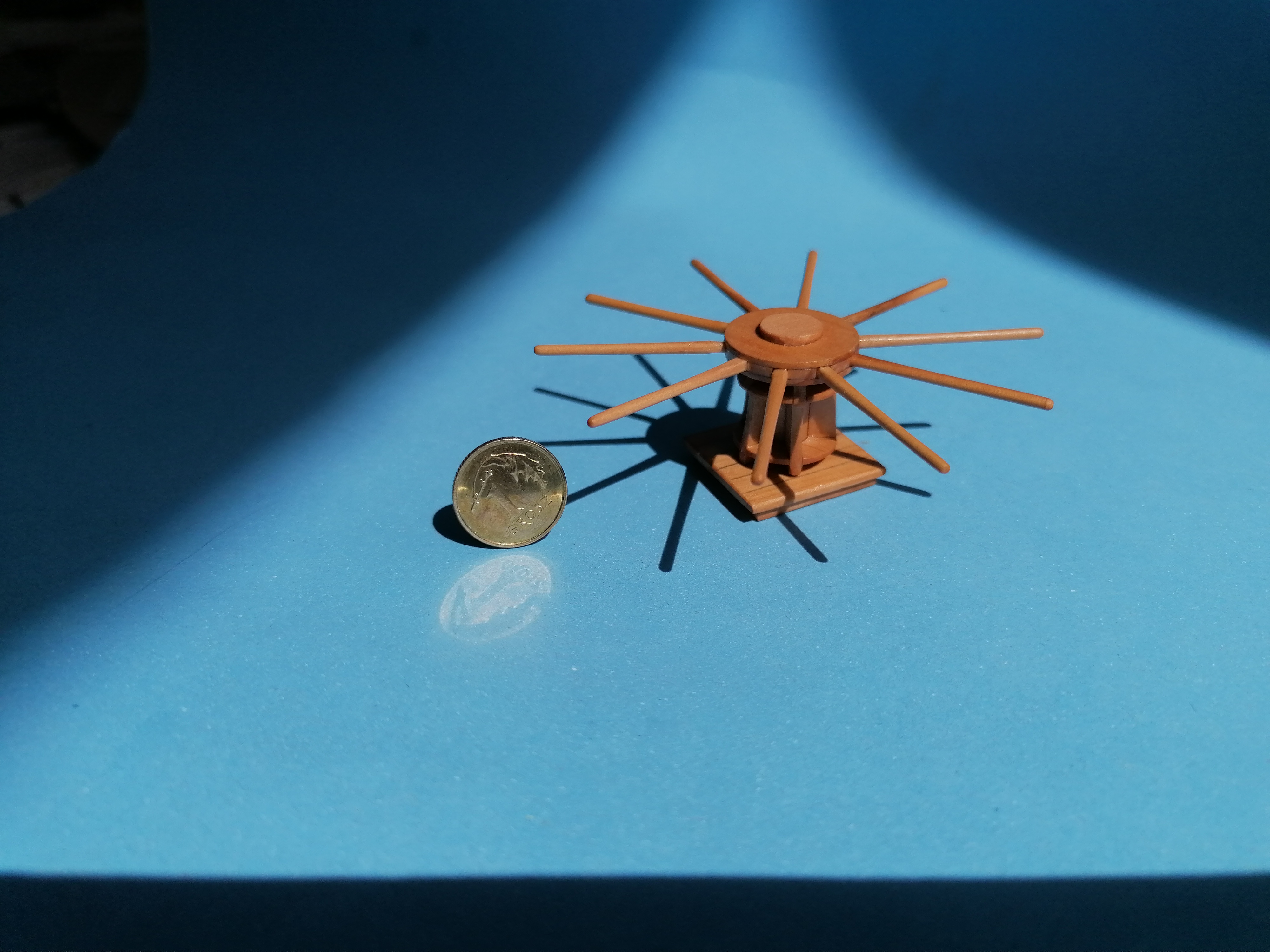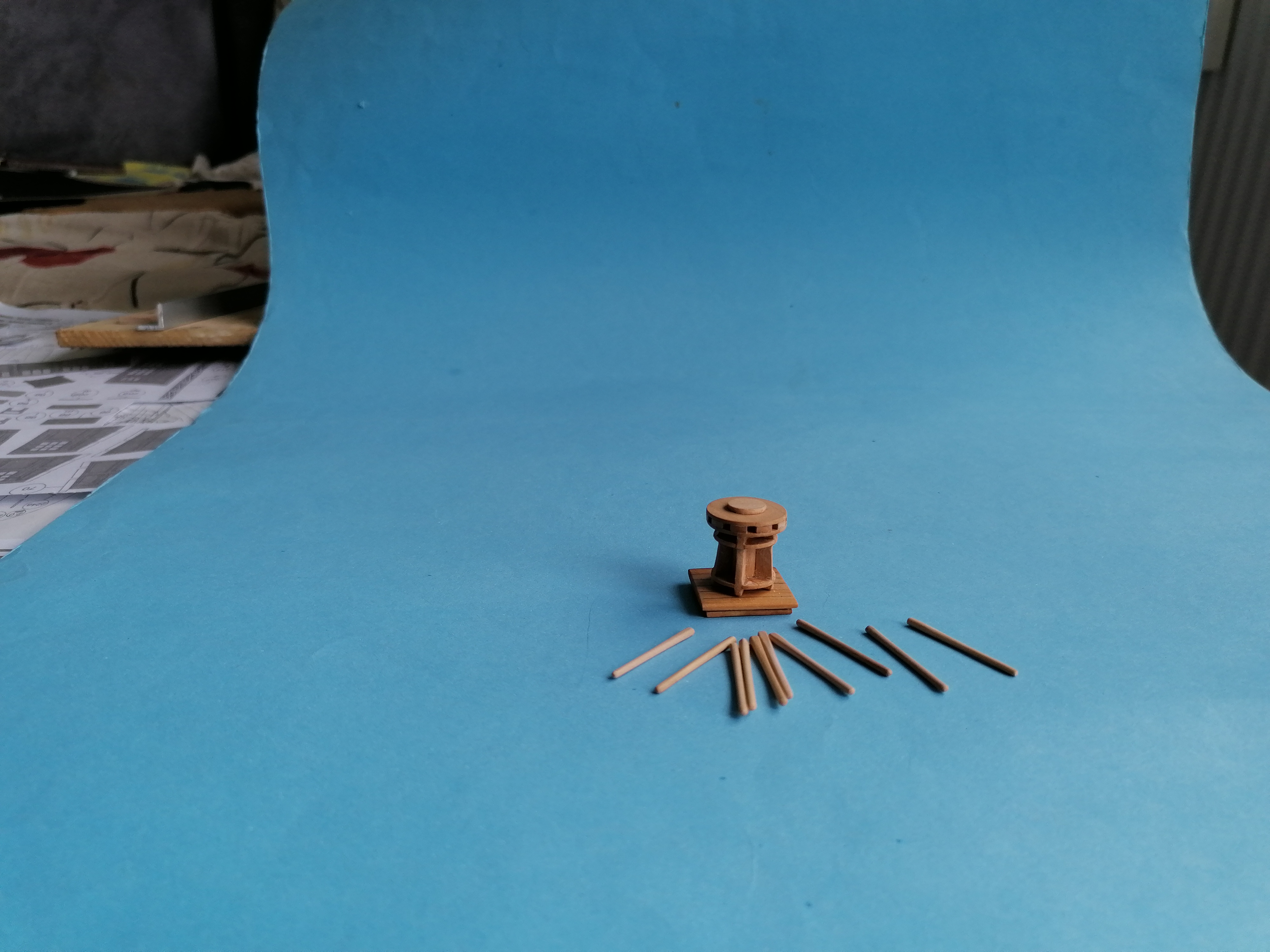Jak już jestem przy gretingach na śródokręciu to zrobiłem kabestan. Wszystkie części wyciąłem z listewek gruszy. Dalej jestem pełen podziwu dla wszystkich modelarzy, którzy wykonują takie detale. Mój kabestan wcale nie jest taki malutki a mimo to sklejałem go pod lupą.