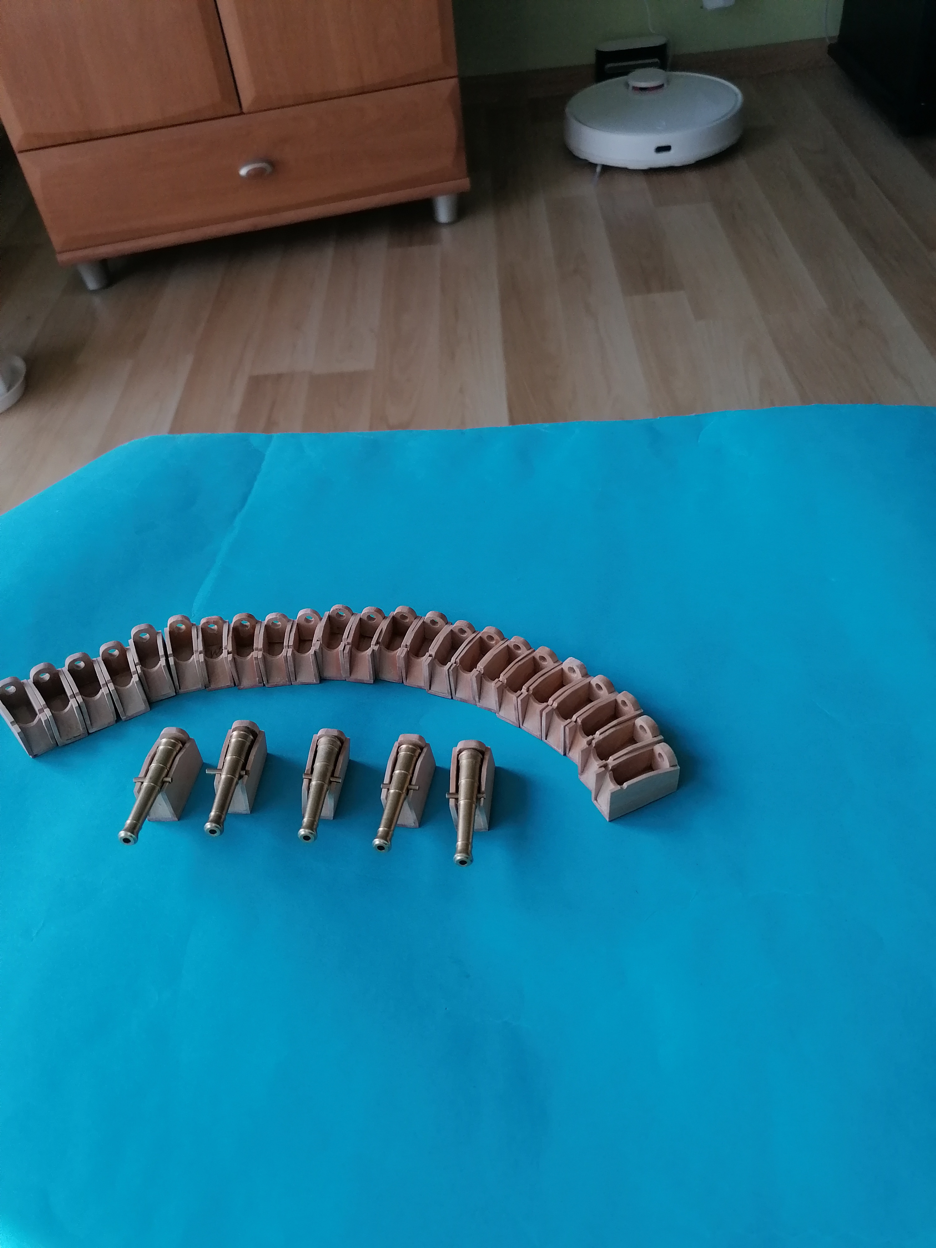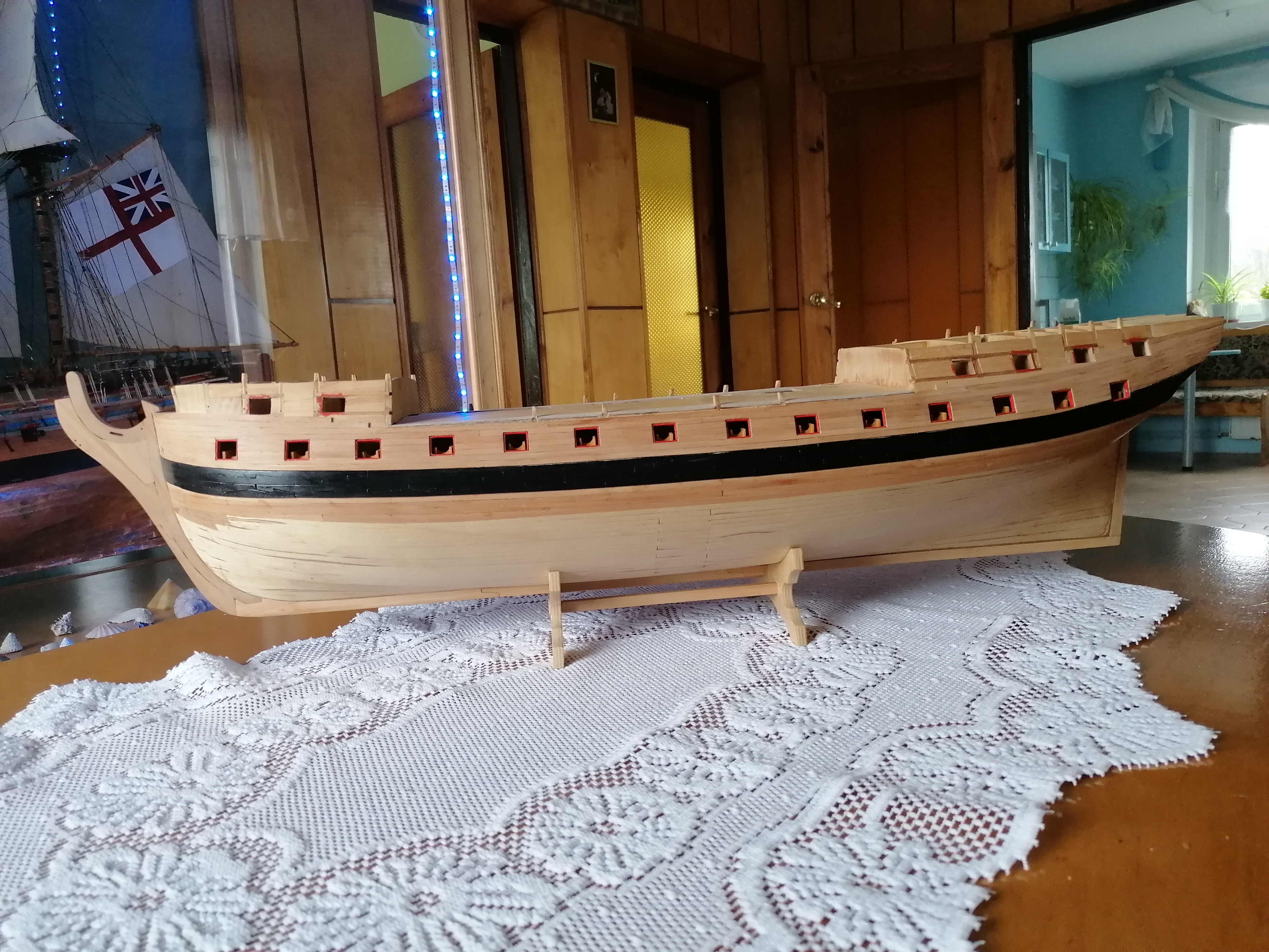 Na początek zrobiłem podstawkę pod model. Według wycinanki miała by wyglądać tak. Nie podobała mi się więc ją nieco przerobiłem. Myślę, że teraz wygląda ciut lepiej. Kadłub „siedzi” w niej dosyć stabilnie. Następnie zabrałem się za uproszczone lawety, a właściwie to takie skrzynki, które będą zamontowane pod pokładem. Jako, że przez otwór strzelniczy widać tylko czoło lawety to z tyłu „lawety” zamontowałem takie ustrojstwo, w którym lufa armaty ma dodatkowe oparcie. Chcę mieć pewność, że później lufy nie będą mi wypadały z modelu. Lufa nawet włożona na sucho dobrze „siedzi” na swoim miejscu. Zrobiłem 28 takich lawet. Wycinałem je s listewek gruszy o grubości 1,5 mm Zabejcowane bejcą w kolorze pinii Luf nie chciało mi się toczyć. Zakupiłem za 3 i pół stówy 74 lufy w Modelnecie Tyle widać po wklejeniu lawet do modelu.Luf na razie nie wklejam, żeby mi nie przeszkadzały w dalszej pracy. No i oczywiście muszę je przed wklejeniem poczernić. Na razie tyle.